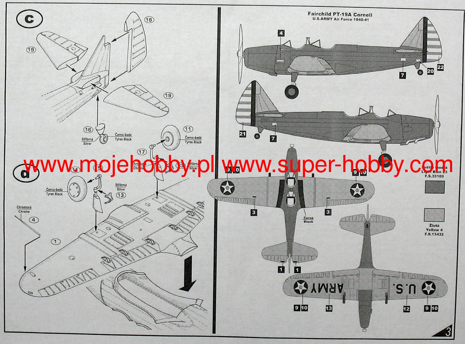 The Fairchild PT-19 is an American single-engine low-wing mixed construction training aircraft. The flight of the prototype took place on May 15, 1939. A year later, serial production started, which lasted until 1945 and resulted in the production of over 6,300 copies. The main unit used as a power unit was the Fairchild Ranger L-440-3 engine with a capacity of 200 HP. Several versions of the aircraft were created (PT-19, PT-19A, PT-19B and PT-23S), which, however, mainly differed from each other in the engines used. The Fairchild PT-19 turned out to be a very successful aircraft. It quickly became one of the staple training machines in the USAAC, RAF and RCAF. The aircraft was also widely exported to Latin American countries. Technical data (PT-19A version): length: 8.53m, wingspan: 10.97m, height: 3.2m, maximum speed: 212km / h, climb speed: 2.86m / s, practical ceiling: 4700m, range maximum: 644 km, armament: permanent-no.
