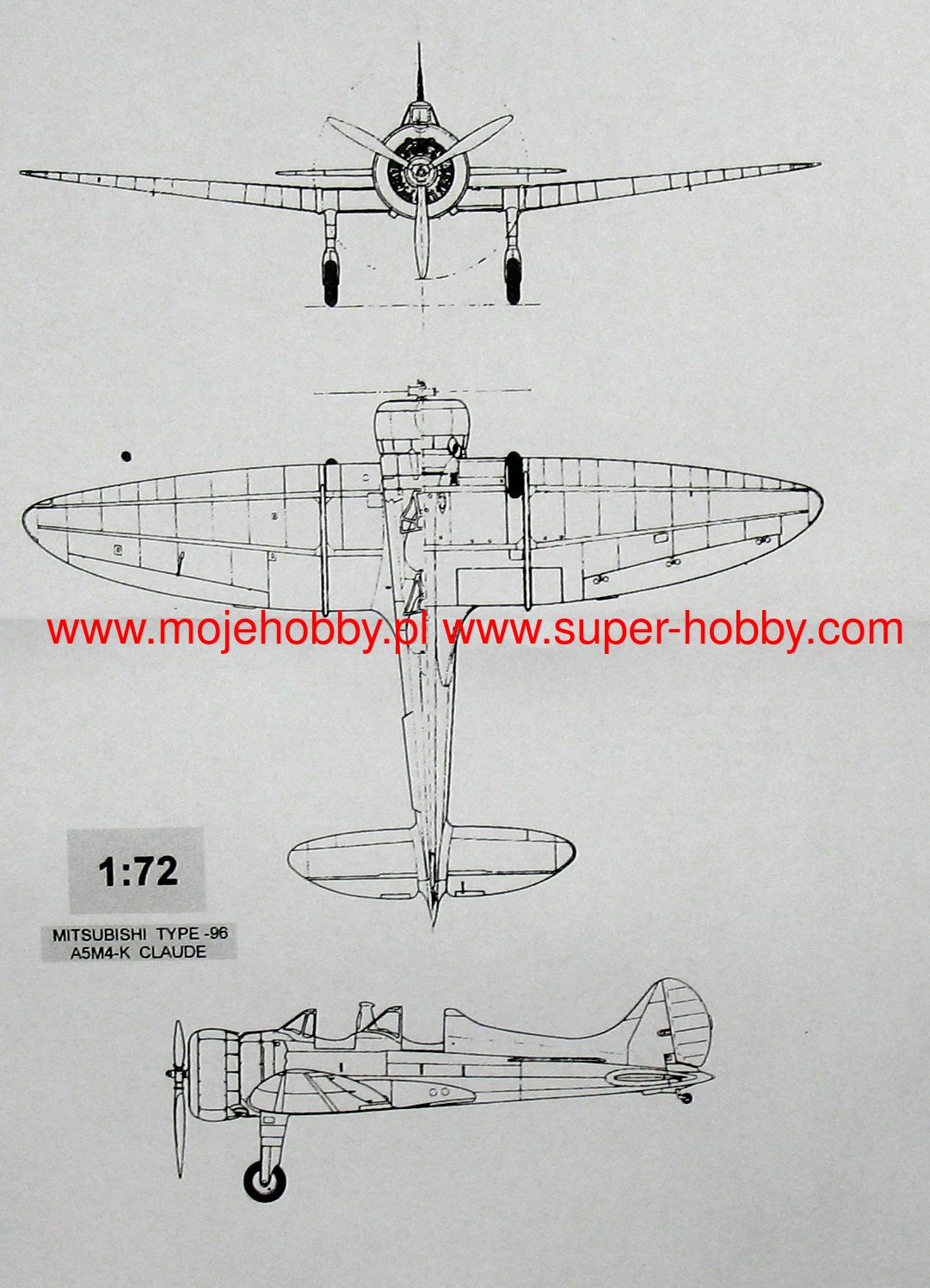 The Mitsubishi M5A is a Japanese, single-engine fighter with a low wing structure and a metal structure from the Second World War. It was the first monoplane fighter of the Imperial Navy. In the early 1930s, the command of the Japanese Navy undertook a program of basing the development of naval aviation on its own designs. The tactical and technical requirements for an on-board fighter, announced in 1932, did not work, so two years later, new, improved requirements were issued, according to which the new fighter was to have a maximum speed of not less than 350 km / h and a climb time at 3000 m not longer than 6 min. 30 sec. The span and length could not exceed 11.0 and 8.0 m, due to the dimensions of the carriers on aircraft carriers. The team led by Eng. Jiro Horikoshi at Mitsubishi plants developed the Ka-14 project. The flight of the prototype with the Nakajima Kotobuki 5 engine (551KM) and the W-shaped airfoil (seen from the front) took place in February 1935. It turned out that it exceeded the requirements set for it too much (e.g. the maximum speed was higher by 100 km / h). The stability was worse and therefore in the next prototype powered by the Kotobuki 3 engine (646HP) the W-shaped airfoil was abandoned. The elliptical contour of the airfoil was retained, however. Despite the fixed landing gear and open cabin, the aerodynamics of the aircraft were carefully developed, and the system of the cantilever low-wing aircraft was a revolution in the tradition of biplane on-board fighters. Trials of 6 prototypes were very successful and in 1936 the plane was put into production with the Nakajima Kotobuki 2 Kai 1 (581KM) engine as a Navy Type 96, Model 1, A5M1 fighter. Serial aircraft entered service in 1937 and soon took part in the Japanese-Chinese conflict. Thanks to this, the Japanese achieved a decisive advantage in the air, which increased even more after the introduction of the improved A5M2a model with the Kotobuki 2 Kai3A engine. Soon, the A5M2b model was put into production, which temporarily had a covered crew cabin, which, however, did not suit the Japanese fighter pilots. The most produced variant was the A5M4 with the Kotobuki 41 engine with a take-off power of 714KM and 789KM at an altitude of 3000 m and an additional external fuel tank with a capacity of 160 dm3. The Model 3, with the Hispano Suiza 12Xers in-line engine, was not mass-produced. In total, approximately 1,000 A5M aircraft were produced, including approximately 800 at the parent plant. In 1941, these planes began to be gradually moved to the second line. They were not reused until the end of the war as Kamikaze. In 1943, a two-seater training version appeared, designated A5M4-K (103 copies). The plane bore the designation Claude in the Allied code, although the first prototype was assigned the designation Sandy, unaware that it was just a prototype. Technical data (A5M4 version): length: 7.55m, wingspan: 11m, height: 3.2m, maximum speed: 440km / h, maximum range: 1200km, maximum ceiling 9800m, armament: fixed - 2 machine guns Type 97 cal .7.7mm.