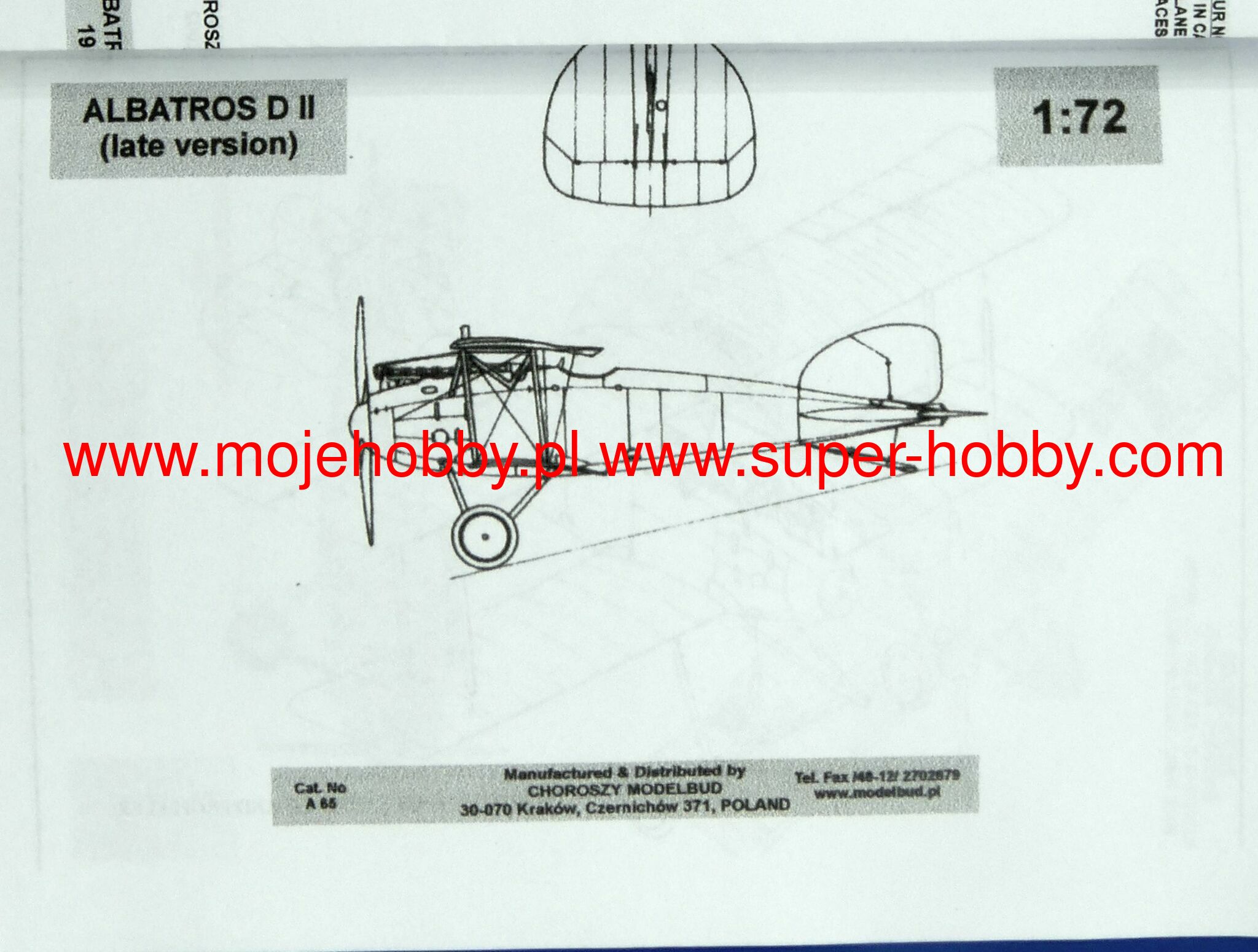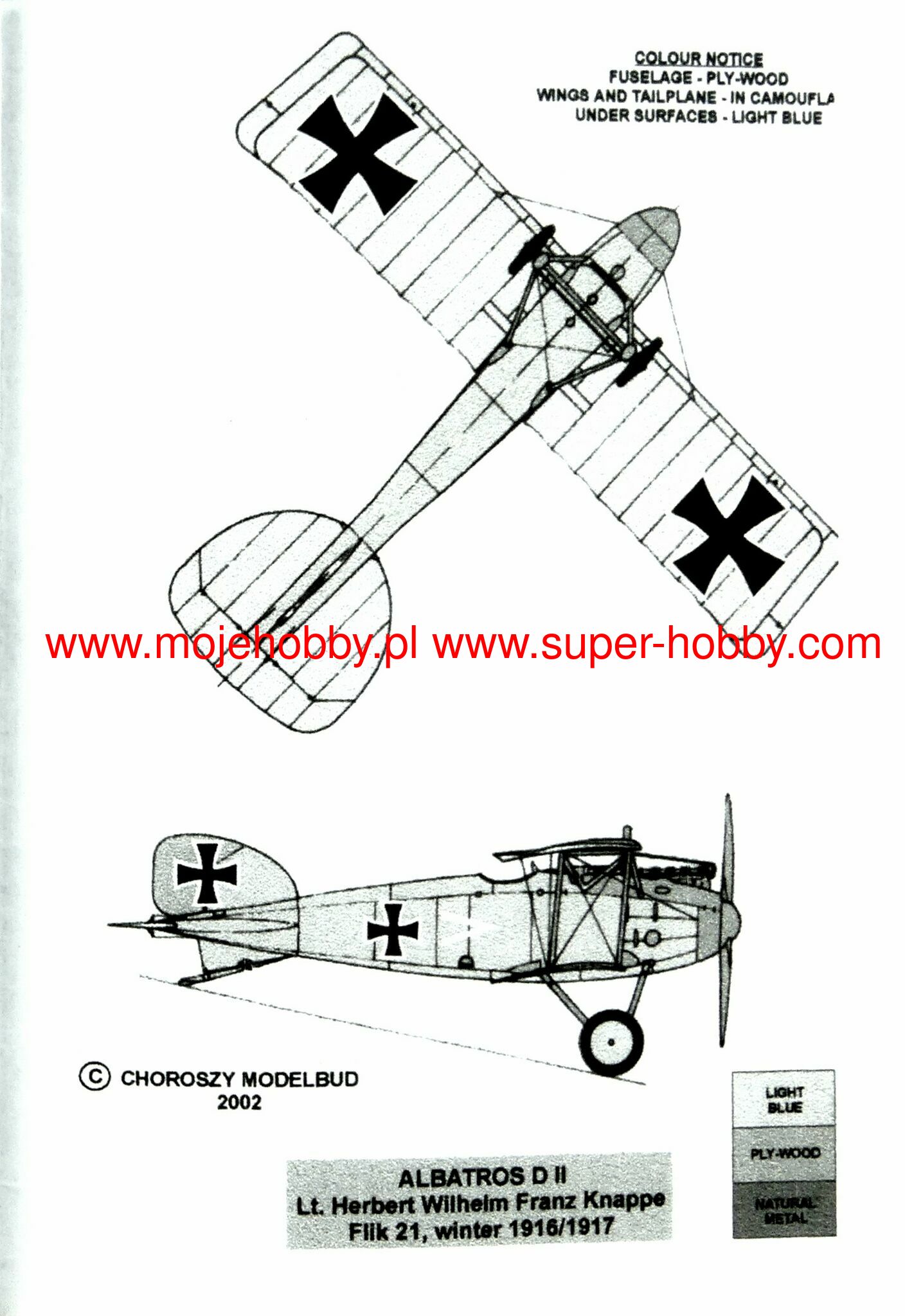 Albatros D.II was a development version of the Albatros DI aircraft.This model differed from the predecessor by 30 cm lower with the upper lobe and the replacement of the pyramids supporting the lamina from the shape of an inverted V-letter into the outwardly extended N-shaped supports. the front which was blocked by these pyramids. The plane was equipped with the same engine and externally did not differ much from its predecessor. The Albatros D.II planes used on a mass scale quickly regained air superiority for the German army. Oswald Boelcke died on this plane on October 28, 1916. He was hit in formation by one of his pilots. The machine was operational enough to land, but unfortunately Oswald fell into turbulence and crashed. The plane that nudged him managed to land. The Albatros DII was a single-seat fighter biplane with a half-shell fuselage structure with a working plywood sheathing. Rectangular panels of wooden structure, covered with linen. The plane was armed with two 7.92 mm Spandau rifles firing through the propeller circle with a Fokker synchroniser. Approximately 275 units of the Albatros DII were produced. The plane, however, was not as maneuverable as the French Nieuporty. In order to improve the situation in the next model, Albatros D.III, the "Nieuporta chamber" was used - the half-and-a-half system. Technical data: Top speed: 175 km / h; climb speed 3 m / s, maximum ceiling 5200 m.