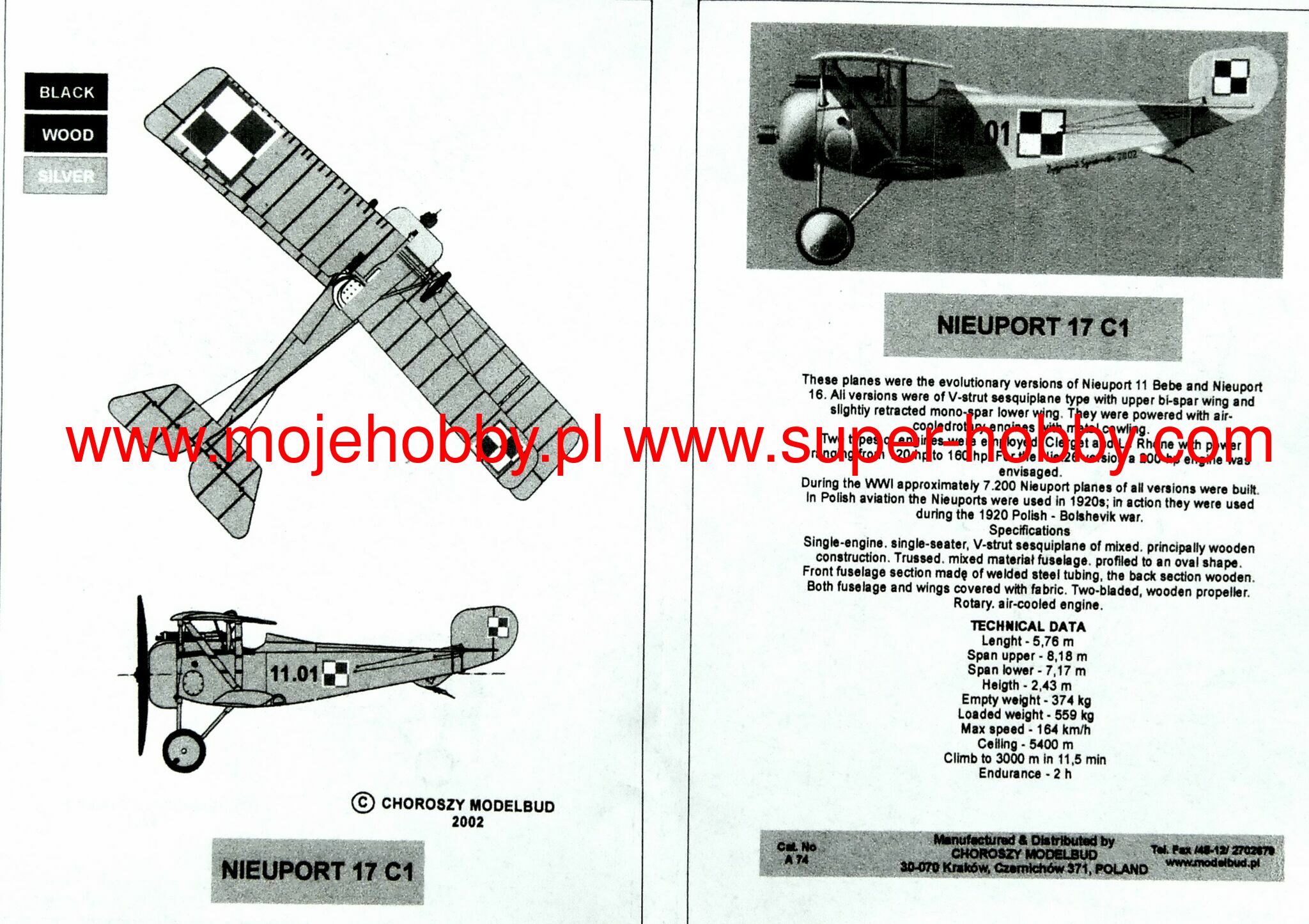 The Nieuport 17 is a French mixed-construction fighter from the First World War. The flight of the prototype took place in January 1916, and the machine entered service two months later. Le Rhone 9J engine with 110 HP was used as the drive. He was the successor of the Nieuport 11 aircraft and had great performance for its time, especially its rate of climb. At the same time, however, due to the delicacy of the structure and low overall strength of the airframe, the plane was difficult to pilot and rather "did not forgive" the pilot's mistakes. It was produced on a large scale and remained the main fighter of the French Army until the end of World War I. Many Allied fighter aces flew on it, including Billy Bishop or Albert Ball. Technical data: length: 5.8 m, wingspan: 8.16 m, height: 2.4 m, maximum speed: 177 km / h, rate of climb: 4.3 m / s, maximum ceiling 5300 m, armament: fixed - 1 Vickers machine gun or Lewis, suspended-to 8 Le Prieur missiles.