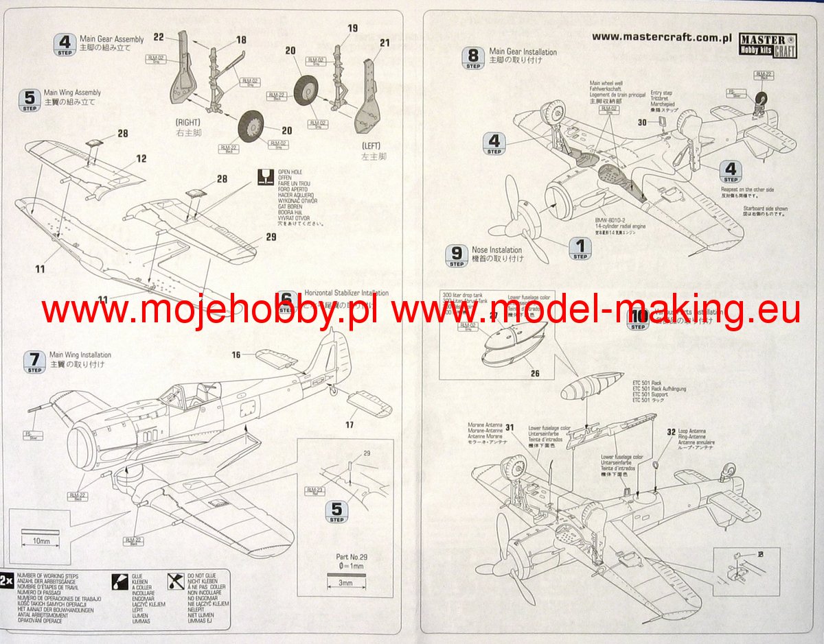 Note: Comany Mistercraft frequently changes, without any notice, the decals that come with the model, so they may differ from the photos and descriptions on our website. If you need a specific version, please let us know about that by entering the appropriate notice in the comments field when placing the order. The Focke-Wulf Fw-190 is a German, single-engine, full-metal fighter aircraft with a covered cabin in the low wing design of the Second World War. The pilots considered the Fw-190 to be a better aircraft than the Messerschmitt Bf-109. A self-supporting low wing with a working Fw-190 coating was commissioned by the Luftfahrtministerium, assembled in the fall of 1937. Kurt Tank submitted two propulsion proposals - the first with a liquid-cooled Daimler-Benz DB 601 engine, and the second with the new BMW 139 radial engine. The latter was chosen, and the work started in the spring of 1938 was headed by Obering R. Blaser. The first prototype of the Fw-190V1 was ready in May 1939, and it was flown in Bremen on June 1, 1939 by Captain Hans Sander. The second prototype, the FW-190V2, armed with two MG131 and two MG17 machine guns - all 7.92 mm caliber, was flew in October 1939. To reduce aerodynamic drag, both were equipped with a tunnel air inlet in the propeller cap, but problems with overheating of the engine resulted in a return to the proven NACA shield design. Before the tests of these prototypes began for good, the decision was already made to replace the BMW 139 engine with a stronger, but longer and heavier BMW 801. It required many changes, strengthening the structure and moving the cabin back, which later became a source of problems with the center of gravity. The advantage was the removal of problems with exhaust gas permeation and overheating of the cabin interior due to its direct vicinity to the BMW 139 engine. The third and fourth prototypes were abandoned, and the Fw-190V5 with the new engine was completed at the beginning of 1940. Later, it received wings with a wingspan enlarged by one meter (from the original 9.5 m), which made it 10 km / h slower, but it increased the rate of climb and improved maneuverability. It was marked Fw-190V5g, and the variant with the shorter wing was Fw-190V5k. The first seven machines of the Fw-190A-0 information series had a short wing, the rest - a longer one. The first operational unit equipped with the Fw-190 - 6./JG 26 stationed at Le Bourget, declared its operational readiness in August 1941 and from the first meeting of the new fighter with the British Supermarine Spitfire, its advantage over them became apparent. During the war, a dozen or so versions of this great plane were created. The machines of the "A" version, along with a dozen or so modernizations, served as fighter planes. The versions marked "B" and "C" were only prototypes of high-altitude fighters intended for fighting strategic bombers, but they did not enter into serial production. The "D" variant, as the only one of the Fw-190s, was powered by the new 1750HP Jumo 213A engine and was the German response to the P-51 Mustang. The new engine extended the fuselage by several dozen centimeters. This variant also performed mainly hunting and high-altitude fighter tasks. Numerous variants of the "F" version were used as fighter-bombers as direct support of the battlefield. The "G" version played the same role as the "F" version, but had a greater range. During the entire war, over 20,000 copies of this one of the best fighters of World War II were produced. Technical data (version Fw-190A-8): length: 9m, wingspan: 10.51m, height: 3.95m, maximum speed: 656km / h, rate of climb: 15m / s, maximum range: 800km, maximum ceiling 11410m , armament: fixed-2 MG131 13mm machine guns and 4 MG151 20mm cannons (2 MG 151 / 20E cannons for the D-9 version).