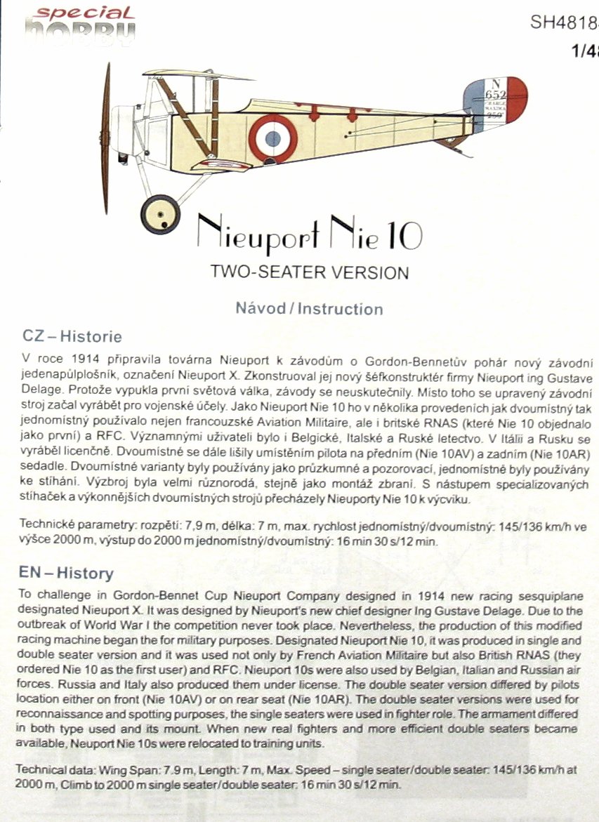 Nieuport 10 was a French reconnaissance and fighter plane with a wooden structure, covered with canvas in a biplane arrangement. The drive was provided by a single 80 HP Le-Rhone 9C rotary engine. The prototype flight took place in 1914, and serial production started in the same year. The Nieuport 10 was built under the leadership of French aviation constructor Gustave Delage and was the first in a series of highly successful aircraft that fought in World War I. Originally, the Nieuport 10 was designed as a racing plane with a biplane layout, with the lower wing being shorter than the upper one. However, the outbreak of war in August 1914 brought the machine to the front. It performed primarily reconnaissance and reconnaissance functions. However, many of them were quickly converted into hunting machines by covering the observer's position and adding a machine gun to the upper panel. In 1915, airplanes of this type began to be replaced at the front with Niuport 11 and used as training planes.