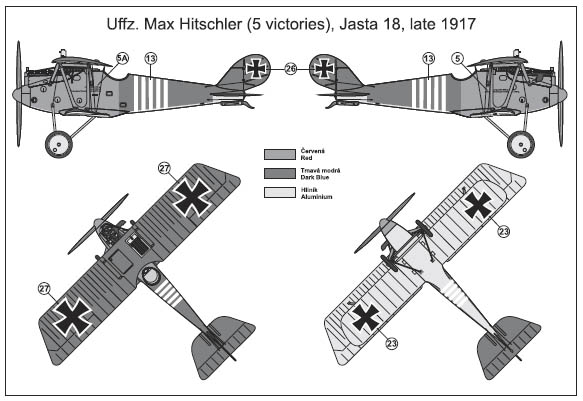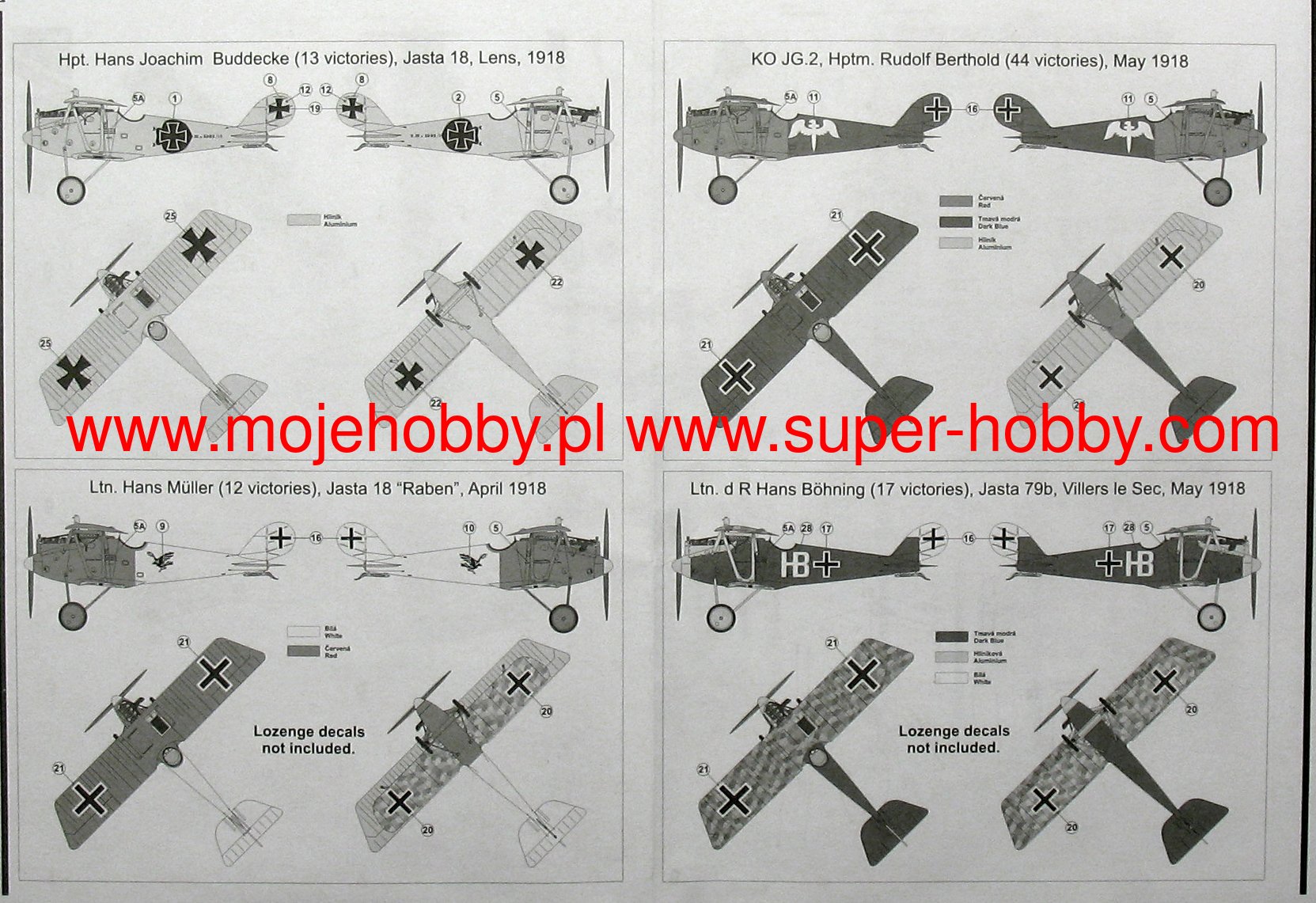 Pfalz D.III, the most dangerous competitor of the Albatross in the German fighter competition, was established at the beginning of 1917. The year 1916 ended with the reign of Nieuport 11 and the concept of the 1.5-a-fighter. German companies were ordered to copy this concept, this is how the Albatros D.III was created, but the Pfalz constructors did not quite let themselves get carried away by the "half-plane mania". It is true that the lower lobe had a smaller chord than the upper one, but it was not a significant difference, although the influence of the concept is visible. However, the shell structure of the hull turned out to be revolutionary - it was created by covering the wooden skeleton with several layers of veneer strips, which resulted in a rigid and very light structure. In March 1917, Idflieg ordered 70 series aircraft. In June, another 300, but this order was reduced to 190 in favor of the newer D.IIIa model.The basic changes to the D.III were the relocation of the rifles from the inside of the fuselage, the change in the shape of the horizontal tail, and the rounding of the lower lobe tips in later examples. In total, less than 1,000 copies were produced. The first two Pfalz D.III planes went to Jasta 10 and Jasta 22 in August, the next ones were supplied mainly by Bavarian vessels, although in total Pfalz's were passed through 40 different Jagdstafeln and 3 marine Marine Field Jasta. Opinions about the plane were different, e.g. Voss did not like it, while Berthold praised it. Pilots such as Lenz, von Holzem, Baumer, von Degelow and Bethge flew on it. The Pfalz remained in service until the end of the war, although it was definitely replaced by the Fokker D.VII from the frontline units and never posed a serious threat to the position of the Albatross D.III / DV, it is undoubtedly one of the most important aircraft structures from the Great War period. Technical data (version D.IIIa): length: 6.95 m, wingspan: 9.4 m, height: 2.67 m, maximum speed: 165 km / h, climb speed: 3.67 m / s, practical ceiling: 5180 m, armament : fixed - 2 LMG 08/15 machine guns cal.7.92 mm.