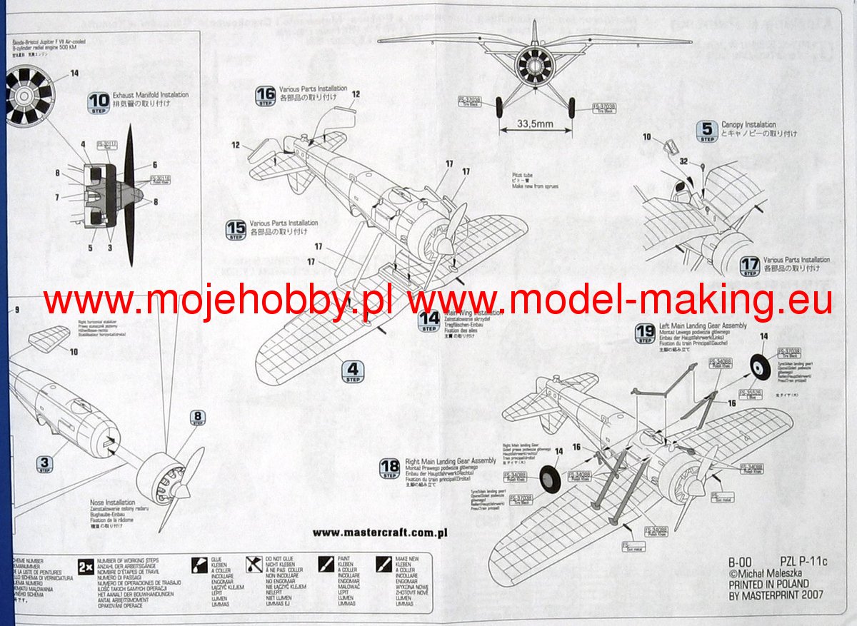 Note: Comany Mistercraft frequently changes, without any notice, the decals that come with the model, so they may differ from the photos and descriptions on our website. If you need a specific version, please let us know about that by entering the appropriate notice in the comments field when placing the order. The PZL P.11a (the so-called eleven) is a Polish, single-engine fighter plane with a metal structure with Puławski wings, a classic tail and a fixed landing gear. The flight of the prototype took place in 1931, but serial production continued in 1937-1939. The first serial version is the PZL P.11a powered by the Bristol Mercury IV S2 engine with a power of 550 HP. However, it was treated as a transitional version and only 50 were ordered. The most famous version of the "eleven" - PZL P.11c - appeared in the summer. It had an improved fuselage, wings and a vertical stabilizer. It all improved the aerodynamics of the plane. The drive unit has not changed. The interest in the construction was expressed by, among others, Romania, where 95 units of the licensed PZL P.11 were manufactured at the IAR plants. At the outbreak of the war, all versions of the P.11 were much slower than their German opponents, but at the same time had greater maneuverability, high rate of climb and a less emergency engine than German planes. They had many victories over the enemy during the September campaign, mainly as part of the Pursuit Brigade. Technical data (version P.11c): length: 7.55m, wingspan: 10.72m, height: 2.85m, maximum speed: 367km / h, rate of climb: 14.5m / s, maximum ceiling: 8000m, range maximum: 550 km, armament: fixed - 2 machine guns wz.33 cal.7.92 mm.