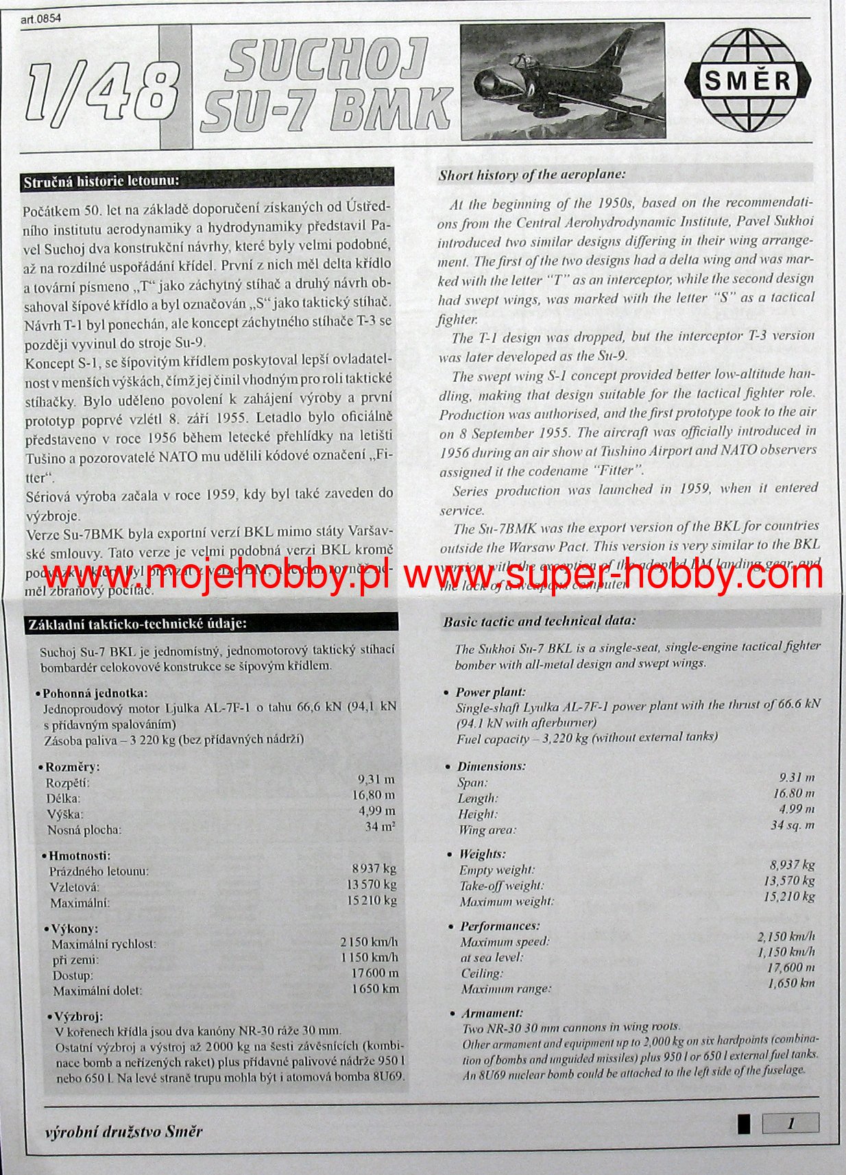 Описание С-7 (изделие С-2, по кодификации НАТО: Fitter-A) советский истребитель, разработанный в 1950-х годах ОКБ им. Сухого. С-7Б (изделие С-22, по кодификации НАТО: Fitter) советский истребитель-бомбардировщик, разработанный в конце 50-х ОКБ им. Сухого Всего было произведено 1 848 С-7 всех модификаций, из которых 691 самолёт был поставлен на экспорт в 9 стран мира. С-7БМК (изделие С-22МК) Экспортный вариант С-7БМ, с некоторыми улучшениями конструкции, реализованными на С-7БКЛ; последние серии самолёта были оборудованы дополнительной парой подвесок (1967-71). Декали (варианты): 4 Количество деталей: 162 Длина (см): 32,35 Размах (см): 29,90
