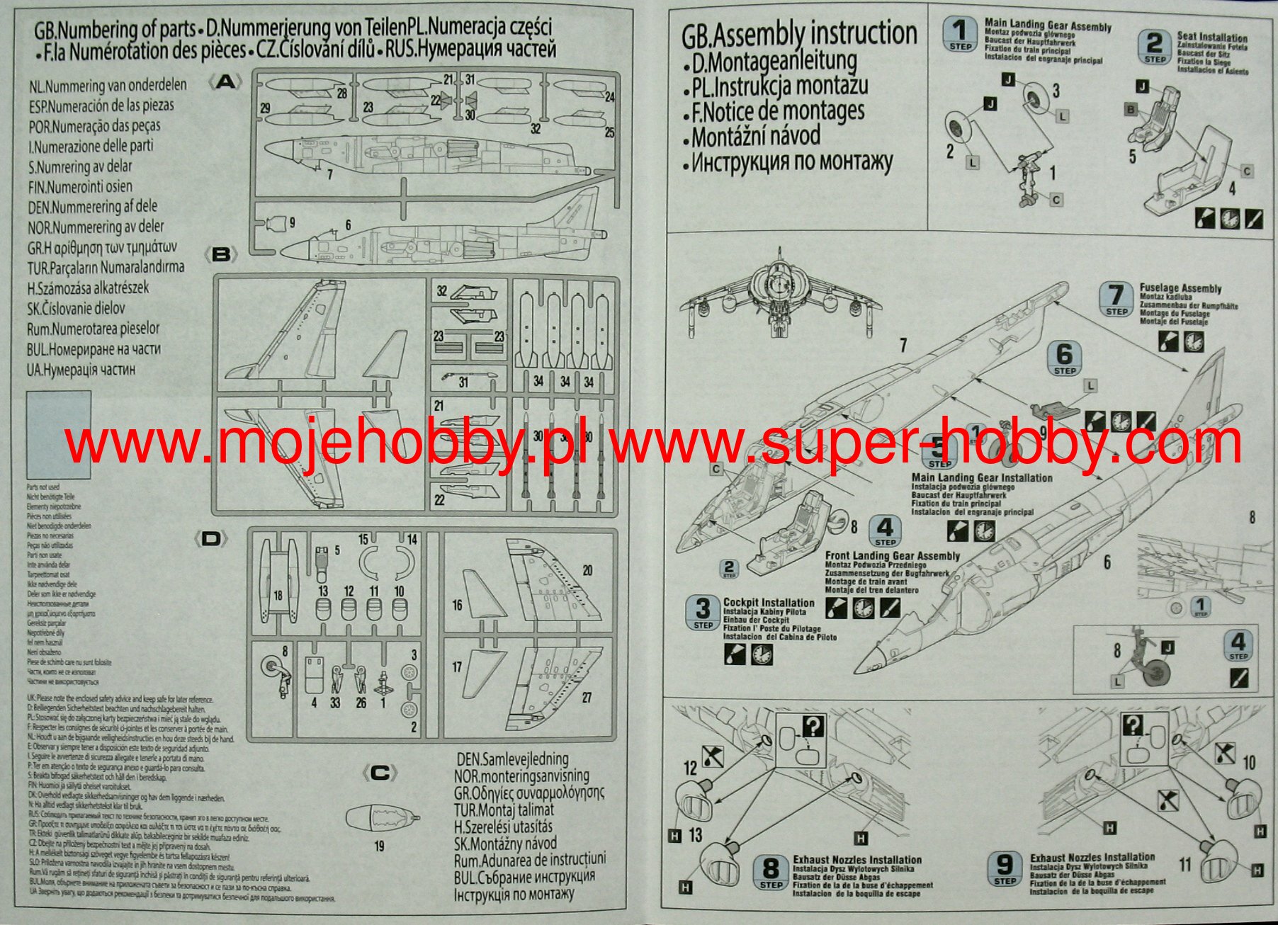 Note: Comany Mistercraft frequently changes, without any notice, the decals that come with the model, so they may differ from the photos and descriptions on our website. If you need a specific version, please let us know about that by entering the appropriate notice in the comments field when placing the order. The McDonnell-Douglas / BAe AV-8B Harrier II is a single-seat, V / STOL fighter-attack aircraft with a half-shell, duralumin structure. The roots of the Harrier II aircraft date back to 1973, when McDonnell-Douglas and BAe collaborated to create a new, significantly improved Harrier. The recipients were to be the American US Marine Corps as well as the British RAF and Royal Navy. However, due to the high cost of a new engine for Harrier (Pegasus 15) in 1975, the British government and thus BAe withdrew from cooperation. As a result, only the McDonnell-Douglas concern remained on the "battlefield". Taking into account the costs, the American label decided to make only a far-reaching modification of Harrier, using newer avionics, a different wing and large-scale composites. The first prototype, the YAV-8B, took off in 1978. In 1980, the British side decided to join the project again. The first built from scratch AV-8B flew in 1981 and entered the line in 1983. US Marine Corps units use the AV-8B, T AV-8B, AV-8B (NA) and AV-8B + versions. The first of them is the basic version of the aircraft, serving as a fighter-attacker. It has greater lifting capacity and range than the AV-8A, as well as is more maneuverable and has a more modern avionics and engine. The latter, on the other hand, was commissioned by Italy and Spain and is used on aircraft carriers of these countries. The RAF uses the versions GR.5, GR.5A, GR.7, GR.7A, GR.9, GR.9A, and T.10, T.11 and T.12. Airplanes marked as GR are fighter-attack versions, while T are two-seater training machines. AV8B / Harrier II took part in Operation Desert Storm (1991) and in the war with Iraq (2003) and Afghanistan (2006-2008). Technical data (version Harrier AV-8B): length: 14.12m, wingspan: 9.25m, height: 3.56m, maximum speed: 1085km / h, combat radius: 1205km, armament: GAU-12U fixed cannon caliber 25 mm, suspended - up to 3748 kg of cargo.
