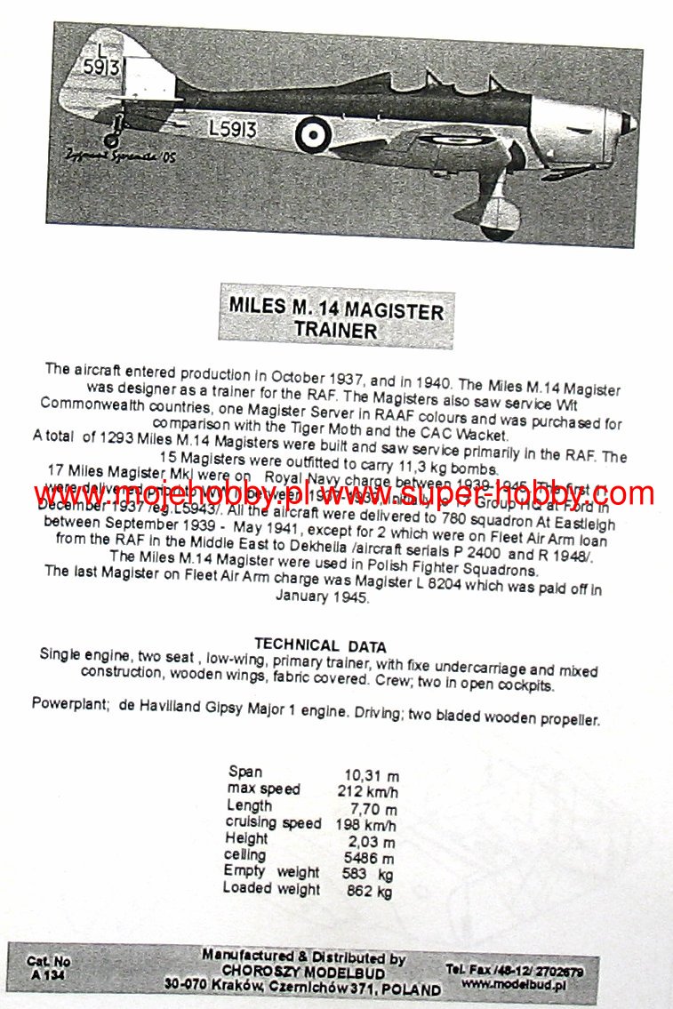 Miles M.14 Magister is a British, single-engine, plywood-covered training plane with a fixed undercarriage and a classic tail in the low wing configuration. The flight of the prototype took place in 1936, and serial production continued in 1937-1941. The aircraft was manufactured by Philipps and Powis Aricraft Limited. The Magister was the first low-wing aircraft to be equipped in British aviation schools. It greatly facilitated the training of future Spitfire and Hurricane pilots. The most important version, produced on a large scale, was the Miles M.14 Magister Mk.I with the De Havilland Gipsy Major engine, 130 HP. He remained in service until 1947. Technical data: length: 7.51m, wingspan: 10.31m, height: 2.77m, maximum speed: 212km / h, climb speed: 4.3m / s, maximum range: 610km, maximum ceiling 5500m, armament: fixed -lack.