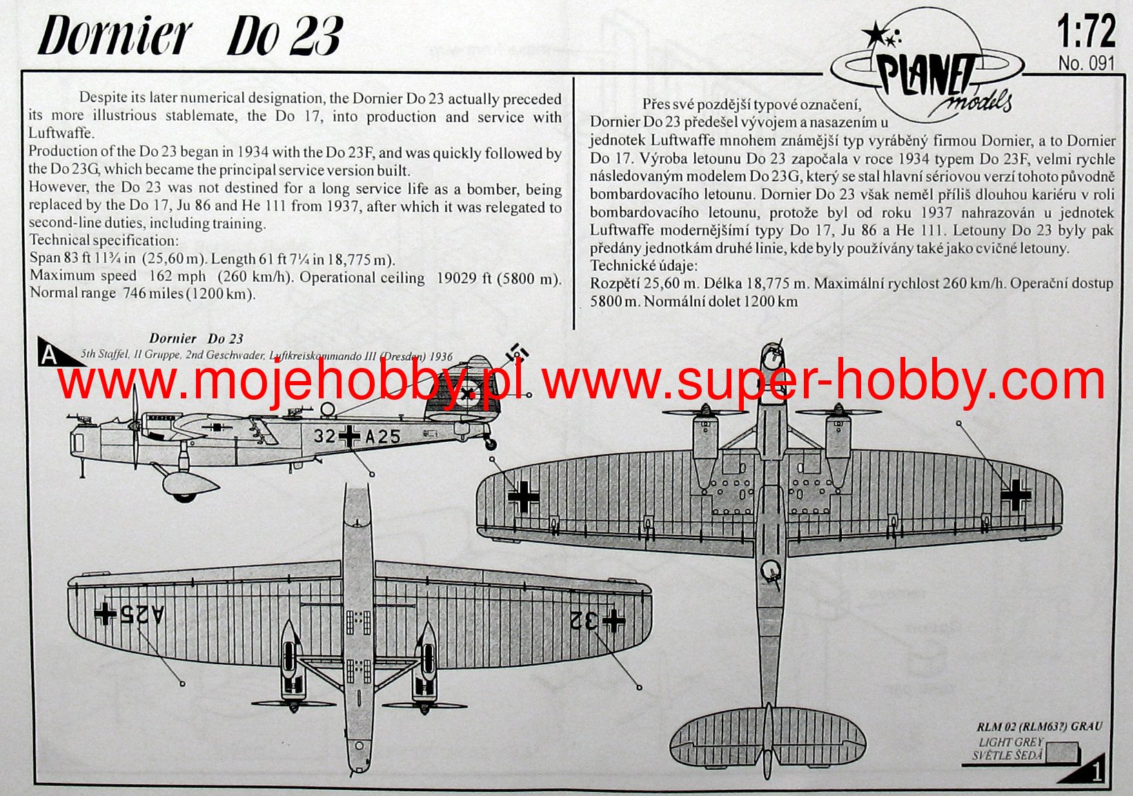 The Dornier Do 23 was a German all-metal medium bomber from the interwar period and WWII. The drive - in the Do 23 G version - was provided by two engines BMW VI U with 750 hp each. The flight of the prototype took place in 1934, and serial production started a year later. As a result, about 200 aircraft of this type were created. The deck armament consisted of three 7.92 mm MG 15 machine guns. The plane could carry a load of bombs weighing up to 1000 kilograms. The Dornier Do 23 was created as a successor and development of the not very successful Dornier Do 11 bomber. Compared to its predecessor, it differed primarily in the change of the wingspan, the use of new ailerons and a clear reinforcement of the airframe and fuselage structure. The machine was made in two versions: Do 23 F and Do 23 G, which differed only in the engines used. However, the performance of both Do 23 versions was relatively low and mass production ended very quickly. As early as 1936, the plane was replaced in the line by much more modern constructions and assigned to secondary tasks, for example, to aviation schools or sea aviation, as a mine-fighting aircraft. The last Do 23 units were withdrawn from the line in 1944. The only foreign user of these planes was Hungary.
