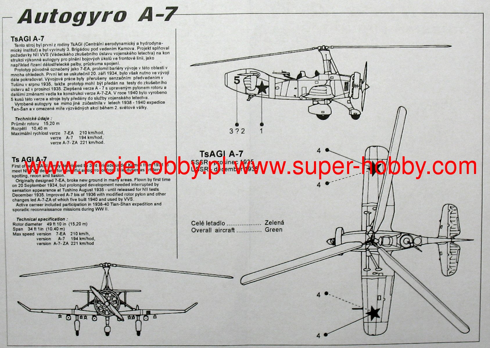 The TsAGI A-7 was a mixed Soviet gyroplane from the interwar period and WWII. The prototype flight took place in 1934. However, the machine did not enter mass production - there were probably 5 prototype units in total. The drive - in the A-7 bis version - was provided by a single M-22 engine with 483 HP. The rotor diameter was up to 15.2 meters. TsAGI A-7 was developed by the later famous helicopter designer Nikolai Kamov. While working on the A-7 model, the experience gained from the construction and operation of the 2-EA gyroplane was taken. It was also assumed that the new aircraft would be used primarily for reconnaissance and coordination of artillery fire. Despite the fact that the machine was technically operational, it was not decided to mass-produce it due to both the avant-garde design and the very low top speed, which made the A-7 a very easy target for enemy aircraft. During World War II, only one small unit consisting of 5 machines of this type was created, which took part in the first months of the German-Soviet war (1941-1945).