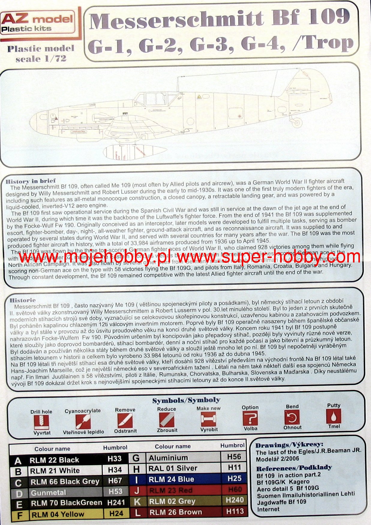 The Messerschmitt Bf-109 is a German metal-structure single-engine fighter in a low wing configuration with a classic tail. It turned out to be the basic and most produced Luftwaffe fighter during World War II. The flight of the prototype took place on May 29, 1935, and serial production continued in the years 1936-1945. In total, it is estimated that a total of about 35,000 Messerschmitt Bf-109 fighters of all varieties were produced, many of which ended up in the Czech and Israeli air forces after the war. The roots of the Bf-109 go back to the competition announced in 1933 by the Luftwaffe for a new fighter plane. In competition with the He-112, the Bf-109 project initially lost, but thanks to Willie Messerschmitt's intrigues, the project could continue and eventually he was the winner of the competition, becoming the Luftwaffe's primary fighter. Several main variants of the Bf-109 were developed in the course of production. The first pre-production series was the Bf-109B (Berta) with different versions of the Junkers Jumo 210 (A or Da) engine. They were tested in Spain from 1937 during the Civil War. The next version is the Bf-109C (Caesar). They had a different engine than the B version, and extensive armament consisting of two 20mm and 2 HP 7.92mm cannons. These machines also fought in the skies of Spain. The third version is the Bf-109D (Dora) with the Junkers Jumo 210 Da or Daimler-Benz DB 600 engine. It fought in the September campaign, but at the turn of 1939/1940 it was replaced by the E version. The most famous model was the Bf-109E (Emil) with a Daimler-Benz 601A or N engine. It was the first to use a three-blade, not a two-blade propeller. Bf-109E fought in the French campaign, over England, and in North Africa and on the Eastern Front. The ace who started his career on the Bf-109E was the famous Adolf Galland. The next version is the Bf-109F (Friedrich), which, according to the German pilots, was the most aerodynamically perfect. It sowed the changed shape of the fuselage, wings, cabin fairings, but no new engine was used. It was put into service at the turn of 1940/1941. As part of the development of the design, further Bf-109 specifications were developed, of which the G (Gustav) version was produced in the largest number of copies. The most important change increasing the machine's performance was the installation of a new 12-cylinder Daimler-Benz DB605A engine with 1475HP. The armament of the Bf-109G was a pair of 13mm machine guns located in the fuselage in front of the cockpit fairing, and the MG151 20mm or heavier MK108 30mm cannon. The last mass-produced version was the Bf-109K (Kurfirst), which production started in October 1944. A Daimler-Benz DB 605DB or DC unit was used as the engine. The Bf-109K was the fastest version produced during World War II, reaching up to 730 km / h. Apart from that, two versions were created - H and Z, but they were rather experimental versions and their mass production did not start. Subsequent improvements in propulsion and armament made the Messerschmitt Bf-109 one of the most dangerous fighters of World War II, and at the same time showed the great potential of the slightly angular airframe created by Willi Messerschmitt. Technical data (version Bf-109 G-6): length: 8.95 m, wingspan: 9.92 m, height: 2.6 m, maximum speed: 640 km / h, rate of climb: 17 m / s, maximum range: 850 km, maximum ceiling 12000m, armament: fixed - 2 MG131 13mm machine guns and 1 MG151 20mm cannon, suspended - 250 kg bombs, or 2 Wfr missile launchers. Gr. 21.