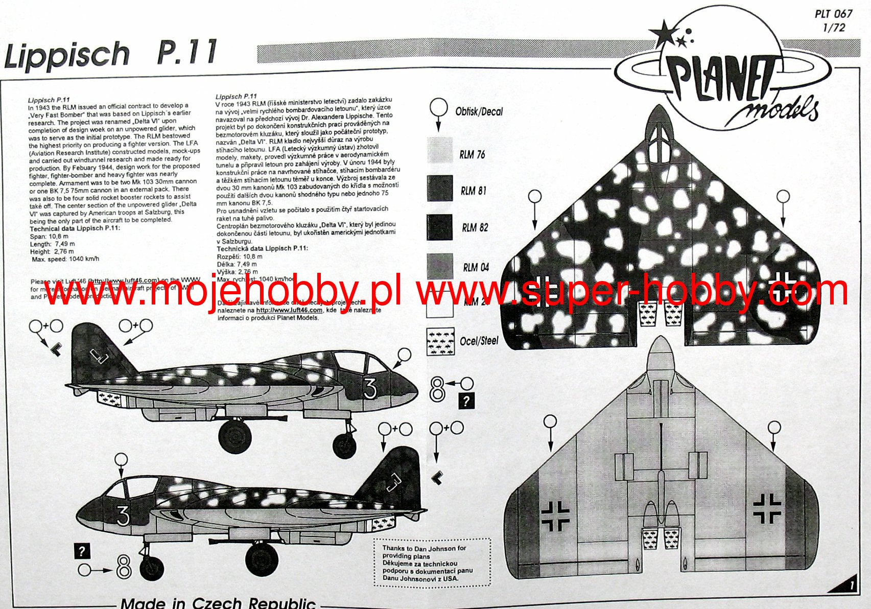 Lippisch P.11 was a project of a German bomber and a fighter-bomber from World War II. The propulsion was probably provided by two Junkers Jumo 004B jet engines. The on-board armament was to consist of two 30mm Mk.108 cannons or one 75mm BK 7.5 cannon. The machine has never been tested, much less entered mass production. The P.11 project was developed at the Lippisch factory, commissioned by the German Ministry of Aviation in 1943, which wanted to obtain a new bomber with the highest possible maximum speed - preferably around 1000 km / h. Aleksander Lippisch relied on his existing gliders and projects in the P.11 project, which resulted in the development of a de facto aircraft in an atypical flying wing configuration. By February 1944, a preliminary design was developed and the construction of a mock-up of the plane began. However, the low priority of the work, the lack of strategic raw materials and organizational problems with the supply chain - especially engines - meant that Lippisch P.11 never went beyond the design stage.
