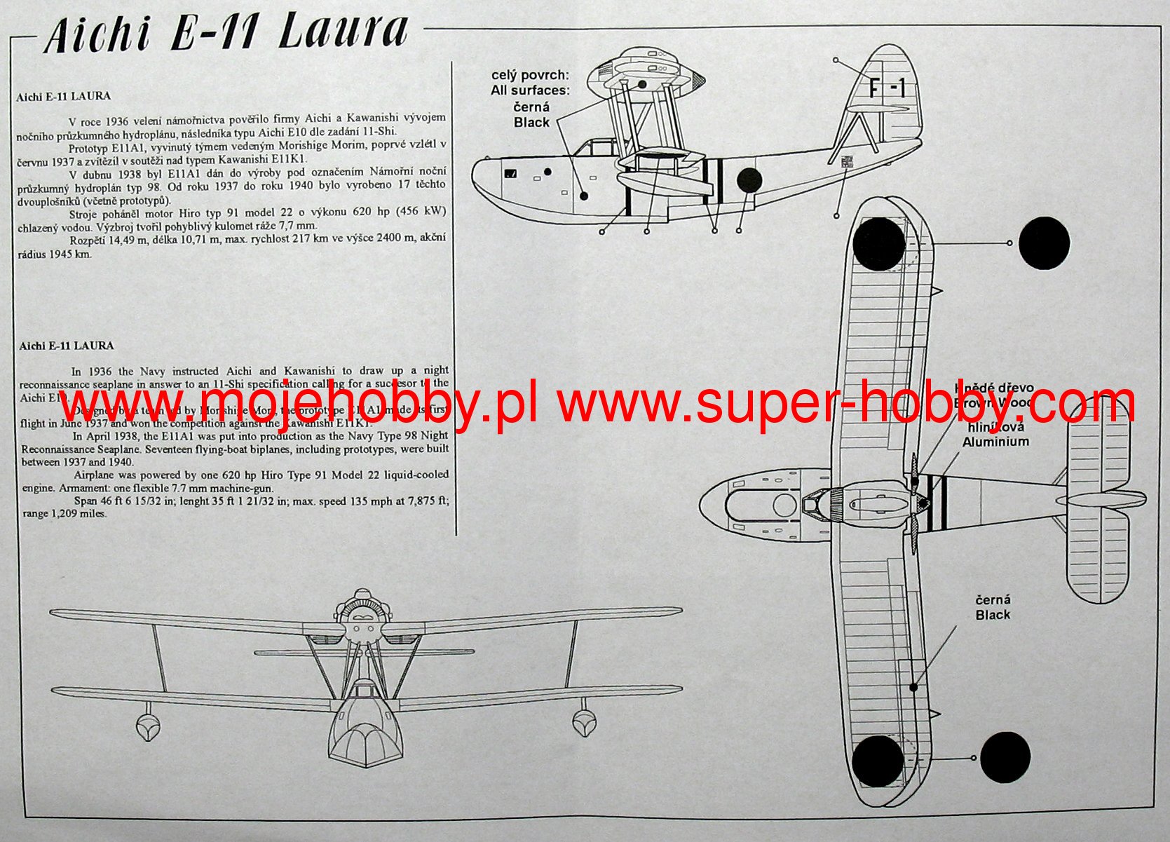 In 1936, the Japanese fleet command asked the Aichi and Kawanishi factories to develop a new reconnaissance flying boat that could take off from catapults installed on board cruisers and battleships to replace the obsolete Aichi E10A aircraft. In July 1937. the Aichi E11A1 flying boat (also designated as "Navy Type 98 Reconnaissance Seaplane") was tested. This plane turned out to be better than the competing Kawanishi E11K1, which only exceeded it by higher speed in level flight. However, the E11A attempts were extended until 1940. As a result, only 17 Aichi E11A1s were created, which were used until 1942. The Allies codenamed them "Laura". All 17 units were powered by the 620HP Hiro Type 91 Model 22 engine. Technical data: length: 10.71 m, wingspan: 14.49 m, height: 4.52 m, maximum speed: 217 km / h, maximum range: 2063 km, maximum ceiling 4425 m, armament: permanent - 1 machine gun type 92 cal.7 , 7mm.