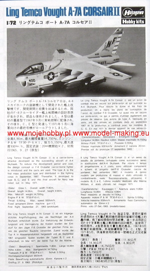 The Vought A-7 Corsair II is a light attack aircraft, adapted to be operated by aircraft carriers. Its history begins in February 1964, when Vought (today LTV Aerospace) was commissioned to develop the design of a new deck plane for the US Navy, intended to replace the A-4 Skyhawk, with greater payload and range. The project was developed on the basis of the F-8 Crusader, adapting it to subsonic flights. The flight of the A-7 prototype was made in 1965, and serial production started a year later. The Corsair II resembles the Crusader silhouette, but the wing wedge angle was not changed, which was redesigned, increasing the number of suspension knots to 6, and - apart from flaps and ailerons - saws and spoilers, a device for hydraulic wing folding was also introduced. The structure was largely unified with the Crusader, using many ready-made elements. The main versions are: A-7E (fighter assault), A-7H (land version), A-7K (new avionics, in service since 1980). The A-7 Corsair II aircraft were used in combat on a large scale in the Vietnam War and in the air attack on Libya in 1986. They were also exported, min. to Greece and Portugal. Technical data: Top speed: 1100 km / h; climb speed 67 m / s, maximum ceiling 16000 m, maximum range: 4600 km, fixed armament: 2 20mm Mk.12 cannons, lifting capacity: up to 6800 kg.