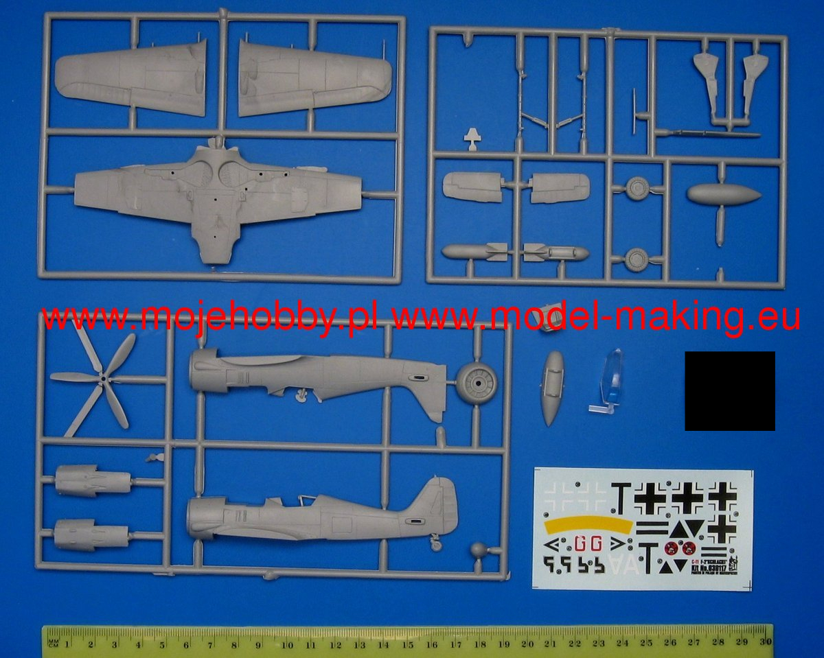 Note: Comany Mistercraft frequently changes, without any notice, the decals that come with the model, so they may differ from the photos and descriptions on our website. If you need a specific version, please let us know about that by entering the appropriate notice in the comments field when placing the order. The Focke-Wulf Fw-190 is a German, single-engine, full-metal fighter aircraft with a covered cabin in the low wing design of the Second World War. The pilots considered the Fw-190 to be a better aircraft than the Messerschmitt Bf-109. A self-supporting low wing with a working Fw-190 coating was commissioned by the Luftfahrtministerium, assembled in the fall of 1937. Kurt Tank submitted two propulsion proposals - the first with a liquid-cooled Daimler-Benz DB 601 engine, and the second with the new BMW 139 radial engine. The latter was chosen, and the work started in the spring of 1938 was headed by Obering R. Blaser. The first prototype of the Fw-190V1 was ready in May 1939, and it was flown in Bremen on June 1, 1939 by Captain Hans Sander. The second prototype, the FW-190V2, armed with two MG131 and two MG17 machine guns - all 7.92 mm caliber, was flew in October 1939. To reduce aerodynamic drag, both were equipped with a tunnel air inlet in the propeller cap, but problems with overheating of the engine resulted in a return to the proven NACA shield design. Before the tests of these prototypes began for good, the decision was already made to replace the BMW 139 engine with a stronger, but longer and heavier BMW 801. It required many changes, strengthening the structure and moving the cabin back, which later became a source of problems with the center of gravity. The advantage was the removal of problems with exhaust gas permeation and overheating of the cabin interior due to its direct vicinity to the BMW 139 engine. The third and fourth prototypes were abandoned, and the Fw-190V5 with the new engine was completed at the beginning of 1940. Later, it received wings with a wingspan enlarged by one meter (from the original 9.5 m), which made it 10 km / h slower, but it increased the rate of climb and improved maneuverability. It was marked Fw-190V5g, and the variant with the shorter wing was Fw-190V5k. The first seven machines of the Fw-190A-0 information series had a short wing, the rest - a longer one. The first operational unit equipped with the Fw-190 - 6./JG 26 stationed at Le Bourget, declared its operational readiness in August 1941 and from the first meeting of the new fighter with the British Supermarine Spitfire, its advantage over them became apparent. During the war, a dozen or so versions of this great plane were created. The machines of the "A" version, along with a dozen or so modernizations, served as fighter planes. The versions marked "B" and "C" were only prototypes of high-altitude fighters intended for fighting strategic bombers, but they did not enter into serial production. The "D" variant, as the only one of the Fw-190s, was powered by the new 1750HP Jumo 213A engine and was the German response to the P-51 Mustang. The new engine extended the fuselage by several dozen centimeters. This variant also performed mainly hunting and high-altitude fighter tasks. Numerous variants of the "F" version were used as fighter-bombers as direct support of the battlefield. The "G" version played the same role as the "F" version, but had a greater range. During the entire war, over 20,000 copies of this one of the best fighters of World War II were produced. Technical data (version Fw-190A-8): length: 9m, wingspan: 10.51m, height: 3.95m, maximum speed: 656km / h, rate of climb: 15m / s, maximum range: 800km, maximum ceiling 11410m , armament: fixed-2 MG131 13mm machine guns and 4 MG151 20mm cannons (2 MG 151 / 20E cannons for the D-9 version).