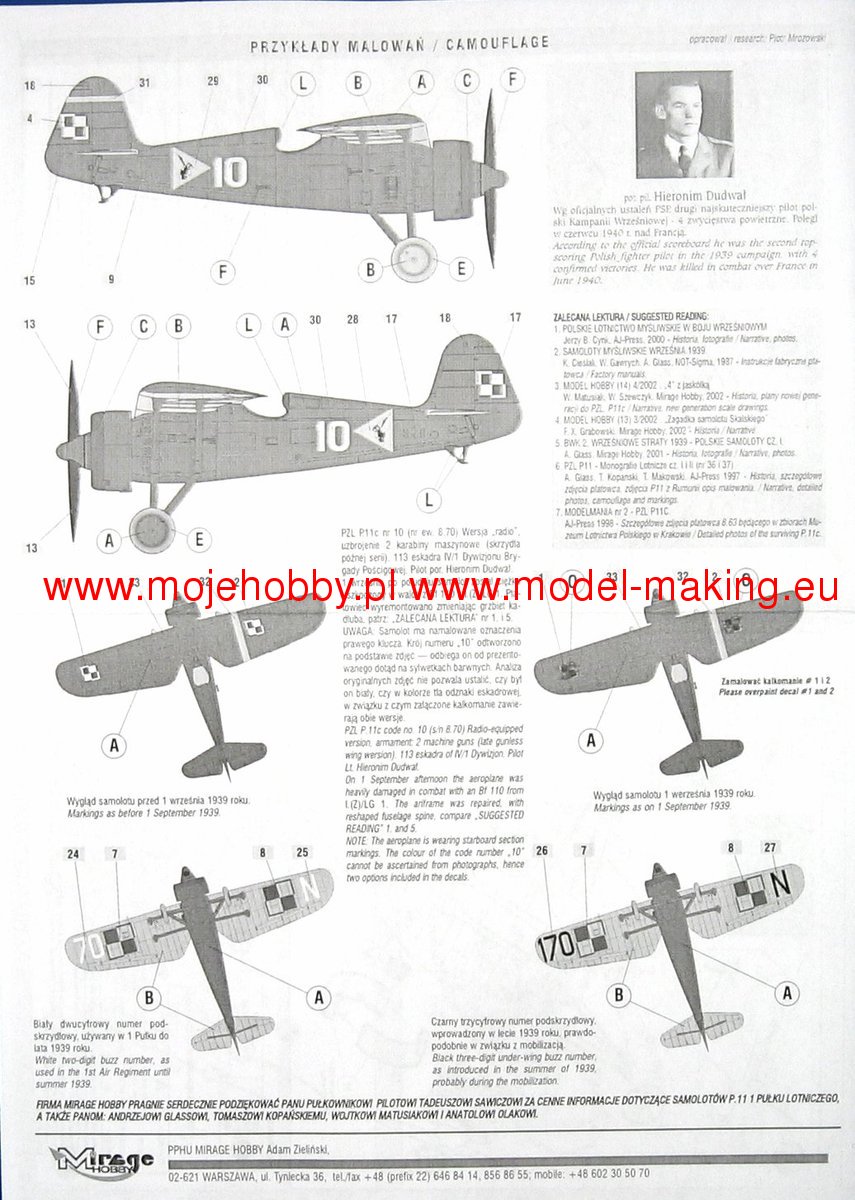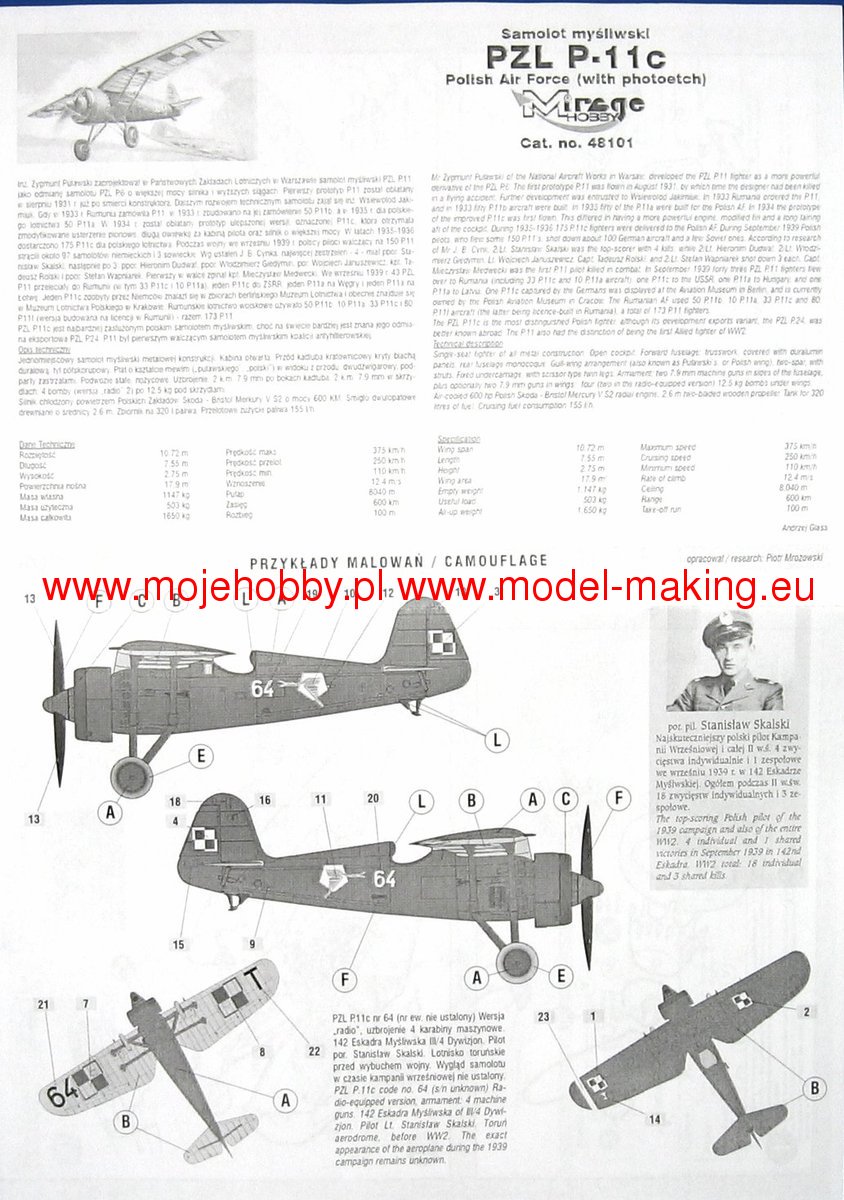Download Mirage Hobby PDF catalogueThe PZL P.11a (the so-called eleven) is a Polish, single-engine fighter plane with a metal structure with Puławski wings, a classic tail and a fixed landing gear. The flight of the prototype took place in 1931, but serial production continued in 1937-1939. The first serial version is the PZL P.11a powered by the Bristol Mercury IV S2 engine with a power of 550 HP. However, it was treated as a transitional version and only 50 were ordered. The most famous version of the "eleven" - PZL P.11c - appeared in the summer. It had an improved fuselage, wings and a vertical stabilizer. It all improved the aerodynamics of the plane. The drive unit has not changed. The interest in the construction was expressed by, among others, Romania, where 95 units of the licensed PZL P.11 were manufactured at the IAR plants. At the outbreak of the war, all versions of the P.11 were much slower than their German opponents, but at the same time had greater maneuverability, high rate of climb and a less emergency engine than German planes. They had many victories over the enemy during the September campaign, mainly as part of the Pursuit Brigade. Technical data (version P.11c): length: 7.55m, wingspan: 10.72m, height: 2.85m, maximum speed: 367km / h, rate of climb: 14.5m / s, maximum ceiling: 8000m, range maximum: 550 km, armament: fixed - 2 machine guns wz.33 cal.7.92 mm.