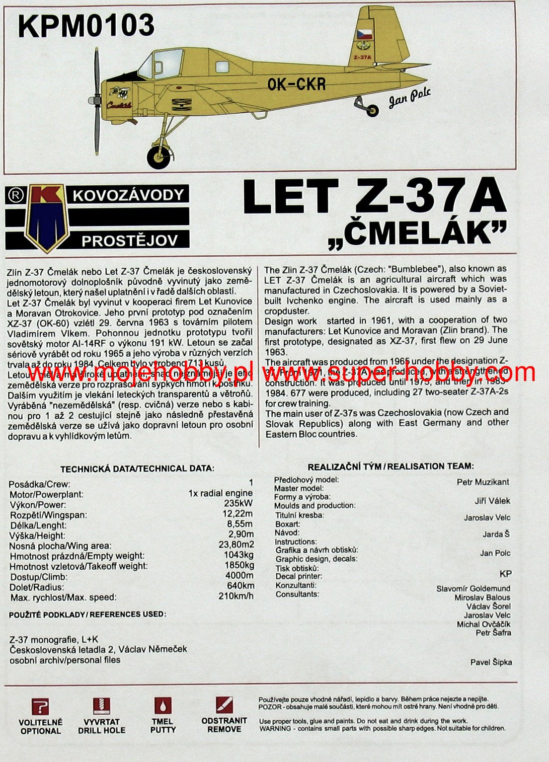 Zlin Z-37 Cmelak чехословацкий сельскохозяйственный и связной самолет. Полет прототипа состоялся в 1963 году. Серийное производство осуществлялось в 1965-1987 годах. В ее ходе было построено около 700 самолетов этого типа. Привод в варианте Z-37A обеспечивался одним двигателем Avia M462RF мощностью 315 л.с. Длина самолета составляла 8,55 метра при размахе крыла 12,22 метра. Zlin Z-37 Cmelak был создан в результате начатых в 1961 году работ между заводами Zlin и Avia. После относительно короткого периода исследований и разработок была создана машина в системе низкорасположенного крыла с классической ходовой частью, с относительно простой конструкцией и не высокими затратами на производство. В 1971 году в производство поступил вариант Z-37A с усиленной конструкцией. Также был создан учебный вариант (обозначение: Z-37A-2). Однако в 1985 году в производство поступила версия З-37Т с новым силовым агрегатом. Самолеты Z-37 в различных модификациях экспортировались во многие страны Восточного блока, а также в страны третьего мира. Они оказались удачными машинами и остаются на вооружении по сей день.