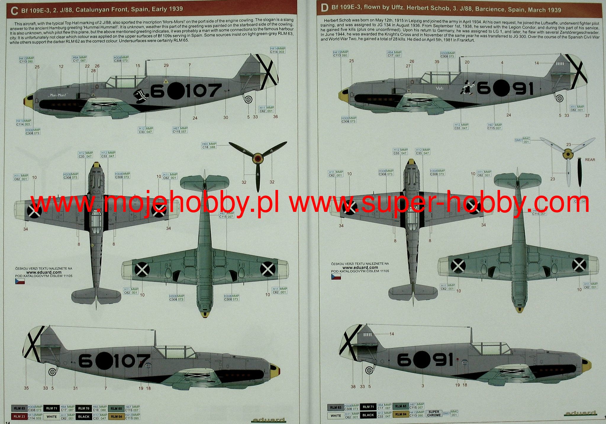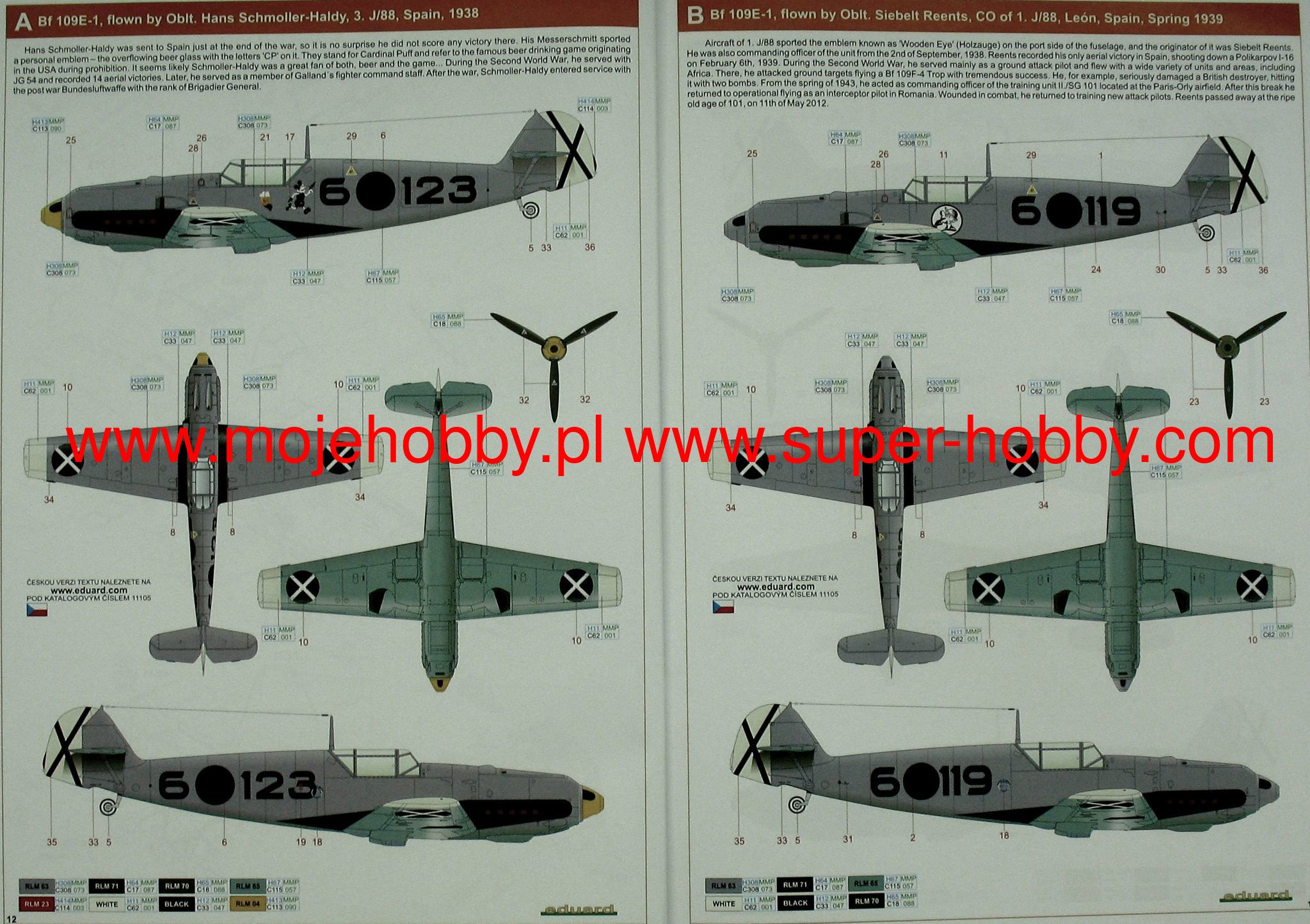 Messerschmitt Bf-109 to niemiecki, jednosilnikowy samolot myliwski o konstrukcji metalowej, w układzie dolnopłata z usterzeniem klasycznym. Okazał się podstawowym i najliczniej produkowanym myliwcem Luftwaffe w czasie II wojny wiatowej. Oblot prototypu miał miejsce 29 maja 1935 roku, a produkcja seryjna trwała w latach 1936-1945. W sumie szacuje się, że łšcznie wyprodukowano około 35000 myliwców Messerschmitt Bf-109 wszystkich odmian, z czego wiele po wojnie trafiło do sił powietrznych Czech i Izraela. Korzenie Bf-109 sięgajš konkursu ogłoszonego w 1933 roku przez Luftwaffe na nowy samolot myliwski. W konkurencji z He-112, projekt Bf-109 poczštkowo przegrał, ale dzięki intrygom Williego Messerschmitta , projekt mógł być kontynuowany i ostatecznie to on okazał się zwycięzcš konkursu, stajšc się podstawowym myliwcem Luftwaffe. W toku produkcji powstało kilka głównych odmian samolotu Bf-109. Pierwszš seriš przedprodukcyjnš był Bf-109B (Berta) z różnymi wersjami silnika Junkers Jumo 210 (A lub Da). Były one testowane w Hiszpanii od 1937 roku w czasie wojny domowej. Kolejna wersja to Bf-109C (Cezar). Posiadały one inny silnik od wersji B, oraz rozbudowane uzbrojenie złożone z dwóch działek 20mm oraz 2 km kal.7,92mm. Także te maszyny walczyły na niebie Hiszpanii. Trzecia wersja to Bf-109D (Dora) z silnikiem Junkers Jumo 210 Da lub Daimler-Benz DB 600. Walczyła ona w kampanii wrzeniowej, ale na przełomie 1939/1940 została zastšpiona przez wersję E. Najsłynniejszym modelem był Bf-109E (Emil) z silnikiem Daimler-Benz 601A lub N. Jako pierwszy model posługiwał się trzy-, a nie dwu-łopatowym migłem. Bf-109E walczyły w kampanii francuskiej, nad Angliš oraz w Afryce Północnej i na froncie wschodnim. Asem, który rozpoczšł swojš karierę włanie na Bf-109E był słynny Adolf Galland. Kolejna wersja to Bf-109F (Friedrich), która zdaniem niemieckich pilotów była najdoskonalsza aerodynamicznie. Posiała zmieniony kształt kadłuba, skrzydeł, owiewki kabiny, ale nie zastosowano nowego silnika. Wprowadzano go do służby na przełomie 1940/1941 roku. W ramach rozwoju konstrukcji opracowywano kolejne specyfikacje Bf-109, z których wersję G (Gustav) wyprodukowano w największej iloci egzemplarzy. Najpoważniejszš zmianš podnoszšcš osišgi maszyny było zamontowanie nowego 12-cylindrowego silnika Daimler-Benz DB605A o mocy 1475KM. Uzbrojenie Bf-109G stanowiła para karabinów maszynowych 13mm znajdujšcych się w kadłubie przed owiewkš kabiny pilota, oraz działko MG151 20mm lub cięższe MK108 30mm. Ostatniš produkowanš na masowš skalę wersjš był Bf-109K (Kurfirst), której produkcja ruszyła w padzierniku 1944 roku. Jako silnik zastosowano jednostkę Daimler-Benz DB 605DB lub DC. Bf-109K był najszybszš wersjš z produkowanych w czasie II wojny wiatowej, osišgajšc do 730km/h. Poza tym powstały dwie wersje- H i Z, były to jednak wersje raczej eksperymentalne i ich produkcja wielkoseryjna nie ruszyła. Kolejne usprawnienia w dziedzinie napędu i uzbrojenia uczyniły Messerschmitta Bf-109 jednym z najgroniejszych myliwców II wojny wiatowej, a jednoczenie pokazały ogromny potencjał drzemišcy w nieco kanciastym płatowcu stworzonym przez Williego Messerschmitta. Dane techniczne (wersja Bf-109 G-6): długoć: 8,95m, rozpiętoć skrzydeł: 9,92m, wysokoć: 2,6m, prędkoć maksymalna: 640km/h, prędkoć wznoszenia: 17m/s, zasięg maksymalny: 850km, pułap maksymalny 12000m, uzbrojenie: stałe- 2 karabiny maszynowe MG131 kal.13mm oraz 1 działko MG151 kal.20mm , podwieszane-250 kg bomb, lub 2 wyrzutnie pocisków Wfr. Gr. 21. Co oprócz modelu będę potrzebować do jego sklejenia? 3_edu11105_instruction_sheet.pdf