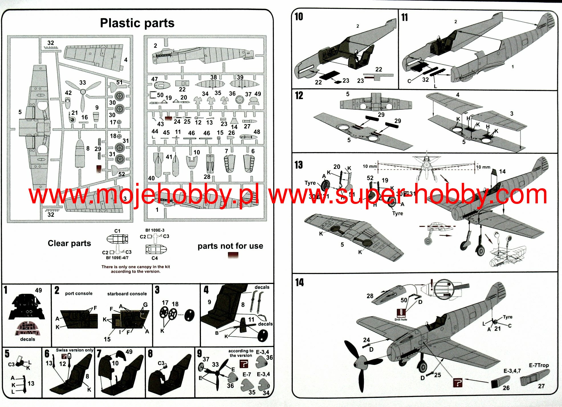 The Messerschmitt Bf-109 is a German metal-structure single-engine fighter in a low wing configuration with a classic tail. It turned out to be the basic and most produced Luftwaffe fighter during World War II. The flight of the prototype took place on May 29, 1935, and serial production continued in the years 1936-1945. In total, it is estimated that a total of about 35,000 Messerschmitt Bf-109 fighters of all varieties were produced, many of which ended up in the Czech and Israeli air forces after the war. The roots of the Bf-109 go back to the competition announced in 1933 by the Luftwaffe for a new fighter plane. In competition with the He-112, the Bf-109 project initially lost, but thanks to Willie Messerschmitt's intrigues, the project could continue and eventually he was the winner of the competition, becoming the Luftwaffe's primary fighter. Several main variants of the Bf-109 were developed in the course of production. The first pre-production series was the Bf-109B (Berta) with different versions of the Junkers Jumo 210 (A or Da) engine. They were tested in Spain from 1937 during the Civil War. The next version is the Bf-109C (Caesar). They had a different engine than the B version, and extensive armament consisting of two 20mm and 2 HP 7.92mm cannons. These machines also fought in the skies of Spain. The third version is the Bf-109D (Dora) with the Junkers Jumo 210 Da or Daimler-Benz DB 600 engine. It fought in the September campaign, but at the turn of 1939/1940 it was replaced by the E version. The most famous model was the Bf-109E (Emil) with a Daimler-Benz 601A or N engine. It was the first to use a three-blade, not a two-blade propeller. Bf-109E fought in the French campaign, over England, and in North Africa and on the Eastern Front. The ace who started his career on the Bf-109E was the famous Adolf Galland. The next version is the Bf-109F (Friedrich), which, according to the German pilots, was the most aerodynamically perfect. It sowed the changed shape of the fuselage, wings, cabin fairings, but no new engine was used. It was put into service at the turn of 1940/1941. As part of the development of the design, further Bf-109 specifications were developed, of which the G (Gustav) version was produced in the largest number of copies. The most important change increasing the machine's performance was the installation of a new 12-cylinder Daimler-Benz DB605A engine with 1475HP. The armament of the Bf-109G was a pair of 13mm machine guns located in the fuselage in front of the cockpit fairing, and the MG151 20mm or heavier MK108 30mm cannon. The last mass-produced version was the Bf-109K (Kurfirst), which production started in October 1944. A Daimler-Benz DB 605DB or DC unit was used as the engine. The Bf-109K was the fastest version produced during World War II, reaching up to 730 km / h. Apart from that, two versions were created - H and Z, but they were rather experimental versions and their mass production did not start. Subsequent improvements in propulsion and armament made the Messerschmitt Bf-109 one of the most dangerous fighters of World War II, and at the same time showed the great potential of the slightly angular airframe created by Willi Messerschmitt. Technical data (version Bf-109 G-6): length: 8.95 m, wingspan: 9.92 m, height: 2.6 m, maximum speed: 640 km / h, rate of climb: 17 m / s, maximum range: 850 km, maximum ceiling 12000m, armament: fixed - 2 MG131 13mm machine guns and 1 MG151 20mm cannon, suspended - 250 kg bombs, or 2 Wfr missile launchers. Gr. 21.