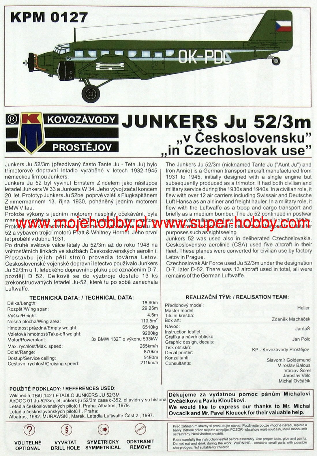 The Junkers Ju-52 is a German three-engine bomber and transport plane in the low wing structure with a classic metal tail tail. The single-engine version of the prototype flew in 1930, and the first three-engine version (Ju52 / 3m) took off a year later. Originally, the Ju-52 was used by Lufthansa as a passenger and transport plane, but at the end of 1933 a long and fruitful military career began. In the beginning, in 1933-1935, the Ju-52 acted as a "replacement bomber" until the Luftwaffe received the modern He-111 and Do-17. It also found combat use in the Spanish Civil War. Initially, it served as a day bomber, but later - from 1937 - it was often moved to transport tasks. During the September campaign, it also performed two functions - a transport machine and a bomber. However, in the years 1940-1945 its main tasks were broadly understood transport. It was the Ju-52 that were transport planes for the German paratroopers in Crete in 1941, and they also towed the gliders attacking Fort Eben-Emael in 1940. They were used extensively in North Africa and on the Eastern Front. It was Ju-52 that created the air bridge in the boiler near Demianske and in Stalingrad. The most common propulsion was, depending on the version, Pratt-Whitney Hornet engines with 600 HP each or BMW 132 with 830 HP each. The Ju-52 was a solid machine, easy to operate, highly reliable and cheap to produce. He gained a lot of recognition from pilots and was nicknamed "Tante Ju" (German aunt Ju). The last Ju-52 was withdrawn from service in the Swiss aviation only in the early 1970s! Technical data: length: 18.9m, wingspan: 29.24m, height: 4.65m, maximum speed: 265km / h, climb speed: 2.9m / s, maximum range: 1000km, maximum ceiling 5900m, armament: permanent - from 1 to 3 machine guns cal.7.92 or 13mm, suspended - up to 1500 kg of bombs.