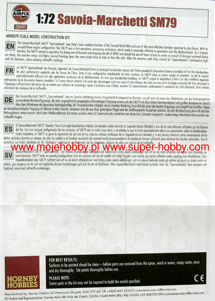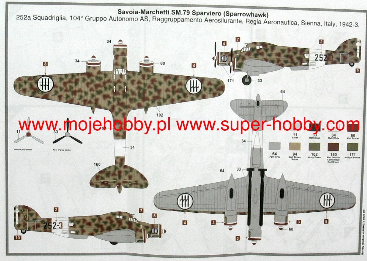 The Savoia-Marchetti SM.79 Sparviero is an Italian three-engine bomber and torpedo plane, in a mixed low wing design from the WWII period. The flight of the prototype took place in October 1934, and the entry into service took place in 1936. Three main versions of the aircraft were made in the course of production. The first is the SM.79 I model, a classic bomber powered by Alfa Romeo 125 RC.34 engines. The second is the SM.79-II, performing the tasks of a torpedo plane, with new engines - Alfa Romeo 126. The third version with the SM.79 C, a classic transport plane. In addition, a twin-engine version was also created, intended for export to Brazil, Iraq and Romania. The Savoia-Marchetti SM.79 was first used in combat during the Spanish Civil War, where it did very well with minimal losses of its own. In 1939-1943, aircraft of this type fought in the Mediterranean, attacking Allied convoys sailing from and to Malta, fighting in North Africa and fighting surface units. In the period 1943-1945, the planes were used by the Italian Social Republic. After the war, production continued as a civilian aircraft. Technical data (version SM.79 III): length: 16.2 m, wingspan: 20.2 m, height: 4.1 m, maximum speed: 460 km / h, climb speed: 5.3 m / s, practical ceiling: 7500 m, maximum range: 2600 km, armament: fixed - 2 7.7mm machine guns, 1 12.7mm Breda-SAFAT machine gun and 1 20mm cannon, suspended - up to 1200 kg of bombs or 2 450mm torpedoes.