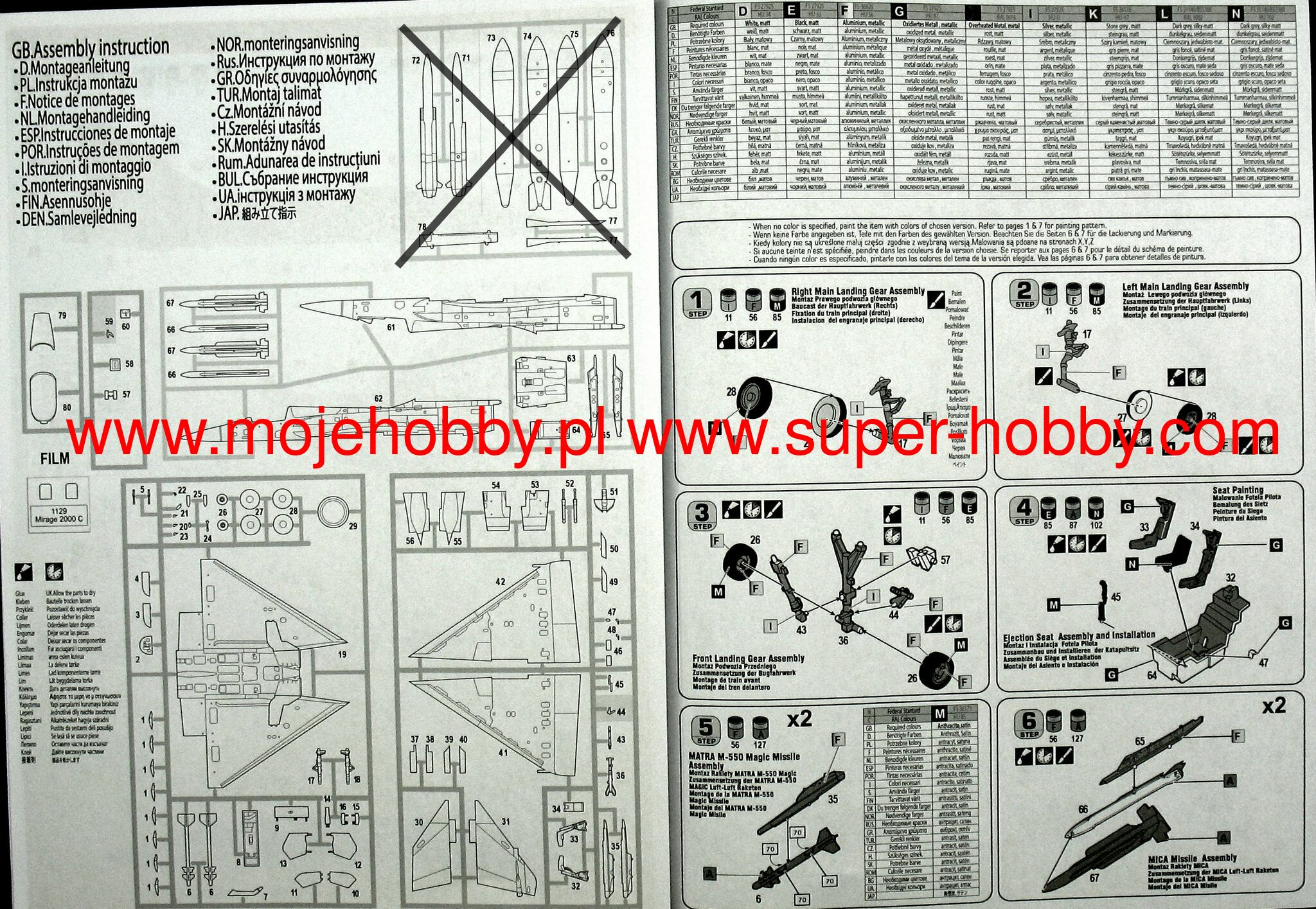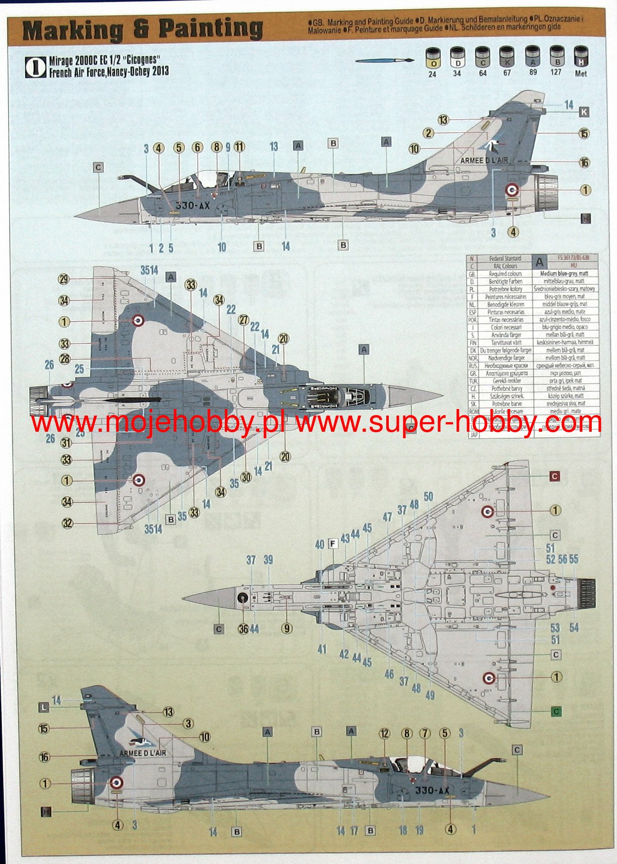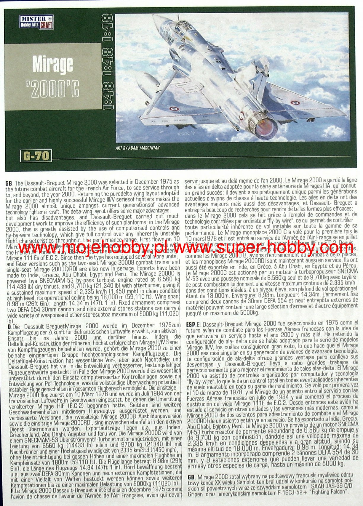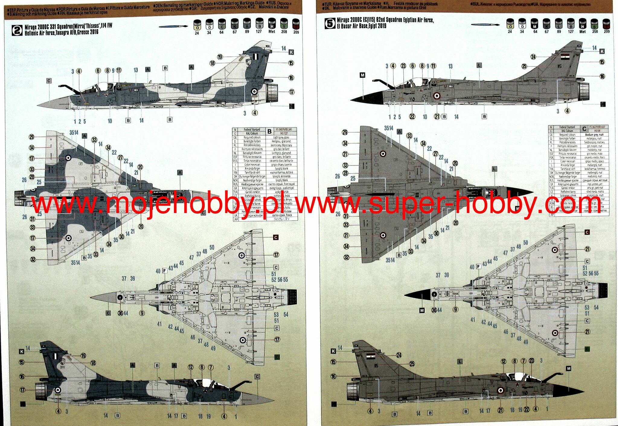 Note: Comany Mistercraft frequently changes, without any notice, the decals that come with the model, so they may differ from the photos and descriptions on our website. If you need a specific version, please let us know about that by entering the appropriate notice in the comments field when placing the order. The Dassault Mirage 2000 is a French, single-engine fighter-attack aircraft with delta wings in a low wing configuration. On December 18, 1975, the French government supported the launch of the new Dassault Mirage 2000 program, an aircraft as small as possible and with a 1: 1 weight-to-thrust ratio, using the SNECMA M53-3 engine. Mirage 2000 reverts to the triangular wing concept. Thanks to the fly-by-wire control and the location of the center of gravity far back, the plane was very maneuverable. The experience gained with the Mirage III resulted in an increase in the wing area, which resulted in a lower surface load and guaranteed better flight performance at low speeds. The use of an automatically lowered leading edge associated with the movement of ailerons resulted in a change of profile, which further increased performance and controllability at low speeds. Five prototypes were built. The first flew on March 10, 1978, and the fifth - Mirage 2000B (two-seater training version) in October 1980. The first serial Mirage 2000C flew on November 20, 1982. An interesting version is also the Mirage2000N, capable of carrying nuclear weapons. According to Dessault Mirage 2000, it is capable of intercepting a target flying at an altitude of 25,000 meters at 3Ma within four minutes after take-off from the airport. Mirage 2000 is equipped with military aviation, among others. in France, Greece, India, Brazil. Technical data (Mirage 2000C version): length: 14.36m, wingspan: 9.13m, height: 5.2m, maximum speed: 2.35Ma, climb speed: 284m / s, maximum range (with overhead tanks): 3335km , maximum ceiling 18000m, equipment: fixed - two 30mm DEFA 554 cannons, suspended - up to 6000 kg of cargo.