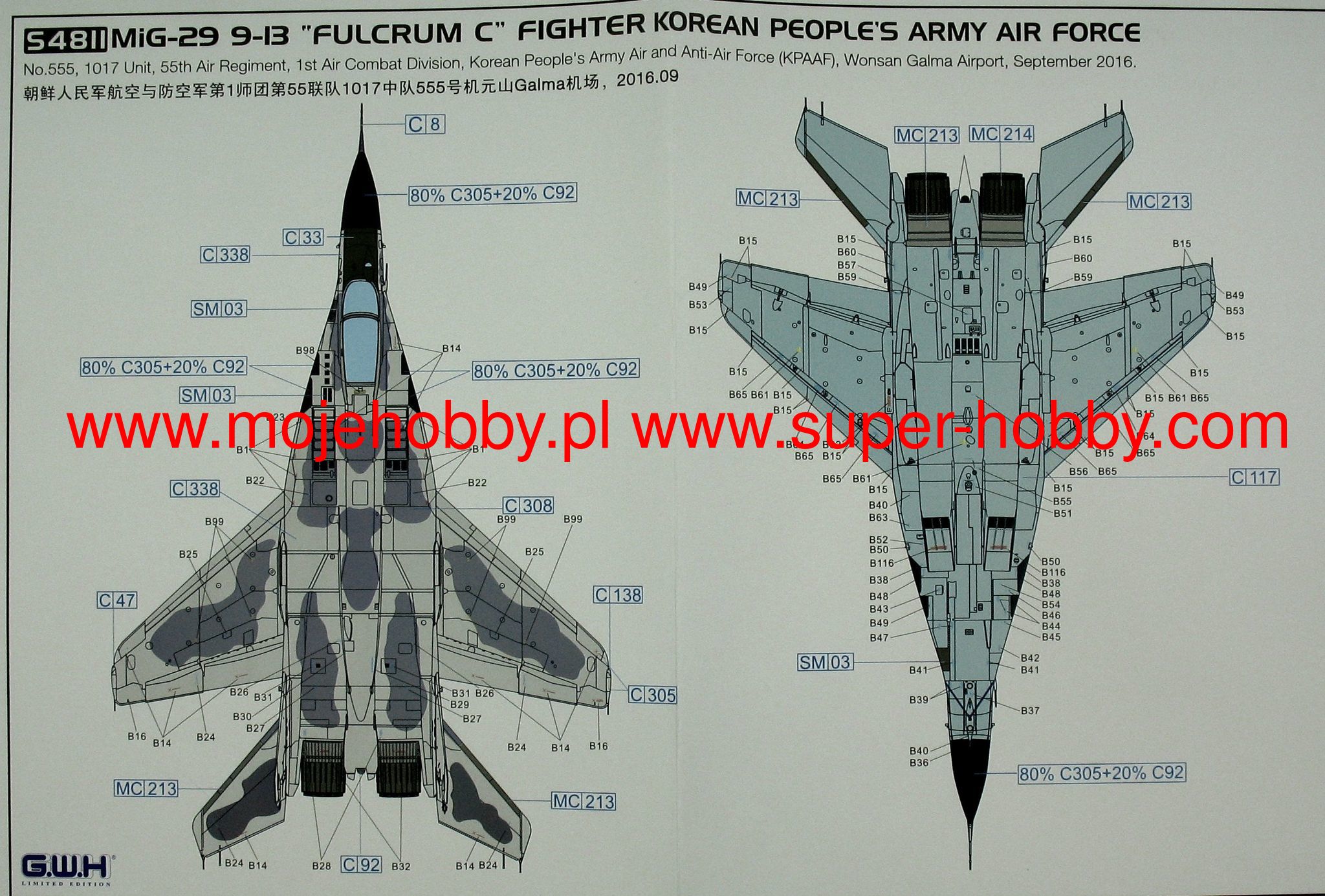 Mikojan-Guriewicz MiG-29 (NATO: Fulcrum) to sowiecki, dwusilnikowy, ciężki myliwiec frontowy IV generacji ze skrzydłami trapezowymi, pasmowymi. Już sama iloć ponad 1000 MiG-ów 29 wyprodukowanych pomiędzy 1977 a 1992 rokiem wiadczy o potencjalnych możliwociach tego samolotu. W istocie trzeba go zaliczyć do grona 3 lub 4 najważniejszych aktualnie pozostajšcych w czynnej służbie myliwców wiata IV generacji. MiG-29 został zaprojektowany w latach 70-tych jako konstrukcja mogšca się równać a nawet przewyższać możliwociami bojowymi myliwce z wrogiego wówczas obozu zachodniego. I rzeczywicie trzeba przyznać, że nie ustępuje w niczym np. F-16, a wieloma elementami np. potężnym, dwusilnikowym napędem przewyższa amerykańskiego konkurenta. Jako, że MiG-29 został skonstruowany z mylš o jak najszybszej obsłudze nawet w warunkach polowych i przez mechaników o minimalnym dowiadczeniu to wszelkie naprawy rzeczywicie mogš być przeprowadzone w błyskawicznym tempie. Trudno to sobie wyobrazić ale 5 mechaników jest w stanie wymienić i przetestować silnik w mniej niż godzinę! Na tym nie kończš się niezwykłe możliwoci Fulcruma. W razie problemów z napędem nawet w pełni załadowany może on wystartować używajšc jednego silnika, by następnie już w powietrzu odpalić drugi. Stałe uzbrojenie MIG-a 29 stanowi znane z precyzyjnoci działko 30mm GSh-301. Na węzłach zewnętrznych przenoszone za być mogš rakiety powietrze-powietrze AA-10, AA-11 lub AA-8, a do zwalczania celów naziemnych UB-32-57 czy niekierowane ale większe S-8K.MiG-29 znajduje się na wyposażeniu sił powietrznych nie tylko państw byłego bloku wschodniego ale także wielu innych użytkowników, którzy docenili jego ogromne możliwoci. Powstało kilka wersji tego udanego myliwca. Najważniejsze z nich to min. pierwsza produkowana seryjnie, czyli MiG-29 (Fulcrum-A) z radarem S-29 Topaz oraz systemem optoelektronicznym OEPrNk-29. Inna wersja rozwojowa to MiG-29M (Fulcrum-E) z radarem S-29M Żuk o większym zasięgu oraz lepszym systemem naprowadzania i celowania. Zastosowano także mocniejsze silniki RD-33K, zamiast RD-33. Zastosowano również system fly-by-wire. Dane techniczne: długoć: 17,37m, rozpiętoć skrzydeł: 11,4m, wysokoć: 4,73m, prędkoć maksymalna: 2400km/h, prędkoć wznoszenia: 330m/s, zasięg maksymalny: 2100km, pułap maksymalny 18000m, uzbrojenie: stałe-1 działko GSh-301 kal.30mm, podwieszane (wersja M)-do 5000 kg ładunku. Co oprócz modelu będę potrzebować do jego sklejenia?