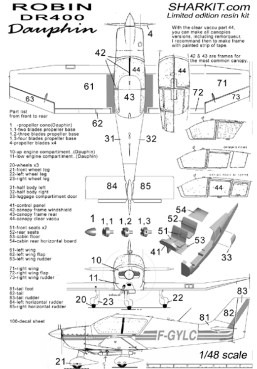 Robin DR400 современный французский спортивно-туристический самолет, деревянной конструкции, с неубирающимся трехместным шасси, в конфигурации с низкорасположенным крылом. Полет прототипа состоялся в 1972 г., в ходе серийного производства было создано более 1290 машин этого типа. Самолет в версии DR400/180 имеет длину 6,96 метра при размахе крыла 8,72 метра. Привод обеспечивается одним двигателем Lycoming O-360 мощностью 180 л.с. Максимальная скорость составляет около 280 км/ч. Robin DR400 был разработан двумя французскими авиаконструкторами, Пьером Робином и Жаном Делемонтезом, как развитие моделей DR200 и DR250. Модель DR400 отличается трехопорным шасси, слегка загнутыми вверх крыльями и полностью деревянной конструкцией, что не только снижает себестоимость производства, но и делает самолет относительно легким. Более того, Robin DR400 считается удачным самолетом, очень простым в управлении, экономичным в эксплуатации и пригодным для модернизации. Кроме того, во время полета он издает мало шума.
