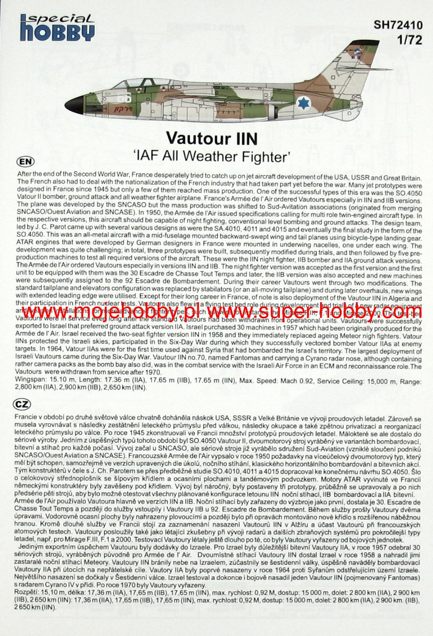 The Sud Aviation Vautour was a French Cold War fighter, bomber and attack aircraft. The flight of the prototype of the machine took place in 1952, and the machine entered the line in 1958. About 150 aircraft of this type were built in the course of serial production. The drive was provided by two motors SNECMA Atar turbojets . The aircraft reached a maximum speed of 1,100 km / h. The deck was armed with 4 30 mm DEFA cannons. Sud Aviation Vautour was commissioned by the French Air Force, which at the turn of the 1940s and 1950s reported a demand for a multi-role jet plane. The new machine was characterized by good performance at that time, good maneuverability and a very long operating range of up to 5400 km! Three main versions of the Vautour were produced in the course of serial production. The first was the Vautour IIA version, which was a single-seat assault version. Later, the Vautour IIB model appeared, which was a two-seater bomber version with a bomb bay in the fuselage. The third version was the Vautour IIN - it was a two-seat hunting version equipped with a radar and capable of operating in all weather conditions. Later the designation was changed to Vautour II-1N. This type of aircraft was withdrawn from the French air force by 1979. Apart from France, Israel was the only user of Sud Aviation Vautour aircraft.