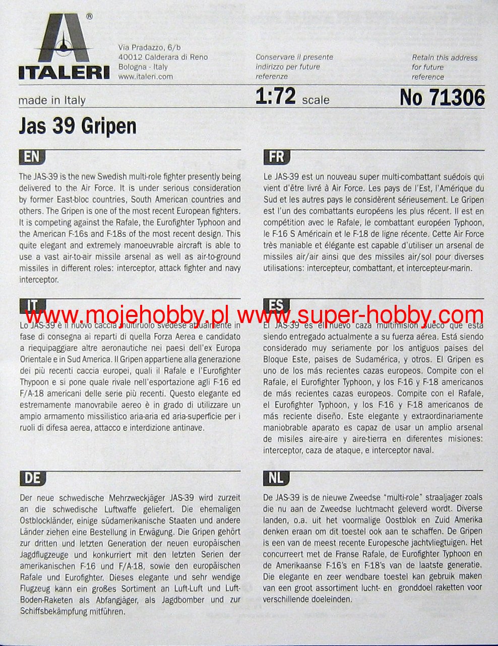 Saab JAS-39 Gripen to szwedzki, jednosilnikowy myliwiec wielozadaniowy w układzie kaczki i o układzie redniopłata. W 1980 roku rzšd Szwecji podjšł uchwałę o rozpoczęciu programu badawczego, którego celem byłoby opracowanie następcy samolotu AJ-37 Viggen. Projekt techniczny wykonano w czerwcu 1981 r. Po akceptacji strona rzšdowa złożyła w maju 1982 r. zamówienie na opracowanie prototypów i wykonanie 140 sztuk JAS-39 Gripen ("Gryf"). Trzy miesišce póniej rozpoczęto próby w locie elektrycznego układu sterowania (fly-by-wire) zamontowanego na specjalnie do tego przystosowanym Viggenie. Prace nad prototypami rozpoczęto w roku 1984. Pierwszy z nich opucił halę montażowš 26 kwietnia 1986 roku. Z powodu wielu trudnoci z układem sterowania oblot nastšpił dopiero 9 grudnia 1988 roku, 18 miesięcy po planowanym terminie. Podczas szóstego z kolei lotu, 2 lutego 1989 r., przy podejciu do lšdowania Gripen przechylił się w lewo i zawadził skrzydłem o pas lotniska. Przyczynš wypadku była nadmierna czułoć owego nieszczęsnego układu "fly-by-wire". Do czerwca 1991 oblatano trzy następne prototypy, na których testowano ulepszony układ sterowania, systemy nawigacyjne i uzbrojenia oraz silnik i awionik. Katastrofa na pokazach w dniu 8 sierpnia 1993 roku była powodem kolejnych zmian - tym razem oprogramowania układu sterowania. 4 marca 1993 oblatano pierwszy seryjny egzemplarz JAS-39A (wersji jednoosobowej). Przekazanie go siłom zbrojnym Szwecji miało miejsce 8 czerwca 1996 roku. Ogółem do końca 1996 roku lotnictwo szwedzkie ma 30 samolotów "Gripen" A. Obecnie trwajš intensywne próby obejmujšce loty na dużych kštach natarcia. Przewiduje się także wprowadzenie nowszej wersji oprogramowania układu sterowania przewodowego we wszystkich eksploatowanych i produkowanych w przyszłoci maszynach. Do lipca 2002 roku do Flygvapnet zostało przekazanych 122 samolotów Gripen. 6 wrzenia 2002 roku został przekazany pierwszy JAS-39C Gripen. Dane techniczne (wersja JAS-39C): długoć: 14,1m, rozpiętoć skrzydeł: 8,4m, wysokoć: 4,5m, prędkoć maksymalna: 2200km/h, zasięg maksymalny: 3200km, pułap maksymalny 15200m, uzbrojenie: stałe- pojedyncze działko Mauser BK-27 kal. 27mm, podwieszane- najczęciej 6 pocisków AIM-9 Sidewinder. Co oprócz modelu będę potrzebować do jego sklejenia?