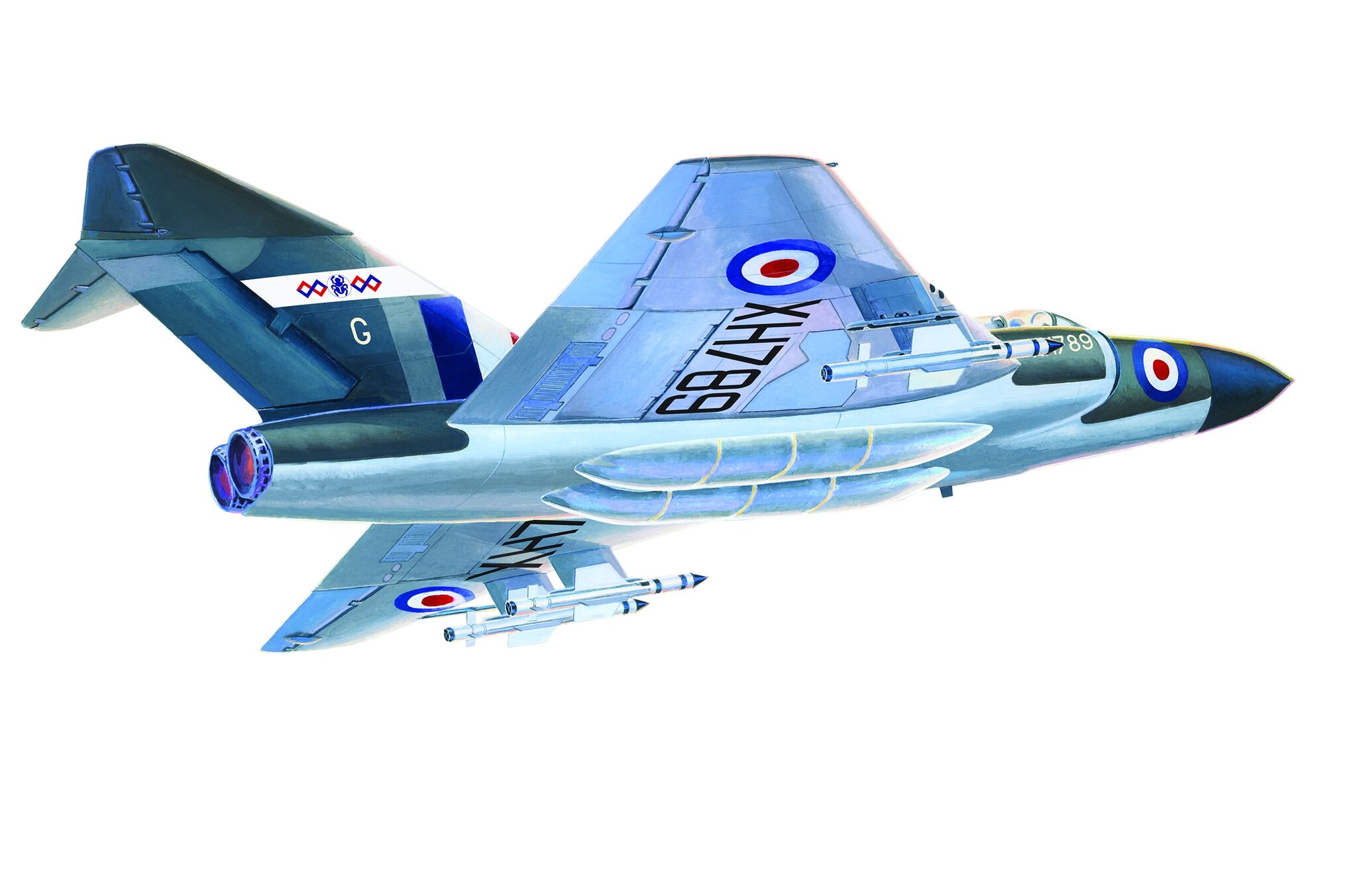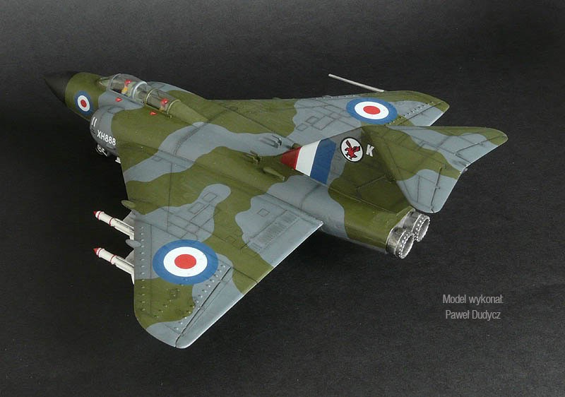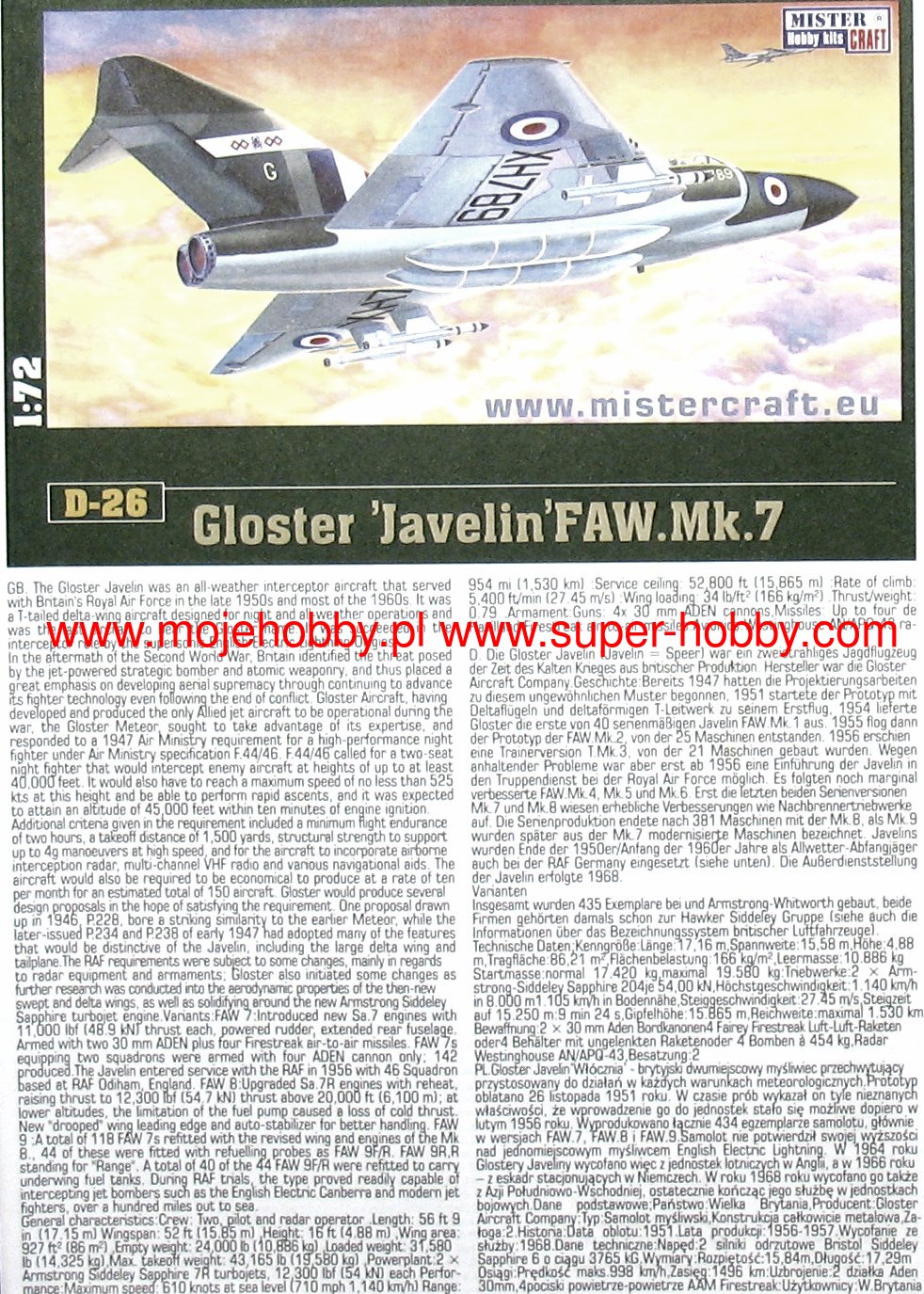 Note: Comany Mistercraft frequently changes, without any notice, the decals that come with the model, so they may differ from the photos and descriptions on our website. If you need a specific version, please let us know about that by entering the appropriate notice in the comments field when placing the order. The Gloster Javelin is a British jet-propelled two-seater twin-engine interceptor. Parallel to the development of the Meteor aircraft, the Gloster company was working on a modern delta-wing jet fighter called Javelin, which was flown in November 1951. Due to its layout, the Javelin had slightly different properties from classic aircraft, especially longitudinal stability at low speeds. Due to numerous doubts related to this in the design office of the plant and subsequent modifications, the first Javelins were delivered to the RAF in 1956. where they served as high-altitude interceptors until 1961. Ultimately, the aircraft did not prove its superiority over the Lightning aircraft, and was permanently decommissioned in 1964-1968. The most widely produced versions are FAW.7, FAW.8 and FAW.9. Technical data (version FAW.9): length: 17.15 m, wingspan: 15.85 m, height: 4.88 m, maximum speed: 1140 km / h, climb speed: 27.5 m / s, maximum range: 1500 km, weapons : fixed - 4 30mm ADEN cannons, outboard - usually four de Havilland Firestreak air-to-air missiles.