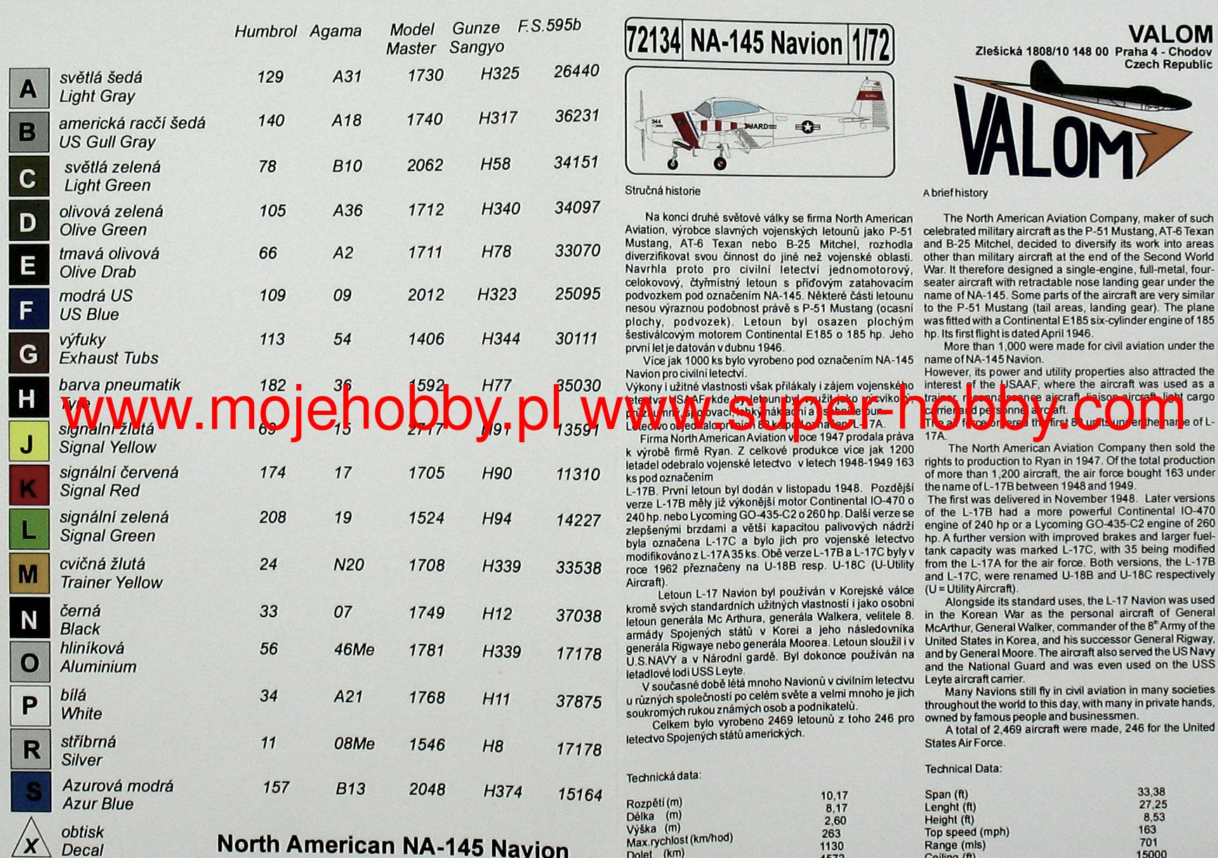 North American NA-145 Navion американский лёгкий низкоплан времен холодной войны. Полет прототипа состоялся вскоре после окончания Второй мировой войны, и в 1946-1947 годах было построено около 1100 экземпляров этого самолета. В версии Navion A привод обеспечивался одним двигателем. Continental E-185-3 мощностью 205 л.с. Машина была около 8,3 метра в длину с размахом крыла около 10,2 метра. Максимальная скорость составляла до 257 км/ч. Представленный самолет разработан на заводах North American Aviation, предназначен в первую очередь для американского гражданского рынка, как легкая и, возможно, дешевая в покупке и эксплуатации пассажирская и транспортная машина. Интересно, что изначально он назывался НА-143, которое, однако, с запуском производства было изменено на НА-145. Однако самолет относительно быстро вызвал интерес ВВС США, которые также разместили заказ на эту машину. В ВВС США NA-145 служил под обозначением NA-154 и L-17, где использовался как легкая машина связи и как учебно-тренировочная машина для адептов. Учебный корпус офицеров запаса. Стоит добавить, что с 1948 года самолет производился и разрабатывался заводами Ryan Aeronautical Company.