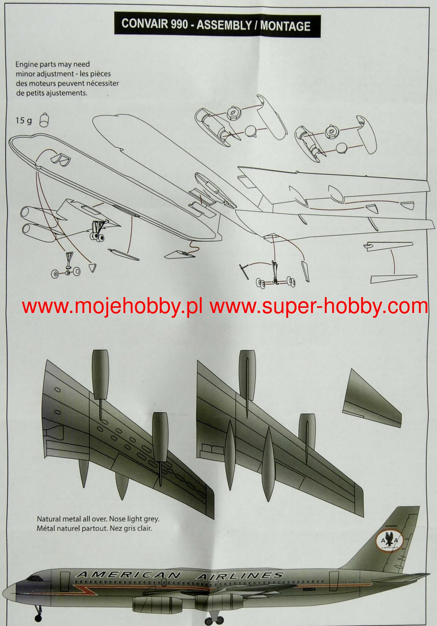 The Convair 990 Coronado was an American airliner that was first flown in 1961 and entered service a year later (1962). The machine, in the 990A version, was 42.6 meters long with a wingspan of 37 meters. The propulsion was provided by 4 General Electric CJ-805-23B turbojet engines with a thrust of 71.4 kN each. The maximum speed was 0.87 Ma. The machine was able to carry up to 149 passengers. In total, only 37 examples of this machine were built. The 990 model was developed by Convair shortly after the failure of the 880 model on the market. Initially, the main user of the aircraft was to be American Airlines, which sought to obtain the aircraft as fast as possible, with favorable operating economy and a range that would allow flights between the west and east coast of the USA without stopping . Convair's works on the new plane were based on the general assumptions of the 880 model, but they used new engines, the wing geometry was significantly changed, the fuselage was extended, and the aerodynamic properties of the whole structure were significantly improved. However, after the test flights, it turned out that Convair 990 would not meet the customer's expectations, which resulted in an increase in project costs and extension of research and development works. Although the 990 model was sold to such airlines as American Airlines or Swissair, the entire project turned out to be a spectacular financial failure of Convair.