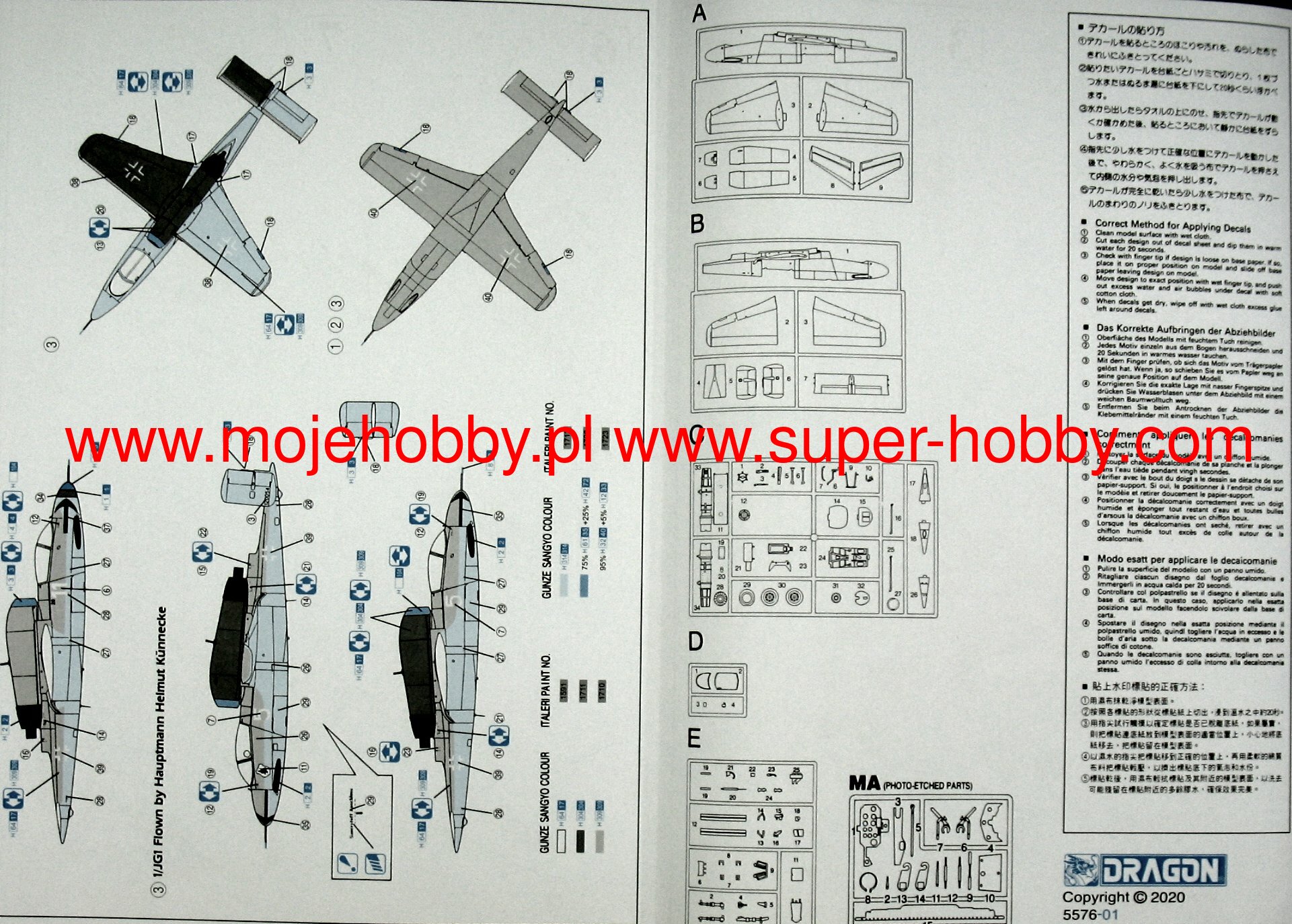 Heinkel He-162 Salamander to niemiecki, jednomiejscowy, jednosilnikowy myliwiec odrzutowy z końcowego okresu II wojny wiatowej. Oblot prototypu miał miejsce 6 grudnia 1944 roku. He-162 okazał się zwycięzcš na tzw. myliwiec ludowy (niem. Volksjäger), który miał zabezpieczyć niemieckie niebo przed atakami alianckich ciężkich bombowców. Samolot miał nietypowy układ z silnikiem (MW 003E-1 lub E-2) umieszczonym na górze, na kadłubie, z krótkimi trapezowymi skrzydłami oraz bardzo aerodynamicznš sylwetkš. Podobnie jak Me-262 stanowił jedne z kroków milowych w rozwoju lotnictwa. Do końca wojny wyprodukowano jednak tylko ok.300 samolotów tego typu, a na niewielkš skalę były wykorzystywane bojowe w kwietniu i maju 1945 roku. Dane techniczne: długoć: 9,05m, rozpiętoć skrzydeł: 7,2m, wysokoć: 2,6m, prędkoć maksymalna: 790km/h, prędkoć wznoszenia: 23,4m/s, zasięg maksymalny: 975km, pułap maksymalny 12000m, uzbrojenie: stałe-2 działka MG151/20 kal. 20mm. Co oprócz modelu będę potrzebować do jego sklejenia?
