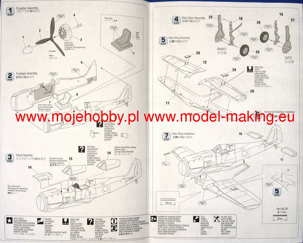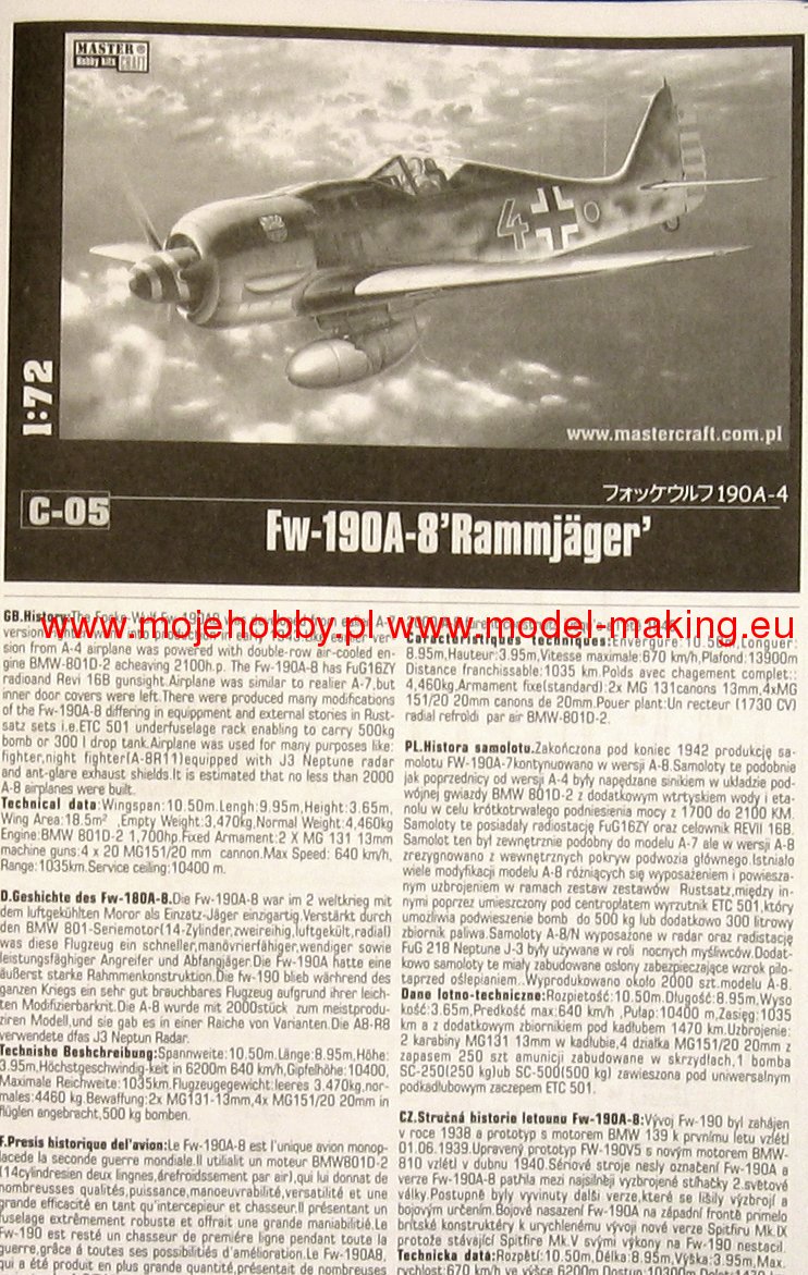 Focke-Wulf Fw-190 немецкий одномоторный цельнометаллический истребитель с крытой кабиной в конструкции низкоплана времен Второй мировой войны. Пилоты считали Fw-190 лучшим самолетом, чем Messerschmitt Bf-109. Отдельно стоящее низкоплан с работающим покрытием Fw-190 было заказано Luftfahrtministerium, собрано осенью 1937 года. Курт Танк представил два предложения по силовым установкам первое с двигателем Daimler-Benz DB 601 жидкостного охлаждения, а второе с новым звездообразным двигателем BMW 139. Был выбран последний, и начатые весной 1938 года работы возглавил Оберинг. Р. Блазер. Первый прототип Fw-190V1 был готов в мае 1939 года, а 1 июня 1939 года капитан Ганс Сандер поднял его в воздух в Бремене. Второй прототип, FW-190V2, вооруженный двумя пулеметами MG131 и двумя пулеметами MG17 калибра 7,92 мм, поднялся в воздух в октябре 1939 года. Чтобы уменьшить аэродинамическое сопротивление, оба были оснащены туннельным воздухозаборником в крышке воздушного винта, но проблемы с перегревом двигателя привели к возврату к проверенной конструкции щитка NACA. Прежде чем окончательно начались испытания этих прототипов, уже было принято решение о замене двигателя BMW 139 на более мощный, но более длинный и тяжелый BMW 810. Это потребовало множества изменений, усиления конструкции и перемещения кабины назад, что впоследствии стало источник проблем с центром тяжести. Преимуществом было снятие проблем с проницаемостью выхлопных газов и перегревом салона из-за его непосредственной близости к двигателю BMW 139. От третьего и четвертого прототипов отказались, а в начале достроили Fw-190V5 с новым двигателем 1940 года. Позже он получил крылья с увеличенным на один метр размахом (с исходных 9,5 м), что сделало его медленнее на 10 км/ч, но зато повысило скороподъемность и улучшило маневренность. Он получил обозначение Fw-190V5g, а вариант с более коротким крылом Fw-190V5k. Первые семь машин информационной серии Fw-190A-0 имели короткое крыло, остальные более длинное. Первая оперативная часть, оснащенная Fw-190 6./JG 26, дислоцированная в Ле-Бурже, заявила о своей оперативной готовности в августе 1941 г., и с первой же встречи нового истребителя с британскими Supermarine Spitfire стало очевидным его преимущество перед ними. Во время войны было создано около дюжины модификаций этого великого самолета. Машины версии А вместе с десятком-другим модернизаций служили истребителями. Версии с маркировкой В и С были лишь прототипами высотных истребителей, предназначенных для борьбы со стратегическими бомбардировщиками, но в серийное производство не поступали. Вариант D, как единственный из Fw-190, был оснащен новым двигателем Jumo 213A мощностью 1750 л.с. и был немецким ответом на P-51 Mustang. Новый двигатель удлинил фюзеляж на несколько десятков сантиметров. Этот вариант также выполнял в основном охотничьи и высотные истребительные задачи. Многочисленные варианты версии F использовались как истребители-бомбардировщики для непосредственной поддержки на поле боя. Версия G играла ту же роль, что и версия F, но имела больший радиус действия. За всю войну было выпущено более 20 000 экземпляров этого одного из лучших истребителей Второй мировой войны. Технические данные (вариант Fw-190A-8): длина: 9м, размах крыла: 10,51м, высота: 3,95м, максимальная скорость: 656км/ч, скороподъемность: 15м/с, максимальная дальность: 800км, максимальный потолок 11410м, вооружение : исправлено - 2 13-мм пулемета MG131 и 4 20-мм пу