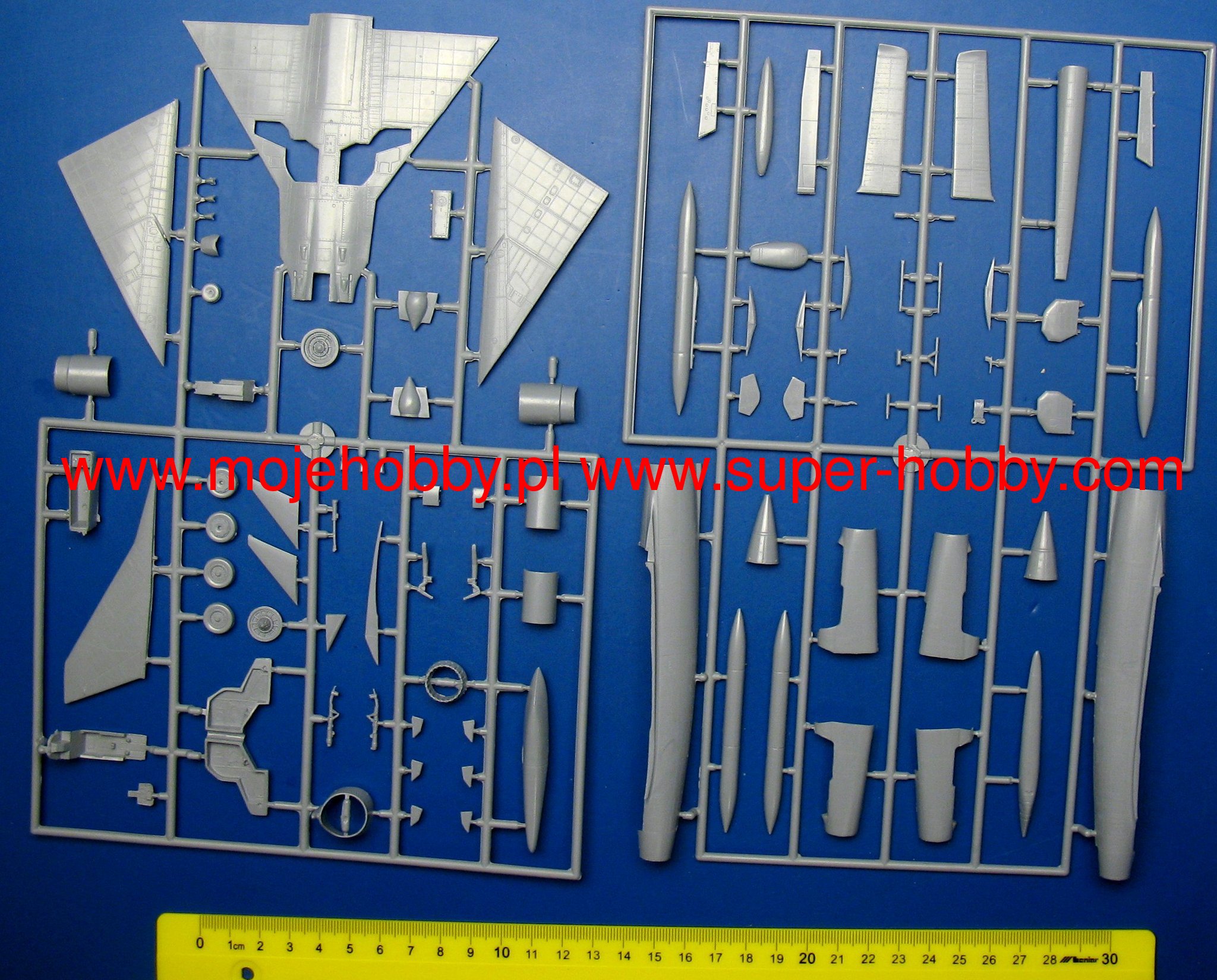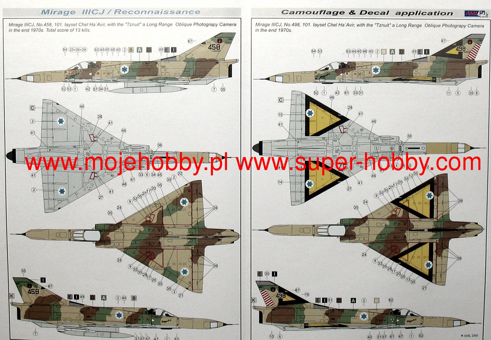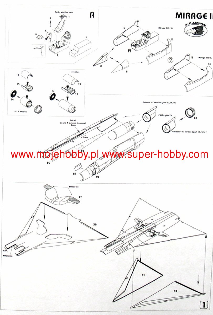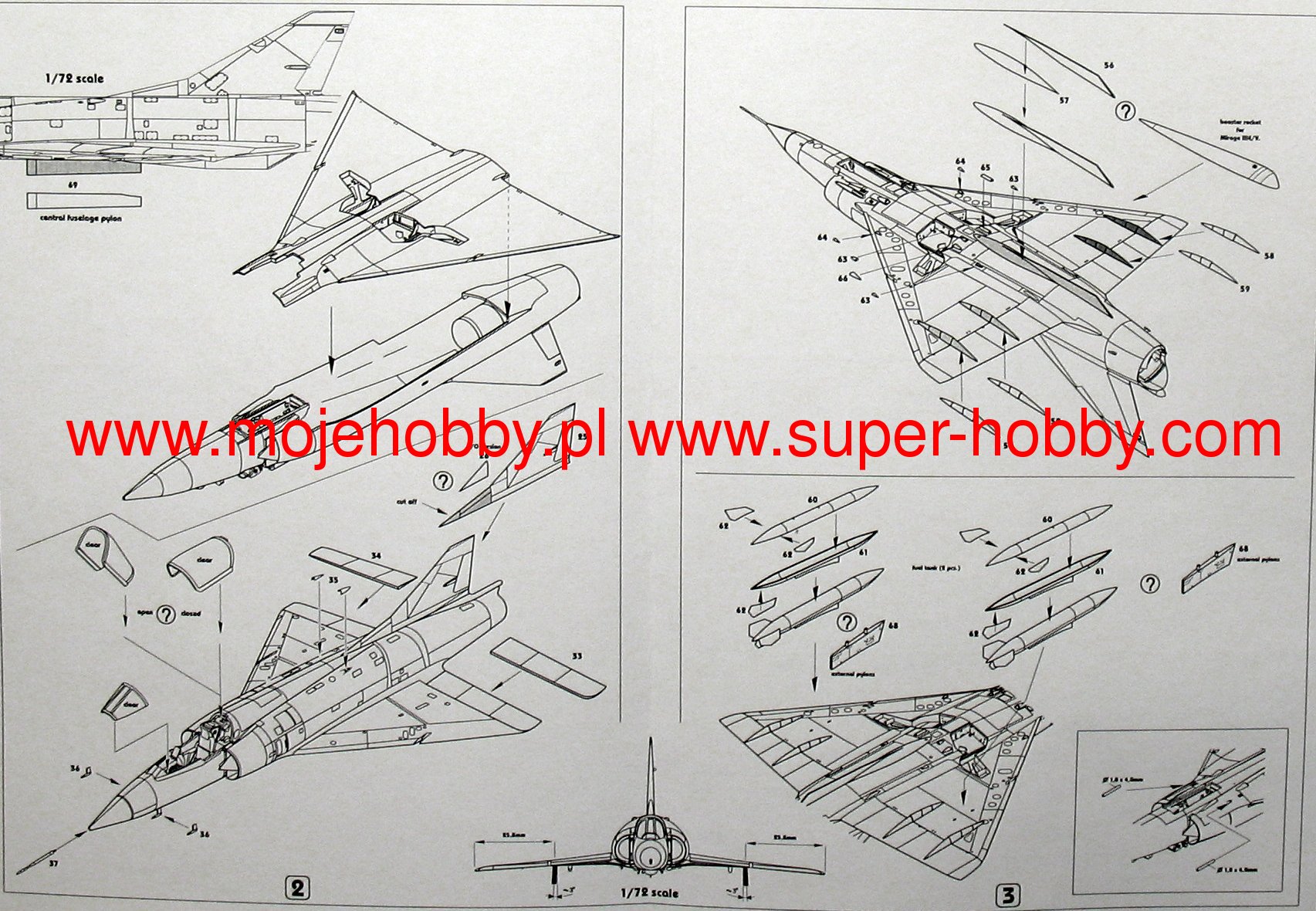 Dassault Mirage III/5/50 to francuski, jednosilnikowy samolot myœliwsko-szturmowy z płatem w układzie delta, bez usterzenia poziomego. Pod koniec 1955 roku firma Dassault przystšpiła do budowy pojedynczego prototypu, w którym zachowano skrzydło delta połšczone z powiększonym kadłubem mogšcym pomieœcić jeden silnik SNECMA Atar 101G1. Powstały w ten sposób Mirage III-001 został oblatany 17 listopada 1956 roku, by już po dwóch miesišcach osišgać w locie prędkoœć 1,52Ma. Zastosowanie ręcznie sterowanych stożków w stałych wlotach bocznych oraz silnika Atar 101G2 o cišgu zwiększonym do 4490kg, pozwoliło zwiększyć prędkoœć do 1,65Ma, a póŸniej przez użycie rakietowego przyœpieszacza SERP - do 1,8Ma. By uzyskać jak największš prędkoœć Dassault zmodyfikował skrzydło i po pierwszym oblocie 12 maja 1958 roku Mirage IIIA osišgnšł z dodatkowym silnikiem rakietowym prędkoœć 2,2Ma. Doprowadziło to do uruchomienia produkcji dwumiejscowej wersji treningowej z miejscami w tandem – Mirage IIIB i jednomiejscowego myœliwca przechwytujšcego Mirage IIIC. Ta ostatnia wersja miała zabudowany radar Cyrano AI, a dwa działka kalibru 30mm mogły być wspierane przez pociski rakietowe klasy powietrze-powietrze Matra R.530 lub AIM-9 Sidewinder. Następnš ważnš wersjš był myœliwsko-bombowy Mirage IIIE dalekiego zasięgu, z silnikiem Atar 9C zabudowanym w nieco przedłużonym kadłubie. Wersja ta miała zabudowany radar Cyrano II, który w połšczeniu z radarem Dopplera i układem nawigacyjnym TACAN pozwalał przeprowadzić atak na małej wysokoœci bez widzialnoœci celu w każdych warunkach atmosferycznych. Programy modyfikacyjne Mirage III ( oraz pochodnych V i 50 ) zawierajš zabudowę nowoczesnych układów nawigacyjnych, sterowania uzbrojeniem i przystosowania do nowoczesnych typów uzbrojenia. Drugim obszarem modyfikacji jest zabudowa silników Atar 9K-50 o cišgu większym o około 20%, przystosowanie do scentralizowanego tankowania pod ciœnieniem i uzupełniania paliwa w czasie lotu, zabudowa foteli katapultowych klasy zero-zero, polepszenie widzialnoœci z kabiny, instalacja przednich powierzchni sterowych podnoszšcych manewrowoœć w walce powietrznej, przystosowanie do przenoszenia zasobników np. do walki elektronicznej, laserowego oznaczania celów, rozpoznania czy zobrazowania celów w podczerwieni. Dane techniczne (wersja IIIC): długoœć: 14,77m, rozpiętoœć skrzydeł: 8,22m, wysokoœć: 4,25m, prędkoœć maksymalna: 2,2Ma, prędkoœć wznoszenia: 83m/s, zasięg maksymalny (ze zbiornikami dodatkowymi): 4000km, pułap maksymalny 17000m, uzbrojenie: stałe-dwa działka DEFA 552 kal.30mm, podwieszane (Mirage 5)-do 4200 kg ładunku. Co oprócz modelu będę potrzebować do jego sklejenia?