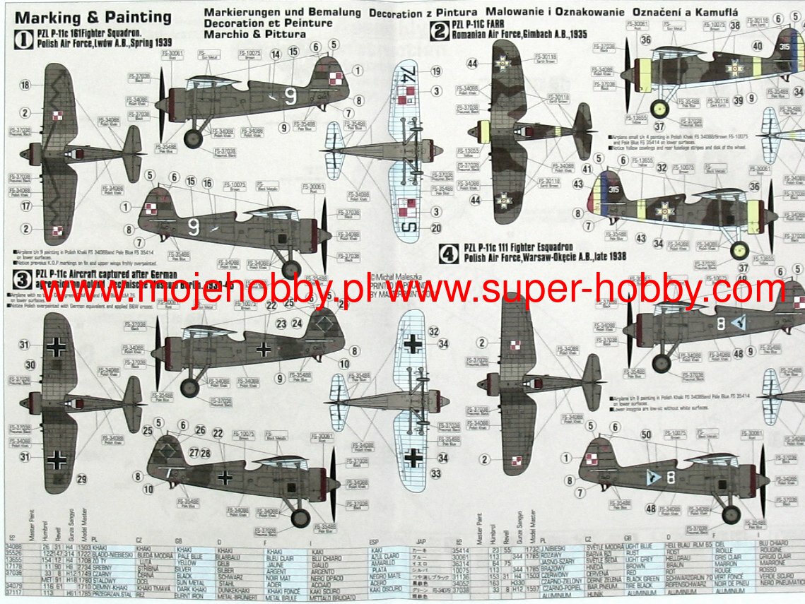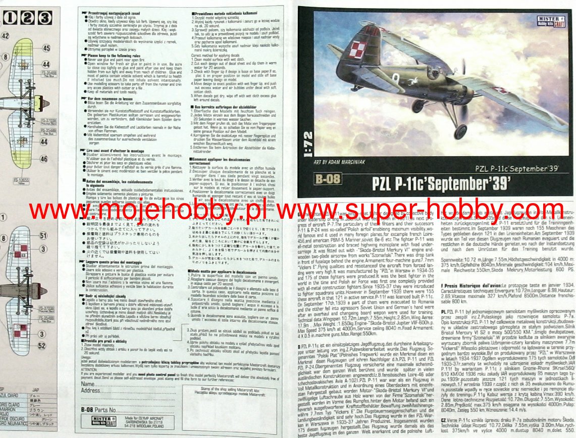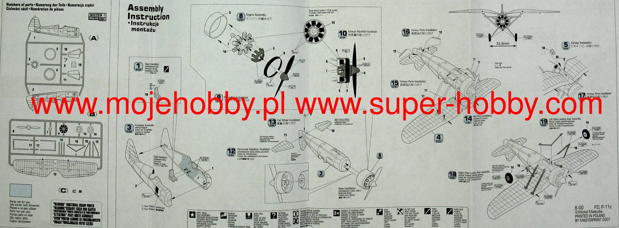 Note: Comany Mistercraft frequently changes, without any notice, the decals that come with the model, so they may differ from the photos and descriptions on our website. If you need a specific version, please let us know about that by entering the appropriate notice in the comments field when placing the order. The PZL P.11a (the so-called eleven) is a Polish, single-engine fighter plane with a metal structure with Puławski wings, a classic tail and a fixed landing gear. The flight of the prototype took place in 1931, but serial production continued in 1937-1939. The first serial version is the PZL P.11a powered by the Bristol Mercury IV S2 engine with a power of 550 HP. However, it was treated as a transitional version and only 50 were ordered. The most famous version of the "eleven" - PZL P.11c - appeared in the summer. It had an improved fuselage, wings and a vertical stabilizer. It all improved the aerodynamics of the plane. The drive unit has not changed. The interest in the construction was expressed by, among others, Romania, where 95 units of the licensed PZL P.11 were manufactured at the IAR plants. At the outbreak of the war, all versions of the P.11 were much slower than their German opponents, but at the same time had greater maneuverability, high rate of climb and a less emergency engine than German planes. They had many victories over the enemy during the September campaign, mainly as part of the Pursuit Brigade. Technical data (version P.11c): length: 7.55m, wingspan: 10.72m, height: 2.85m, maximum speed: 367km / h, rate of climb: 14.5m / s, maximum ceiling: 8000m, range maximum: 550 km, armament: fixed - 2 machine guns wz.33 cal.7.92 mm.
