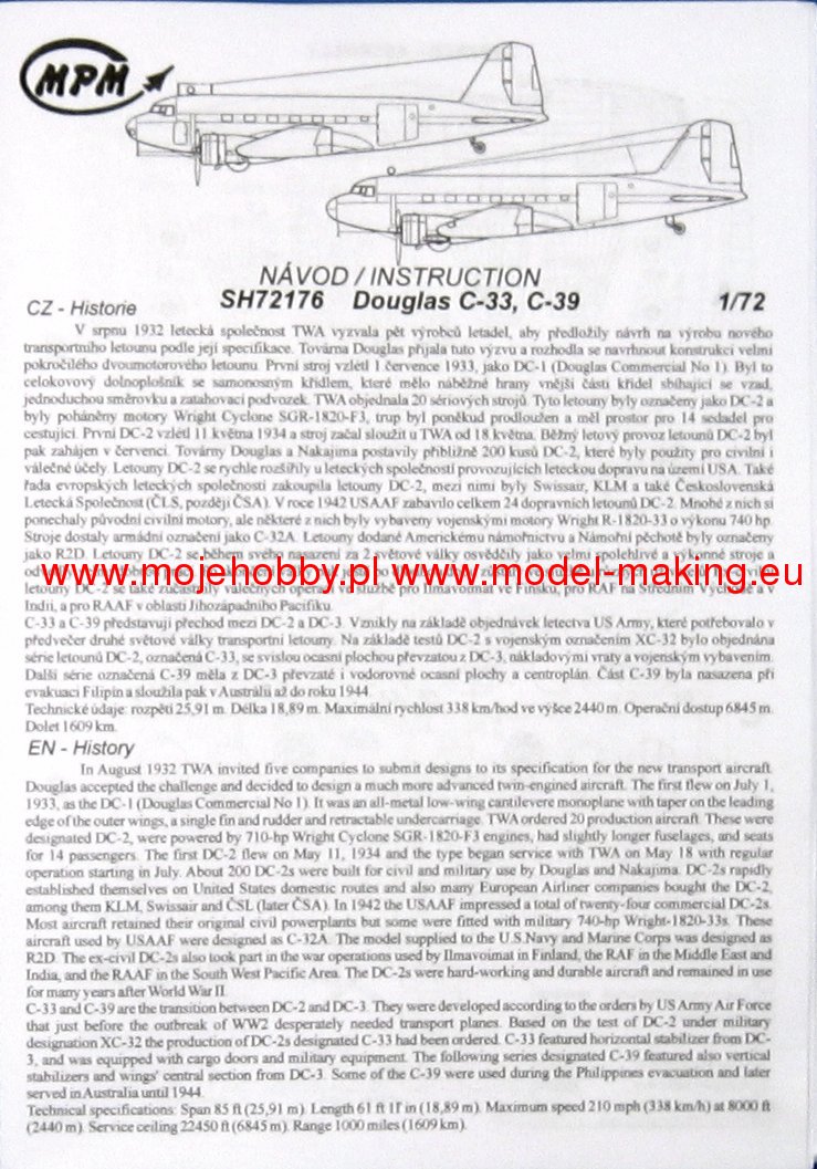 Проект Дуглас стал революцией в области авиации, так как его новая конструкция базировалась на простом, но действенном допущении: к корпусу машины добавлялся только могучий центроплан с параллельными передней и задней кромками, на который накладывались другие , могли размещаться корпуса почти произвольной формы. Так были созданы DC-2, его военная версия C-33, бомбардировщики B-18 Bolo и B-23 Dragon и, наконец, прототип DC-3, т. е. летающий DST (Douglas Sleeper Transport). спальная комната. После этих версий самолет не претерпел серьезных внешних преобразований и за следующие 9 лет в мире было выпущено свыше 13000 внешне очень похожих машин, хотя базовый тип конечно еще как-то дорабатывался и сам Дуглас произвел свыше 25 базовых военных вариантов , не считая гражданских, специальных и самолетов, выпускавшихся по лицензии в СССР и Японии. Douglas C-33 двухмоторный 16-местный грузовой транспортный самолет, военная модификация гражданского авиалайнера Douglas DC-2. Всего было построено 18 (из них 1 впоследствии был переоборудован в С-38). Douglas C-39 двухмоторный 18-местный грузовой транспортный самолет, версия гражданского Douglas DC-2 и 1/2 и военных авиалайнеров C-33 и C-38. Всего было построено 35 (из них 2 позже перестроены в С-42). Технические данные (ДС-2): Максимальная скорость: 338 км/ч, скорость набора высоты: 5,17 м/с, максимальный потолок 6930 м, дальность полета: 1750 км.Проект Дуглас стал революцией в области авиации, так как его новая конструкция базировалась на простом, но действенном допущении: к корпусу машины добавлялся только могучий центроплан с параллельными передней и задней кромками, на который накладывались другие , могли размещаться корпуса почти произвольной формы. Так были созданы DC-2, его военная версия C-33, бомбардировщики B-18 Bolo и B-23 Dragon и, наконец, прототип DC-3, т. е. летающий DST (Douglas Sleeper Transport). спальная комната. После этих версий самолет не претерпел серьезных внешних преобразований и за следующие 9 лет в мире было выпущено свыше 13000 внешне очень похожих машин, хотя базовый тип конечно еще как-то дорабатывался и сам Дуглас произвел свыше 25 базовых военных вариантов , не считая гражданских, специальных и самолетов, выпускавшихся по лицензии в СССР и Японии. Douglas C-33 двухмоторный 16-местный грузовой транспортный самолет, военная модификация гражданского авиалайнера Douglas DC-2. Всего было построено 18 (из них 1 впоследствии был переоборудован в С-38). Douglas C-39 двухмоторный 18-местный грузовой транспортный самолет, версия гражданского Douglas DC-2 и 1/2 и военных авиалайнеров C-33 и C-38. Всего было построено 35 (из них 2 позже перестроены в С-42). Технические данные (ДС-2): Максимальная скорость: 338 км/ч, скорость набора высоты: 5,17 м/с, максимальный потолок 6930 м, дальность полета: 1750 км.Douglas C-33 американский транспортный самолёт периода Второй мировой войны в компоновке хребт-крыло с убирающимся в полёте шасси классической компоновки. Полет прототипа состоялся в 1936 году, в том же году продолжилось серийное производство. В ходе него было создано 18 машин этого типа. Привод обеспечивали два двигателя Райт Р-1820-25 по 750 л.с. Самолет не имел постоянного бортового вооружения. Модель C-33 была разработана компанией Douglas Aircraft Company для ВВС США в качестве опытной версии успешного гражданского самолета DC-2. По сравнению со своим прототипом он имел множество отличий. Во-первых, в качестве силовой установки использовались другие двига