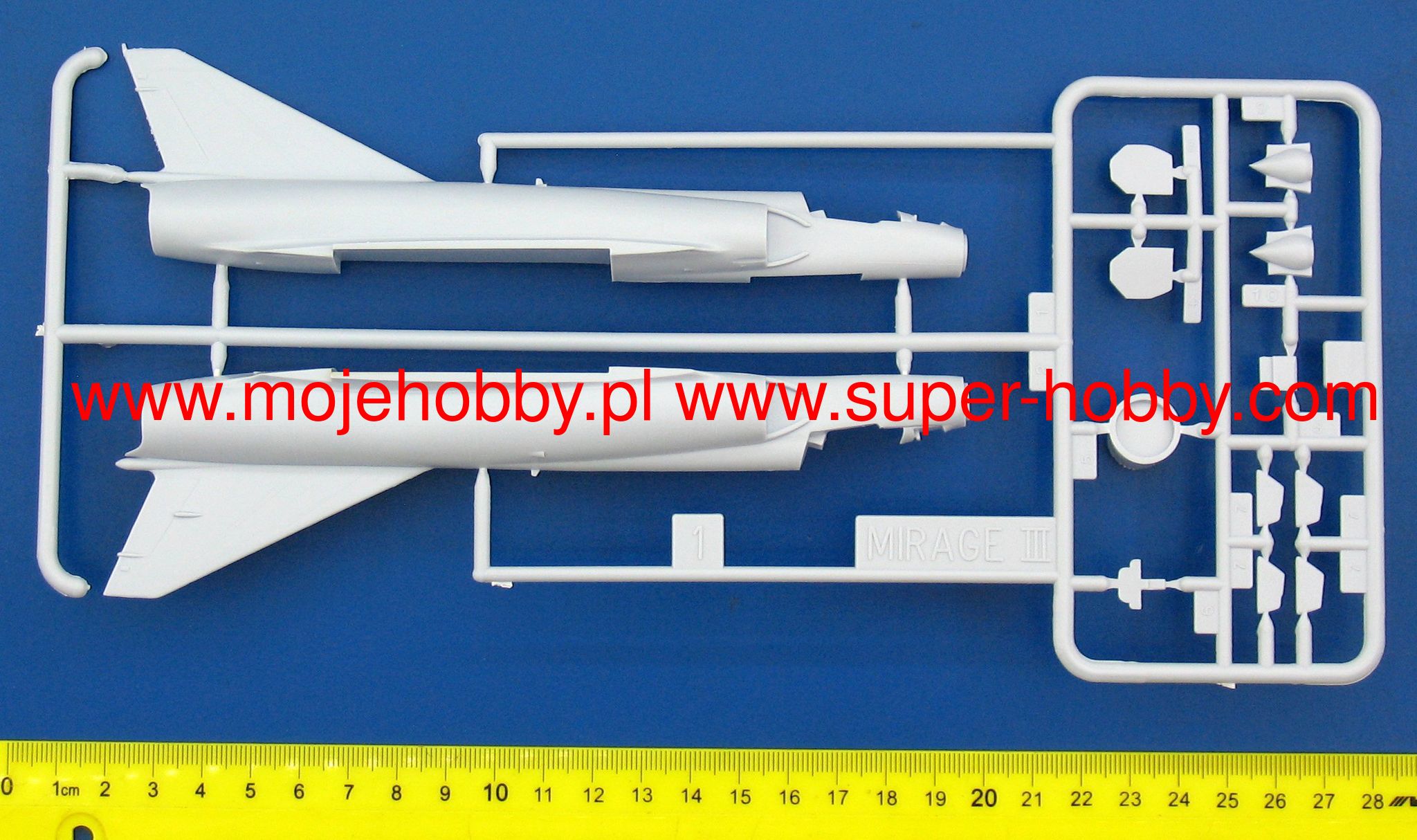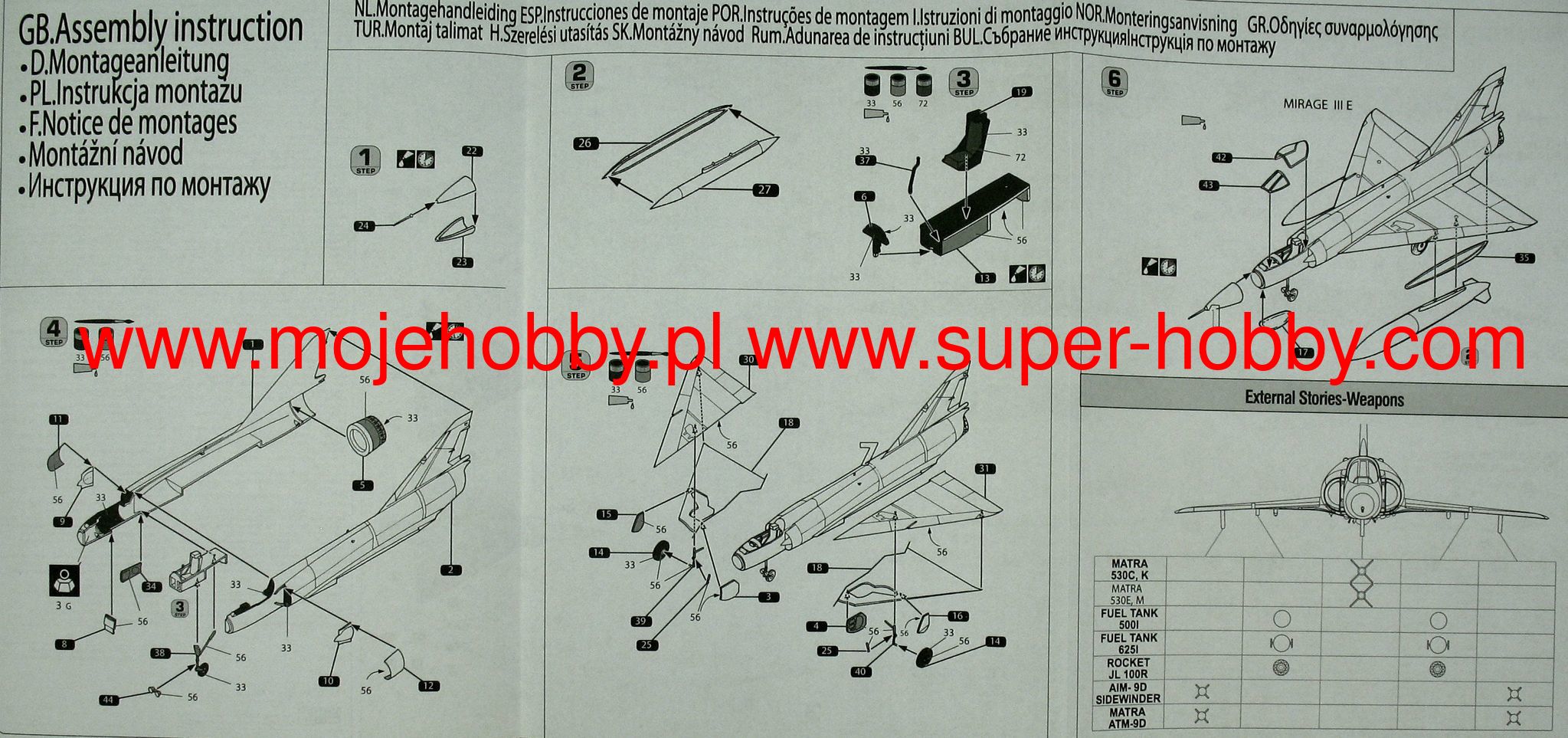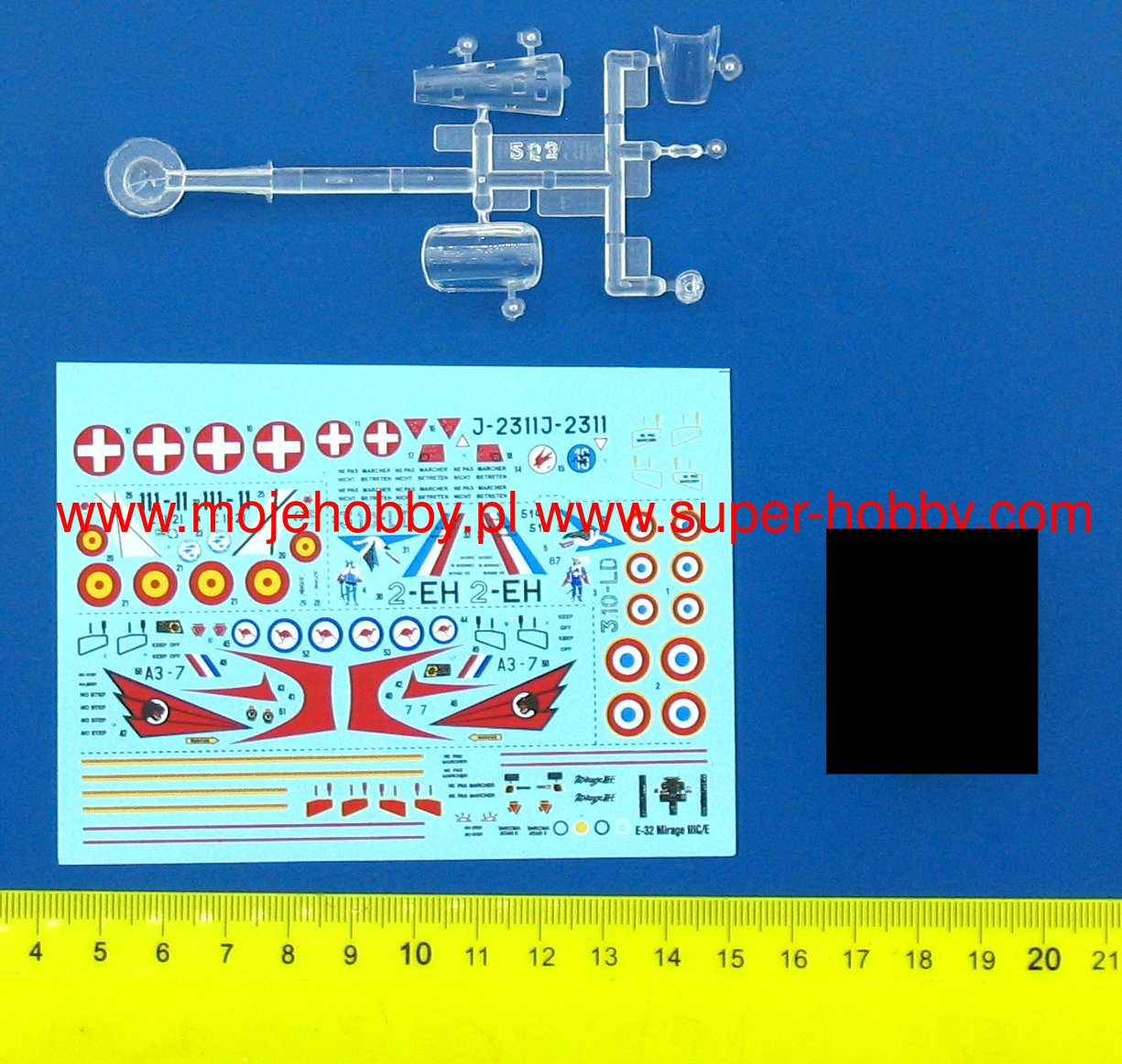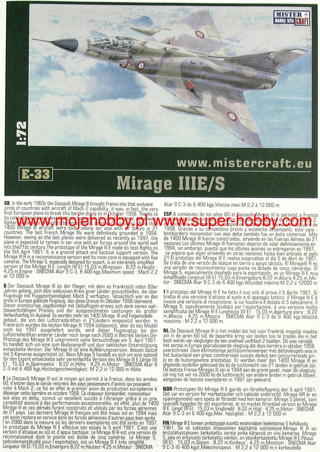Note: Comany Mistercraft frequently changes, without any notice, the decals that come with the model, so they may differ from the photos and descriptions on our website. If you need a specific version, please let us know about that by entering the appropriate notice in the comments field when placing the order. The Dassault Mirage III / 5/50 is a French single-engine fighter-attack aircraft with a delta-shaped lobe, without horizontal tail. In late 1955, Dassault began building a single prototype that retained the delta wing and an enlarged fuselage that could accommodate one SNECMA Atar 101G1 engine. The resulting Mirage III-001 was flown on November 17, 1956, to reach a flight speed of 1.52Ma after just two months. The use of manually controlled cones in fixed side inlets and the Atar 101G2 engine with thrust increased to 4490 kg, allowed to increase the speed to 1.65Ma, and then by using the SERP rocket accelerator - to 1.8Ma. To achieve the highest speed, Dassault modified the wing and after the first flight on May 12, 1958, Mirage IIIA reached the speed of 2.2Ma with an additional rocket engine. This led to the launch of production of the two-seater training version with tandem seats - the Mirage IIIB and the single-seat interceptor Mirage IIIC. The latter version had a built-in Cyrano AI radar, and two 30mm cannons could be supported by Matra R.530 or AIM-9 Sidewinder air-to-air missiles. The next important version was the long-range Mirage IIIE fighter-bomber, with the Atar 9C engine built into a slightly extended hull. This version was equipped with the Cyrano II radar, which, in combination with the Doppler radar and the TACAN navigation system, made it possible to conduct an attack at low altitude without the target's visibility in all weather conditions. Modification programs Mirage III (and derivatives V and 50) include the installation of modern navigation systems, weapons control and adaptation to modern types of weapons. The second area of modification is the installation of Atar 9K-50 engines with a thrust greater by about 20%, adaptation to centralized refueling under pressure and refueling during the flight, installation of zero-zero class catapult seats, improved visibility from the cabin, installation of front control surfaces increasing maneuverability in air combat, adaptation to carrying containers, e.g. for electronic warfare, laser target marking, recognition or infrared imaging of targets. Technical data (version IIIC): length: 14.77m, wingspan: 8.22m, height: 4.25m, maximum speed: 2.2Ma, climb speed: 83m / s, maximum range (with additional tanks): 4000km, maximum ceiling 17000m, equipment: fixed - two 30mm DEFA 552 cannons, suspended (Mirage 5) - up to 4200 kg of cargo.