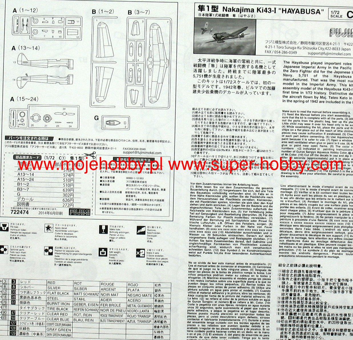 Nakajima Ki-43 Hayabusa (jap. sokół wędrowny) to japoński, jednosilnikowy myliwiec o konstrukcji metalowej, półskorupowej w układzie dolnopłata z okresu II wojny wiatowej. USAF nadało tej maszynie przydomek Oscar. Oblot prototypu miał miejsce w styczniu 1939, a wejcie do jednostek liniowych w 1941 roku. Ki-43 Hayabusa był najważniejszym i najliczniejszym myliwcem sił powietrznych armii japońskiej w toku całej wojny. W latach 1939-1945 powstały trzy główne wersje samolotu, z których każda miała kilka podwersji. Pierwsza seria produkcyjna to Ki-43-I napędzana silnikiem 950-konnym Nakajima Ha-25 lub wersjš Ha-25 Typ 99 o mocy 980 KM. Ten model Ki-43 okazał się w okresie 1941-1942 maszynš zdecydowanie górujšca nad samolotami alianckimi np. Brewster Buffalo czy P-40. Jednoczenie był powszechnie mylony ze słynnym A6M Zero. Kolejna wersja rozwojowa to Ki-43-II z nowš, mocniejszš wersjš silnika Ha-25, z prowizorycznym opancerzeniem kabiny oraz samouszczelniajšcymi się zbiornikami paliwa. Zmieniono także obrys skrzydła oraz tłumiki silnika. Jego produkcja ruszyła w 1942 roku. Ostatnia wersja to Ki-43-III, napędzany silnikiem Nakajima Ha-115-II Sakae o mocy 1230KM. Wszedł do produkcji w grudniu 1944 r. i był wykorzystywany do obrony wysp japońskich przed alianckimi nalotami oraz do misji samobójczych, jako samolot kamikaze. Wszystkie wersje Ki-43 były bardzo lubiane przez pilotów, ze względu na wietne właciwoci lotne oraz przede wszystkim wspaniałš manewrowoć. Niemal każdy as myliwski lotnictwa Armii latał w jakim momencie swej kariery na Ki-43, a co więcej odnosił na nim powietrzne zwycięstwa. Jednym z najlepszych pilotów Ki-43 był Satoshi Anabuki, który odniósł w całej swej karierze 39 pewnych zwycięstw. Dane techniczne (wersja Ki-43-II): długoć: 8,92m, rozpiętoć skrzydeł: 10,84m, wysokoć: 3,27m, prędkoć maksymalna: 548km/h, zasięg maksymalny: 1760km, pułap maksymalny 11200m, uzbrojenie: stałe- 2 karabiny maszynowe Typ 1 kal.12,7mm., podwieszane-2 bomby 30 kg lub 2 zbiorniki paliwa po 200l. Co oprócz modelu będę potrzebować do jego sklejenia?