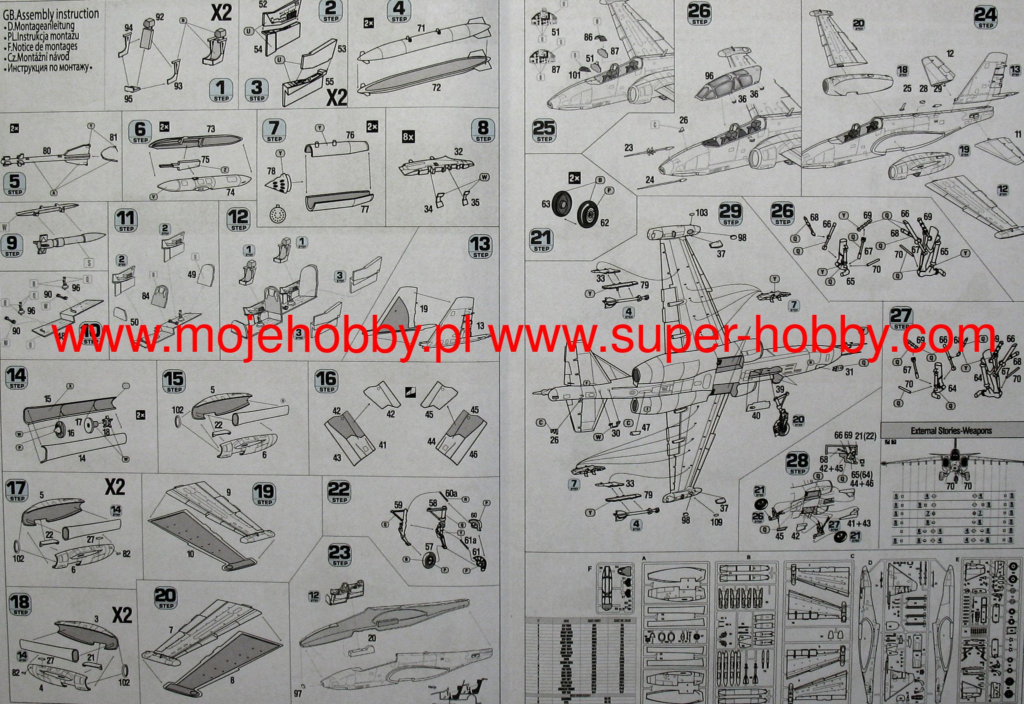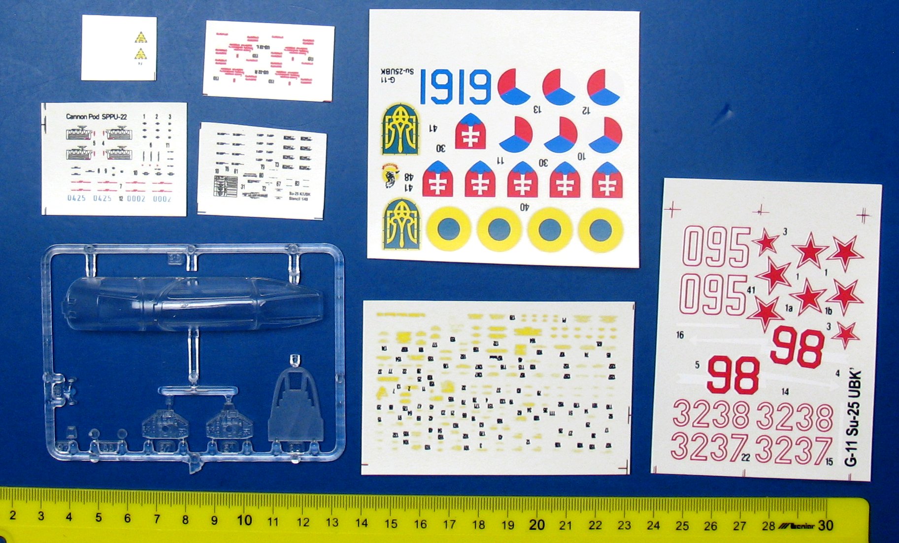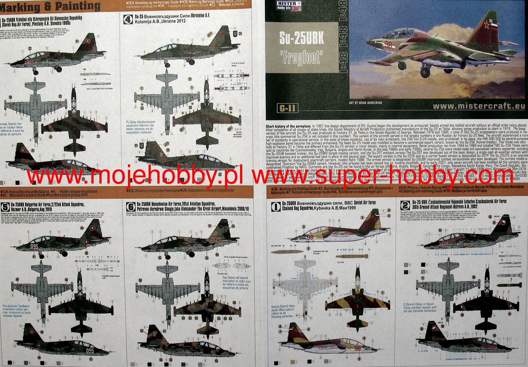 Note: Comany Mistercraft frequently changes, without any notice, the decals that come with the model, so they may differ from the photos and descriptions on our website. If you need a specific version, please let us know about that by entering the appropriate notice in the comments field when placing the order. The SU-25 combat aircraft is a single-seat, heavily armored and armed strike aircraft designed to destroy ground targets as part of active support for land forces. The flight of the prototype took place on February 22, 1975, and the machine has been in service since 1981. Two R-95Sz engines without afterburning are used as the drive. The first military conflict in which the new attack aircraft was allowed to take part was the aforementioned Soviet intervention in Afghanistan (1979-1989). Both Afghanistan and later theaters of warfare were battlefields where the SU-25S and its later versions belonging to the forces of Frontovoy Aviation and the USSR (later the Russian Federation) proved their worth in practice. In the course of combat operations, the SU-25 quickly proved its high combat effectiveness. They also usually suffered much lower losses than other types of machines involved in the conflict, largely due to their resistance to enemy fire (for comparison, according to theoretical calculations, it took about 80-100 hits with 20mm bullets to knock down the SU-25, while to shoot down, for example, SU-17M4 it was enough for 15 shots). The permanent armament of the SU-25 is the WPU-174 shooting position with the 30mm GSz-2-30 double-barreled cannon. This weapon is built in the compartment under the pilot's cabin on the left side; its rate of fire is approximately 3,000 rounds per minute, and the ammunition supply is 250 rounds. The remaining, very diverse weapons are suspended on 10 under-wing booms. The total maximum weight of the carried weapons is 4,340 kg. The most advanced type of SU-25 armament are CH-25ML and CH-29L laser-guided air-to-ground missiles. The unguided armament is 57mm to 370mm rockets (S-5 in 32-barrel UB-32 launchers, S-8 in 20-barrel B-8 launchers, S-13 in five-barrel B-13 launchers, as well as single-fired S- 24 and S-25 in O-25 containers). The SU-25 carries all classic Russian aerial bombs weighing up to 500 kg (with a maximum load it takes eight FAB-500M-62 demolition bombs). Among them, apart from standard demolition bombs, there are also anti-concrete BETAB-500 and BETAB-500ShP, ODAB-500BL, cassette RBK-500, fragmentation OFAB-250 and OFAB-100, slow fall PB-250, illuminating FOTAB-250T and SAB- 250-100 and some other types. Technical data (SU-25K version): length: 15.53 m, wingspan: 14.36 m, height: 4.8 m, maximum speed: 975 km / h, practical ceiling: 7000 m, operating range: 750 km.