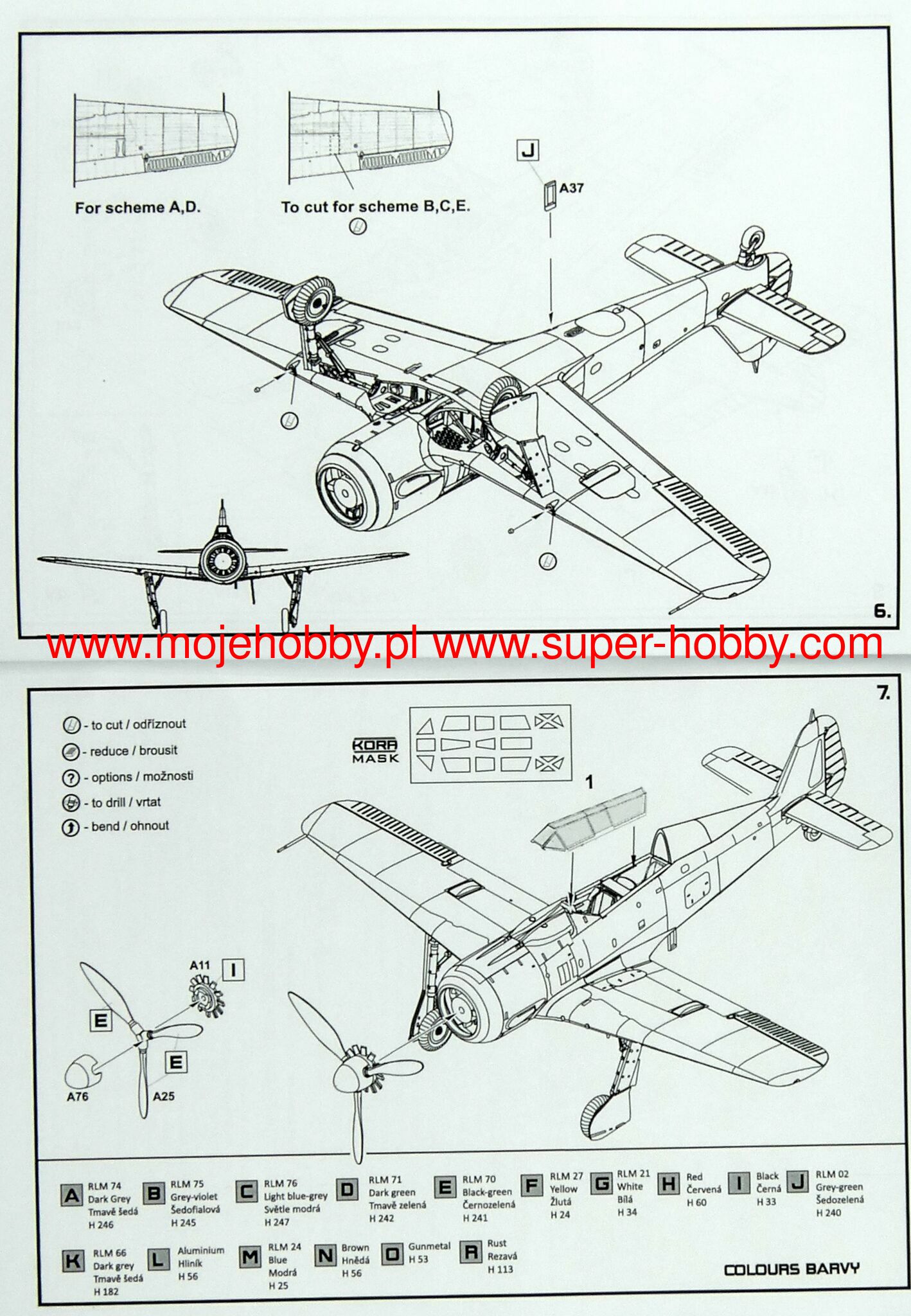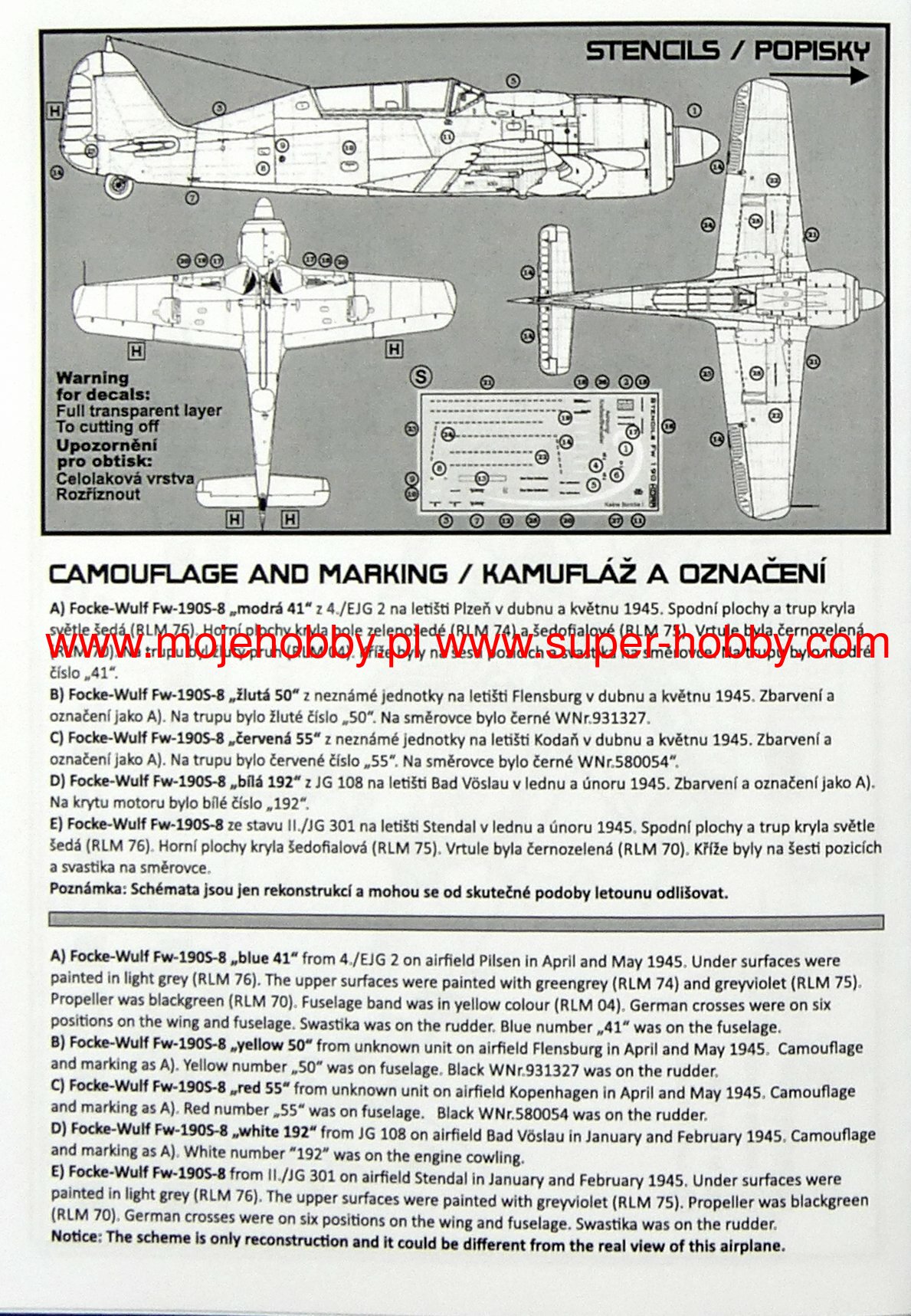 The Focke-Wulf Fw-190 is a German, single-engine, full-metal fighter aircraft with a covered cabin in the low wing design of the Second World War. The pilots considered the Fw-190 to be a better aircraft than the Messerschmitt Bf-109. A self-supporting low wing with a working Fw-190 coating was commissioned by the Luftfahrtministerium, assembled in the fall of 1937. Kurt Tank submitted two propulsion proposals - the first with a liquid-cooled Daimler-Benz DB 601 engine, and the second with the new BMW 139 radial engine. The latter was chosen, and the work started in the spring of 1938 was headed by Obering R. Blaser. The first prototype of the Fw-190V1 was ready in May 1939, and it was flown in Bremen on June 1, 1939 by Captain Hans Sander. The second prototype, the FW-190V2, armed with two MG131 and two MG17 machine guns - all 7.92 mm caliber, was flew in October 1939. To reduce aerodynamic drag, both were equipped with a tunnel air inlet in the propeller cap, but problems with overheating of the engine resulted in a return to the proven NACA shield design. Before the tests of these prototypes began for good, the decision was already made to replace the BMW 139 engine with a stronger, but longer and heavier BMW 801. It required many changes, strengthening the structure and moving the cabin back, which later became a source of problems with the center of gravity. The advantage was the removal of problems with exhaust gas permeation and overheating of the cabin interior due to its direct vicinity to the BMW 139 engine. The third and fourth prototypes were abandoned, and the Fw-190V5 with the new engine was completed at the beginning of 1940. Later, it received wings with a wingspan enlarged by one meter (from the original 9.5 m), which made it 10 km / h slower, but it increased the rate of climb and improved maneuverability. It was marked Fw-190V5g, and the variant with the shorter wing was Fw-190V5k. The first seven machines of the Fw-190A-0 information series had a short wing, the rest - a longer one. The first operational unit equipped with the Fw-190 - 6./JG 26 stationed at Le Bourget, declared its operational readiness in August 1941 and from the first meeting of the new fighter with the British Supermarine Spitfire, its advantage over them became apparent. During the war, a dozen or so versions of this great plane were created. The machines of the "A" version, along with a dozen or so modernizations, served as fighter planes. The versions marked "B" and "C" were only prototypes of high-altitude fighters intended for fighting strategic bombers, but they did not enter into serial production. The "D" variant, as the only one of the Fw-190s, was powered by the new 1750HP Jumo 213A engine and was the German response to the P-51 Mustang. The new engine extended the fuselage by several dozen centimeters. This variant also performed mainly hunting and high-altitude fighter tasks. Numerous variants of the "F" version were used as fighter-bombers as direct support of the battlefield. The "G" version played the same role as the "F" version, but had a greater range. During the entire war, over 20,000 copies of this one of the best fighters of World War II were produced. Technical data (version Fw-190A-8): length: 9m, wingspan: 10.51m, height: 3.95m, maximum speed: 656km / h, rate of climb: 15m / s, maximum range: 800km, maximum ceiling 11410m , armament: fixed-2 MG131 13mm machine guns and 4 MG151 20mm cannons (2 MG 151 / 20E cannons for the D-9 version).