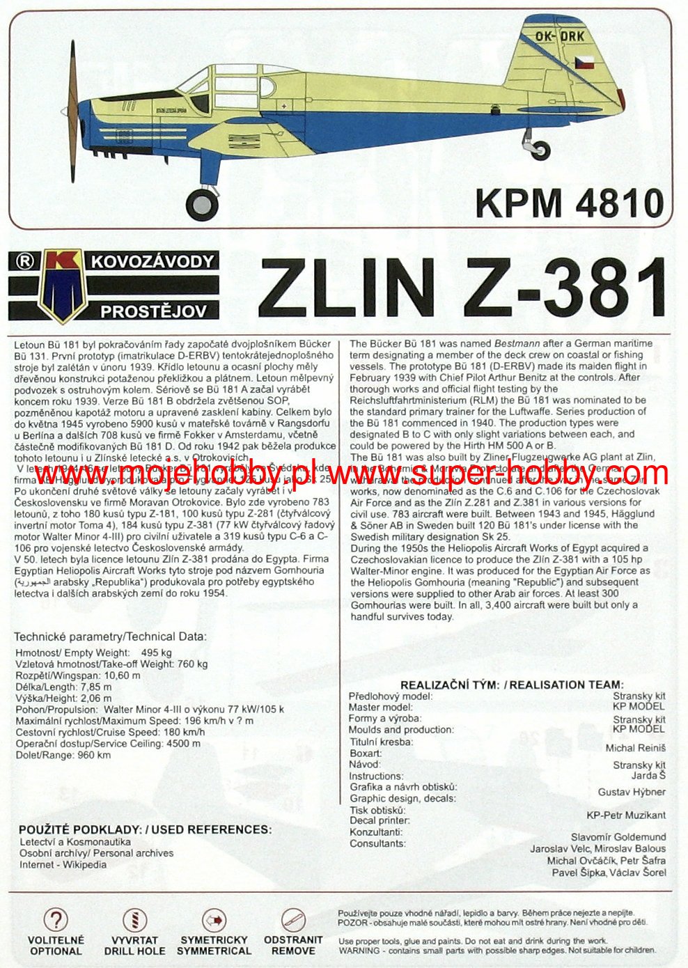 The Zlin Z-381 is a Czechoslovakian training and aerobatic aircraft from the post-war period. The machine was built in a low-wing configuration with a fixed undercarriage in a classic configuration. The length of the aircraft was 7.85 meters with a span of 10.5 meters. The drive was provided by a single Walter Minor III engine with 105 HP. The Zlin Z-381 was created as a development of the German aircraft Bücker Bü 181, which in turn was flown in February 1939 and during World War II, served as one of the basic training machines in the German air force. This aircraft, under the designation Zlin Z-181, was later produced in Czechoslovakia, where its design was also developed and modernized. The Zlin Z-381 compared to the Z-181 was primarily characterized by a different power unit, but like its predecessor, it was used for the basic training of pilots. He also served in the Czechoslovak Air Force under the designation C-106.