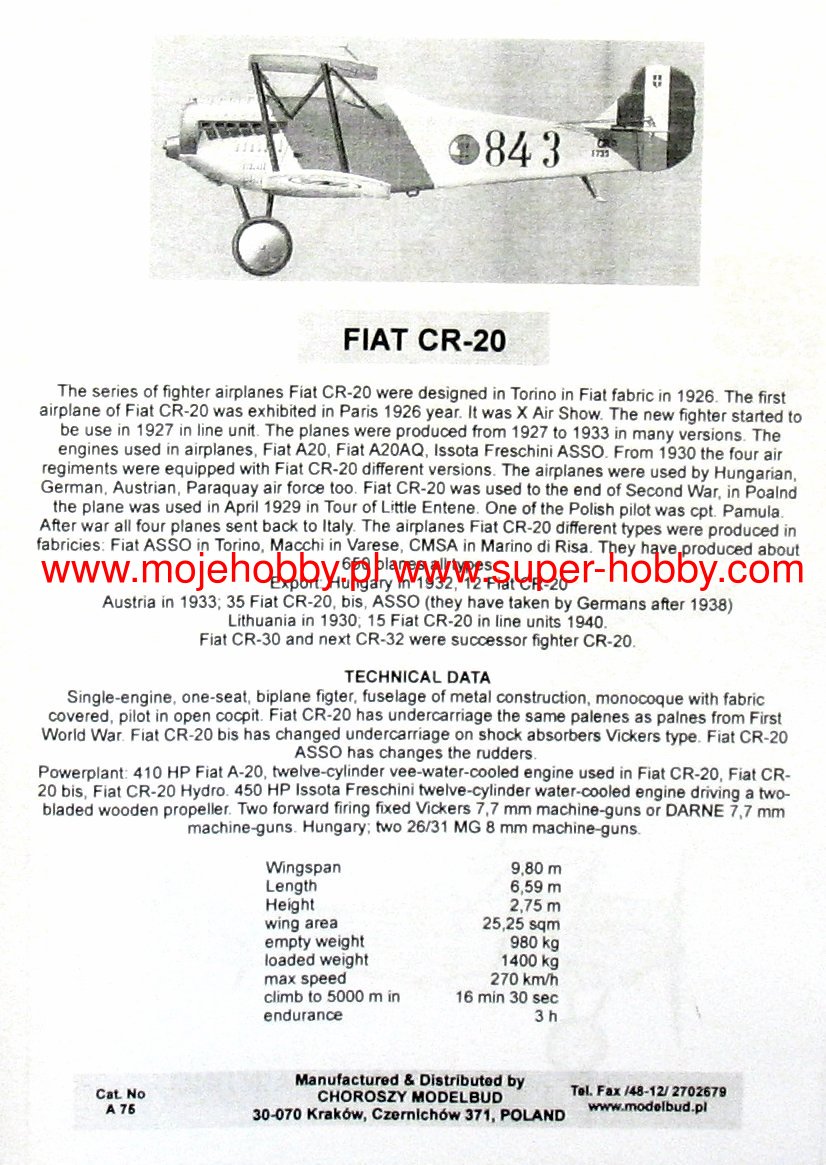 The Fiat CR.20 was an Italian fighter in a mixed biplane design with a fixed undercarriage. The drive was provided by a single engine Fiat A20 with 410 hp . The prototype flight took place in 1926. In the same year, serial production began, which led to the production of about 730 copies of the ego plane. It was armed with two 7.7 mm Vickers machine guns. The Fiat CR.20 was created as a far-reaching development of the previous fighter of the same company - the CR. 1. The new machine was more aerodynamically refined, received a more powerful engine, and its hull structure was strengthened. The Fiat CR.20 was characterized by good - for that time - performance as well as good maneuverability and maneuverability. Several versions of this aircraft were created in the course of serial production. The first was designated as Fiat CR.20 B - it was a two-seater, school version. In 1928, a version with a float undercarriage was introduced, a seaplane with the designation Fiat CR.20 Idro. In 1929, production of the Fiat CR.20 bis version with a more powerful engine and capable of flying at higher altitudes began. The plane found its way to Italian military aviation units (owned by Regio Aeronautica) from 1926. He took part in the invasion of Ethiopia in 1935-1936. It was also sold to several countries, including Austria, Spain, Paraguay and Poland.