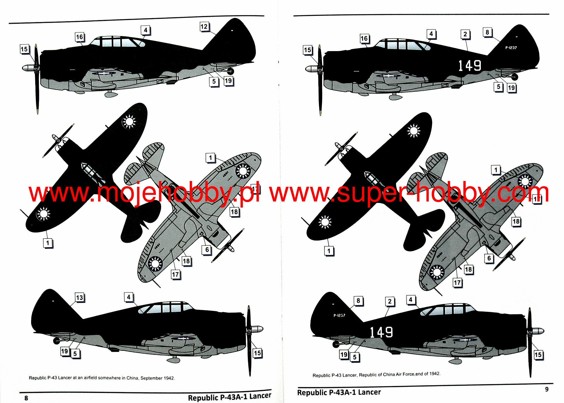 Republic P-43 Lancer was an American low-wing fighter, which was flown in 1940, and during its production (which lasted in 1940-1941), about 270 machines of this type were created. The plane, in the P-43A version, was 8.7 meters long with a wingspan of 11 meters. The drive was provided by a single Pratt and Whitney R-1830 engine with a maximum power of 1200 HP. The maximum speed was 573 km / h, with a climb speed of 13 m / s / The on-board armament consisted of 4 M2 Browning 12.7 mm machine guns. The Republic P-43 Lancer was developed for the needs of the US Air Force, then known as the United States Army Air Corps (USAAC), as a new primary interceptor. It stood in competition with prototypes, for example: P-38 Lightning or P-40 Warhawk. Interestingly, he did not come out of this fight completely defeated, because the US Air Force placed an order for the short-series production of this machine. Interestingly, despite the good performance and piloting properties and the ability to fly at high altitude, the machine was quickly recognized as unsuitable in combat and moved to the reserve or rebuilt into photographic reconnaissance planes, as well as exported to China and Australia. However, controversy continues to this day as to whether the Republic P-43 Lancer was not rejected too hastily by the USAAC. The main development version of the machine was the P-43A model, which compared to the P-43 model had better armor in the pilot's cockpit, self-sealing fuel tanks and a different version of the engine Pratt and Whitney R-1830. It was also a version with over 100 copies given to China.