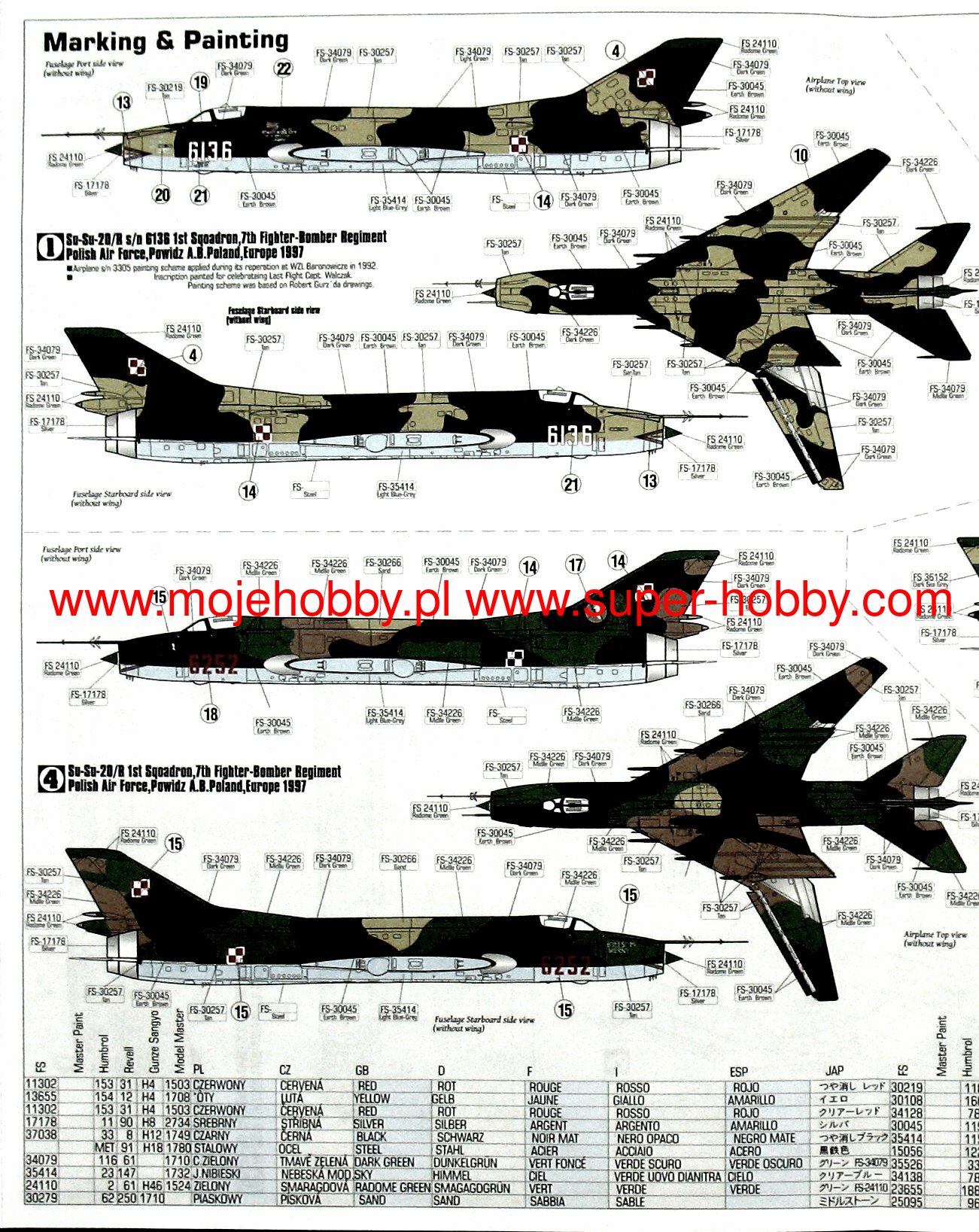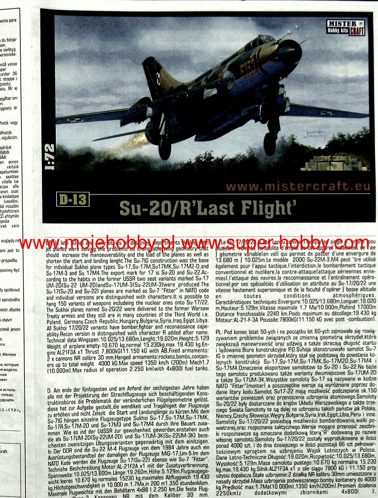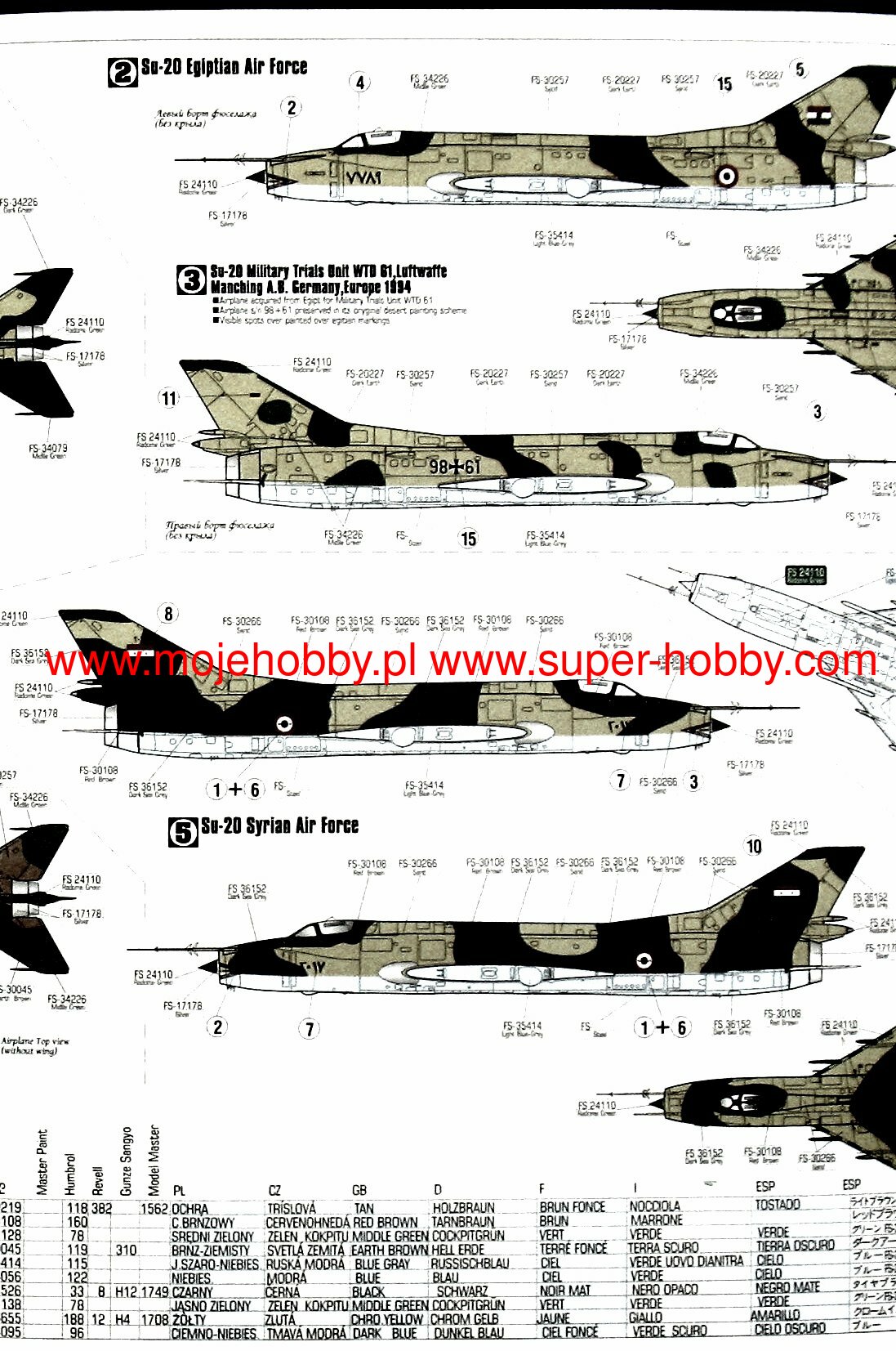 Су-20 советский истребитель-штурмовик с изменяемой геометрией крыла, экспортный вариант Су-17. Оба самолета (Су-17 и Су-20) были очень похожи друг на друга. Однако они различались используемым приводом на Су-20 применялся двигатель Лулька АЛ-21Ф. В СССР такая модернизация Су-17 получила обозначение Су-17М, который в качестве экспортного самолета обозначался как Су-20. Также был создан разведывательный вариант - Су-20Р. Эта машина была впервые продана в Польшу (с 1974 г.), где служила в составе 7-й бомбардировочно-разведывательной бригады в Повидзе. В ходе эксплуатации польская авиация адаптировала свои самолеты Су-20 для перевозки разведывательных контейнеров ККР. Технические данные: длина: 19,02м, размах крыла (со сложенными крыльями): 10,02м, высота: 5,1м, максимальная скорость: 1,7Ма, скороподъемность: 230м/с, максимальная дальность: 2250км, вооружение: стационарное - 2 НР-30 30-мм орудия, подвесные до 4070 кг груза.Примечание: Mistercraft часто меняет наклейки, поставляемые с моделями, без предварительного уведомления, и они могут отличаться от фотографий и описаний на нашем веб-сайте. Если вам нужна конкретная версия, сообщите нам об этом, введя соответствующий комментарий в поле для комментариев при размещении заказа.