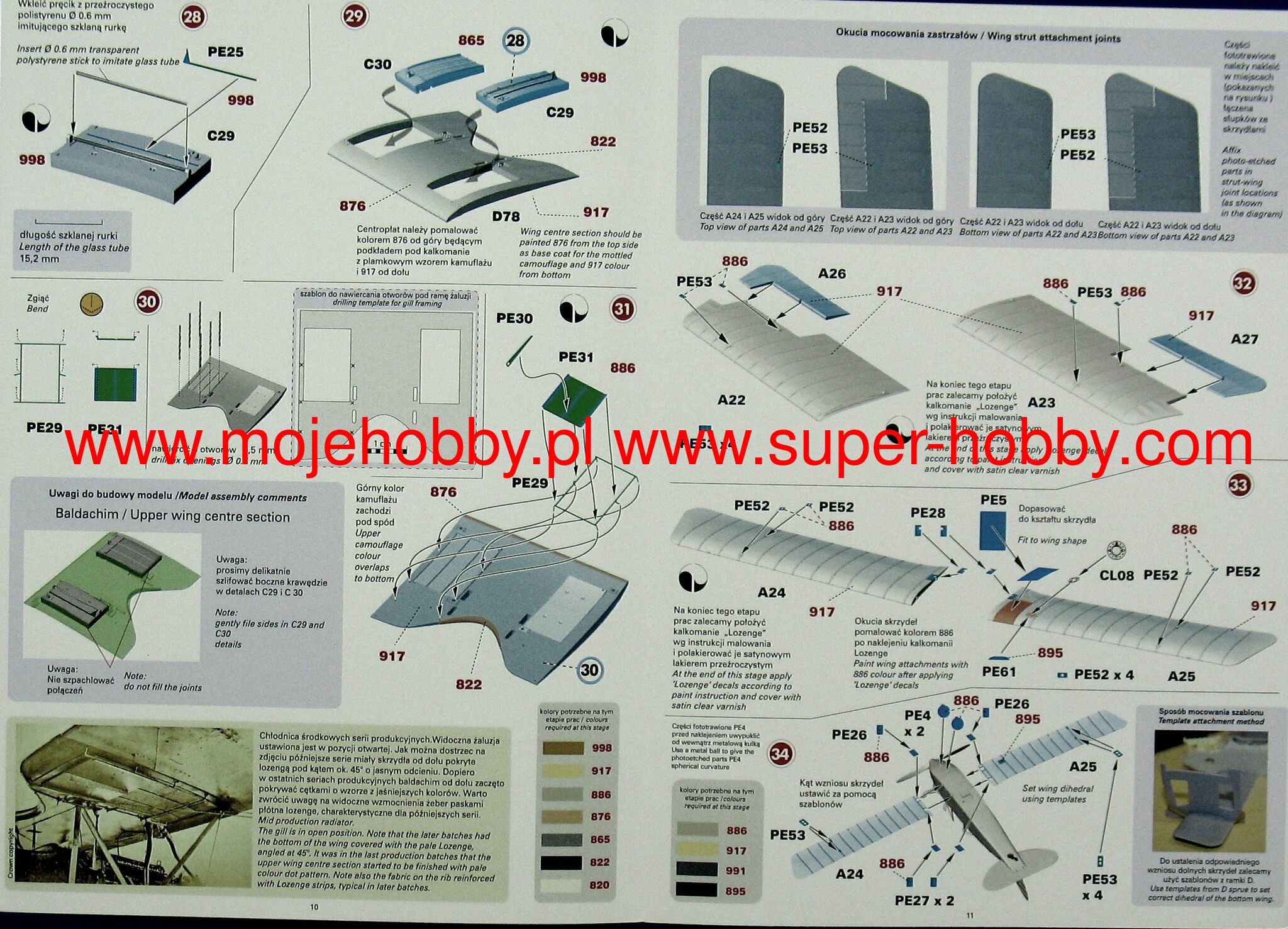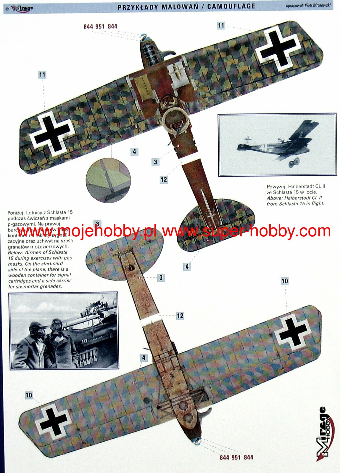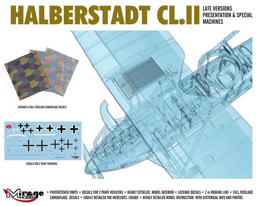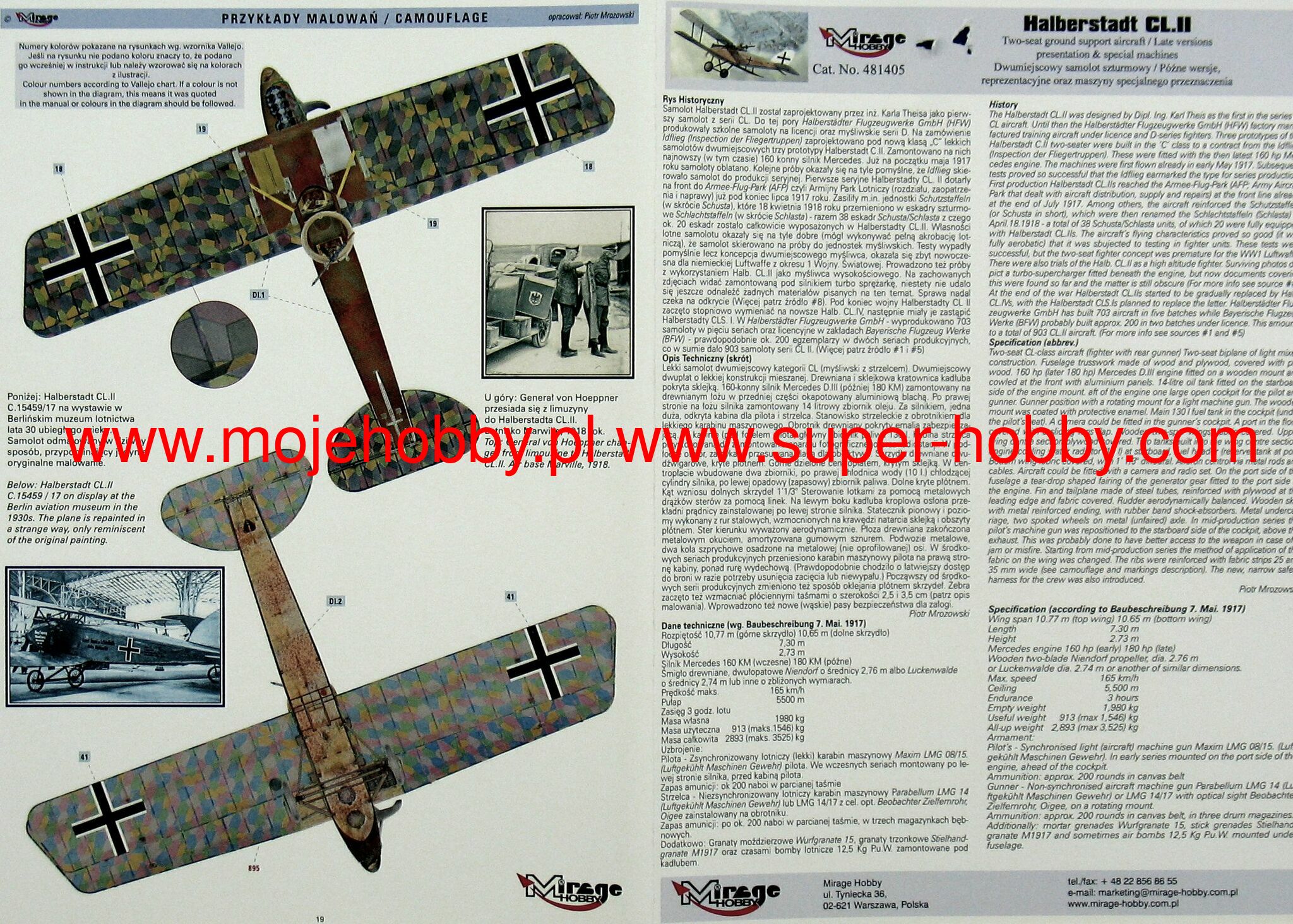 Download Mirage Hobby PDF catalogueThe Halberstadt CL.II is a German biplane, two-seater reconnaissance and fighter aircraft of a mixed, half-shell structure from the First World War. The drive was a Mercedes D.III engine with a power of up to 160 HP. The plane was designed by engineer Karol Theiss in 1916, and at the beginning of the next year a prototype flight took place. Halberstadt CL.II entered line service in August 1917. It turned out to be a very successful design, it was characterized by great maneuverability, good rate of climb and a wide field of fire. On the battlefield, the plane served in the Schlachtstaffelen units, which were responsible for direct support of the land forces. He performed very well in this role, an excellent example of which is his role in the German counteroffensive during the Battle of Cambrai (November 30, 1917). In total, 900 Halberstadt CL.II aircraft were built during the war. Technical data: length: 7.3 m, wingspan: 10.77 m, height: 2.75 m, maximum speed: 165 km / h, climb speed: 3.3 m / s, maximum ceiling 5090 m, armament: fixed-2 machine guns 7 , 92mm, suspended - up to 50 kg of bombs.