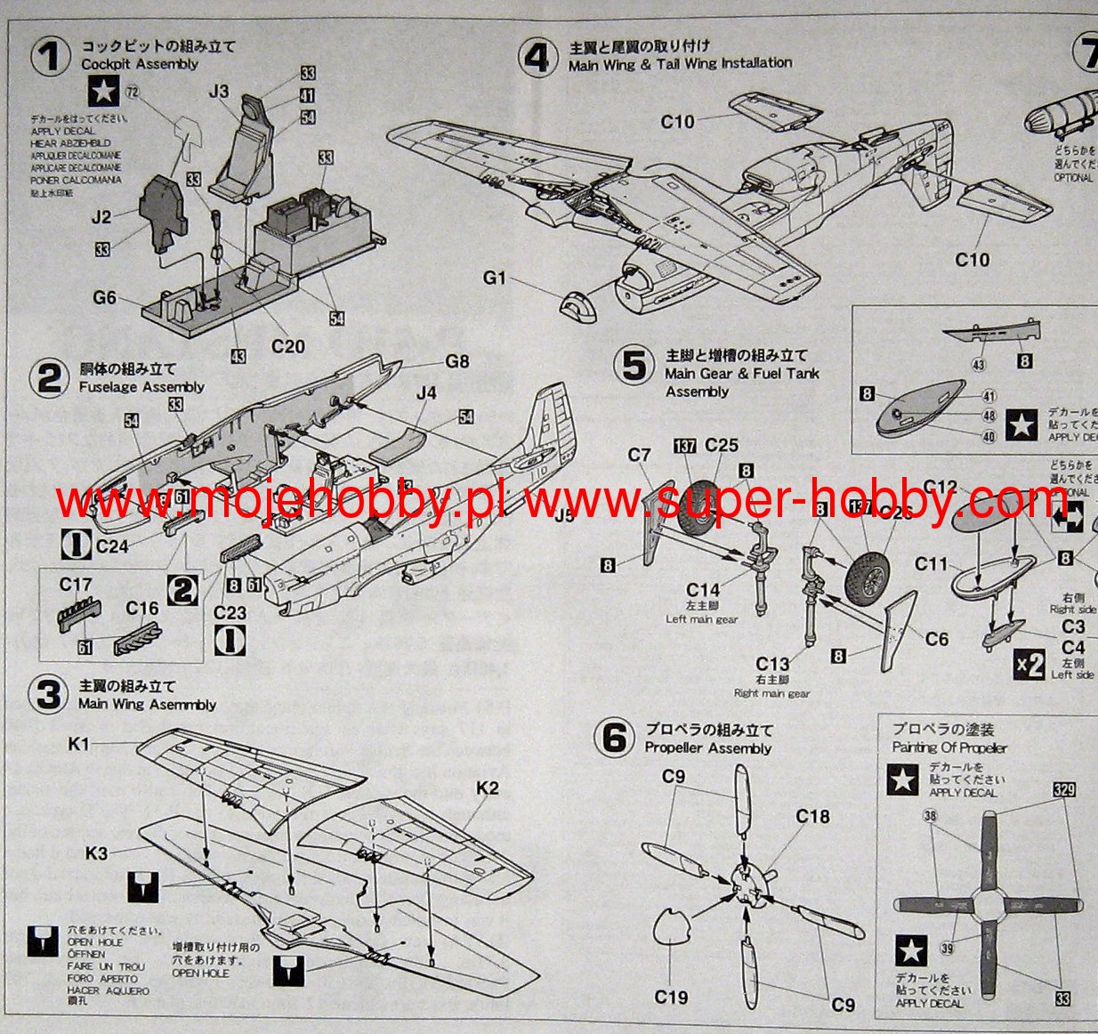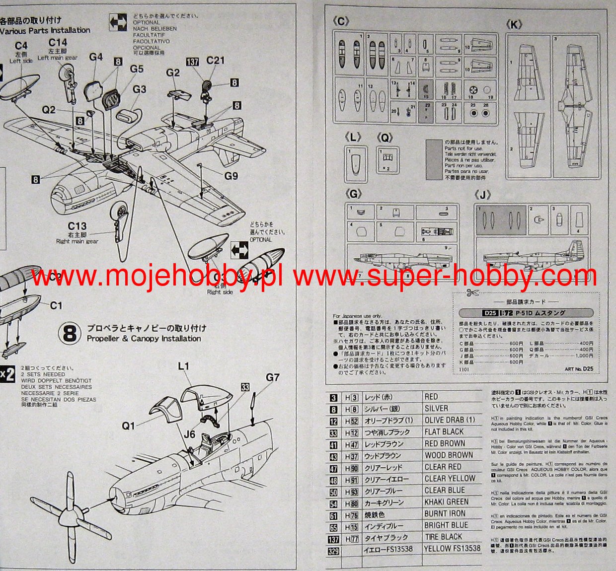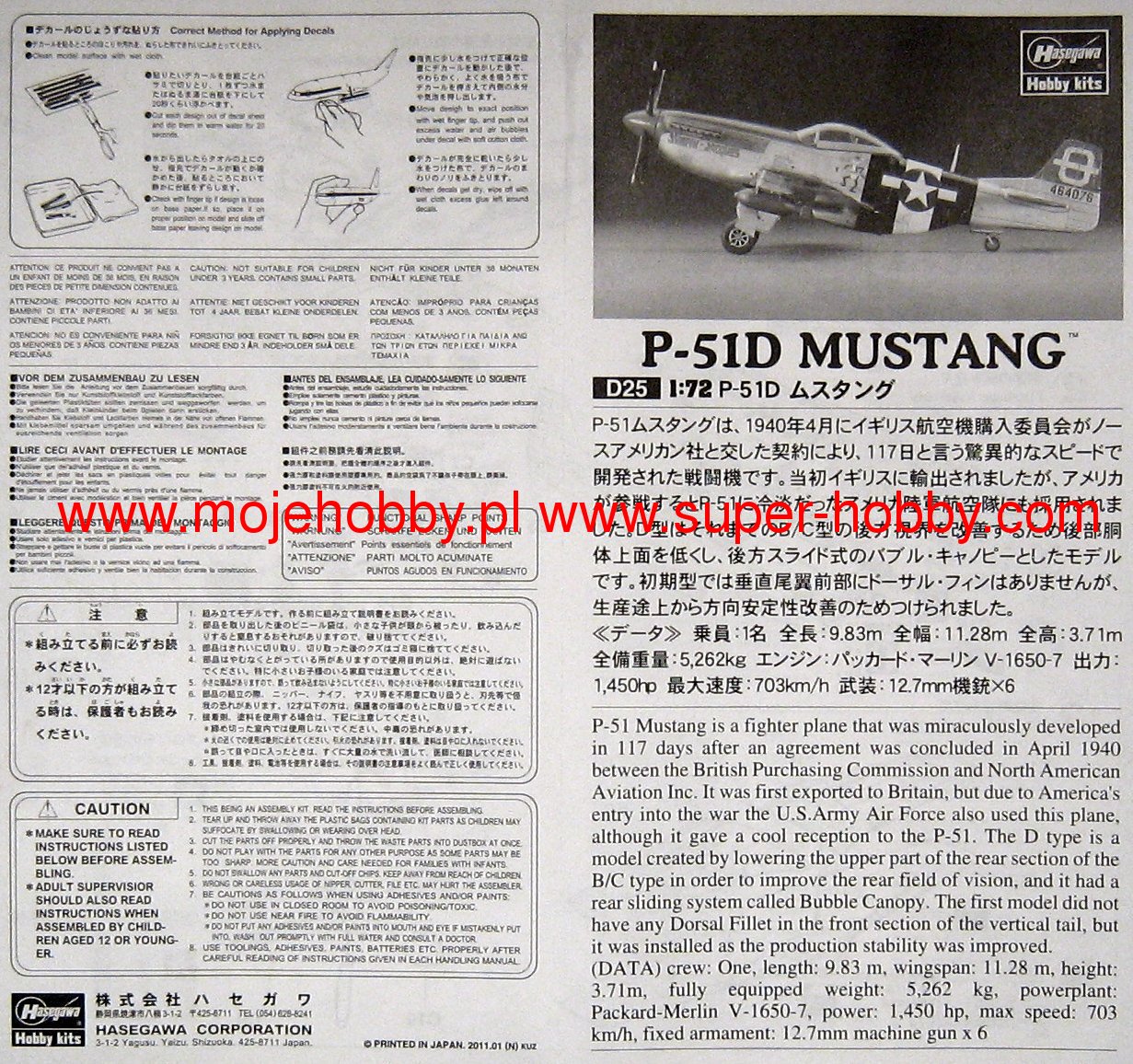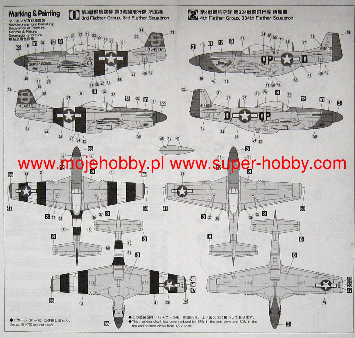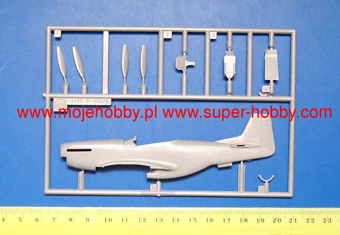 The North American P-51 Mustang is an American, single-engine, long-range fighter and attack aircraft with a classic tail and all-metal construction. The flight of the prototype took place on October 26, 1940. The P-51 Mustang has earned a reputation as one of the best, if not the best, WWII fighter. Replacing the Allison V-1710-39 engine from the first project with a Rolls-Royce Merlin motor (P-51 Mustang Mk.Ia version) made the Mustang, like never before, reached perfection. The single-seat fighter impressed with its maximum speed, range, maneuverability, and powerful weapons. The combination of all the most important parameters for the assessment of the aircraft made the Mustang prove itself in virtually every role entrusted to it: it gained air superiority, escorted, carried out reconnaissance missions, attacked ground targets. The class of design is evidenced by the fact that the Mustang remained in active service until the 70's! One of the most important versions was the P-51D, based on the P-51B. It received a drip cab fairing, ensuring excellent visibility, and a new engine - Packard V-1650-7, which significantly improved performance. Technical data (P-51D version): length: 9.83m, wingspan: 11.28m, height: 4.08m, maximum speed: 703km / h, rate of climb: 16.3m / s, maximum range: 2755km, ceiling practical: 12800m, armament: fixed - 6 12.7mm M2 machine guns, suspended - up to 908 kg of bombs or 10 127mm HVAR rocket launchers.