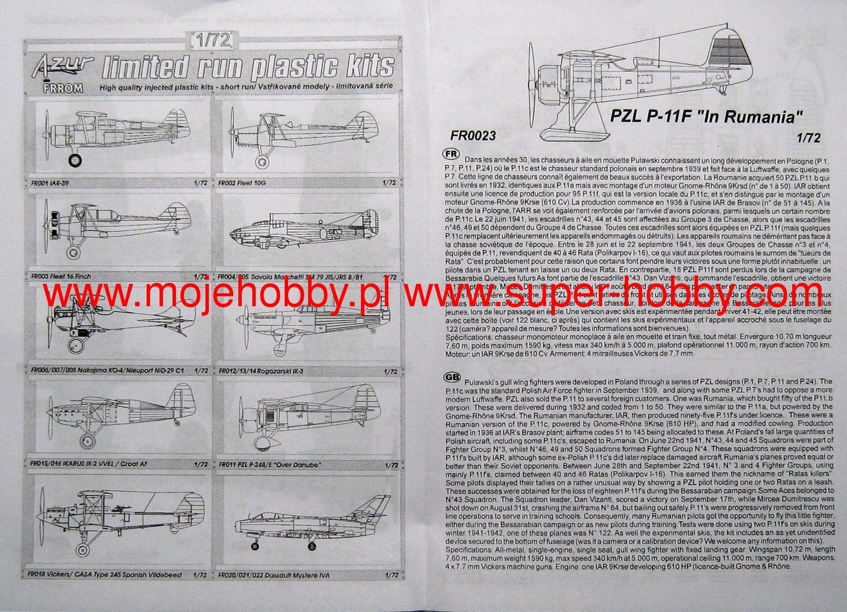 The PZL P.11a (the so-called eleven) is a Polish, single-engine fighter plane with a metal structure with Puławski wings, a classic tail and a fixed landing gear. The flight of the prototype took place in 1931, but serial production continued in 1937-1939. The first serial version is the PZL P.11a powered by the Bristol Mercury IV S2 engine with a power of 550 HP. However, it was treated as a transitional version and only 50 were ordered. The most famous version of the "eleven" - PZL P.11c - appeared in the summer. It had an improved fuselage, wings and a vertical stabilizer. It all improved the aerodynamics of the plane. The drive unit has not changed. The interest in the construction was expressed by, among others, Romania, where 95 units of the licensed PZL P.11 were manufactured at the IAR plants. At the outbreak of the war, all versions of the P.11 were much slower than their German opponents, but at the same time had greater maneuverability, high rate of climb and a less emergency engine than German planes. They had many victories over the enemy during the September campaign, mainly as part of the Pursuit Brigade. Technical data (version P.11c): length: 7.55m, wingspan: 10.72m, height: 2.85m, maximum speed: 367km / h, rate of climb: 14.5m / s, maximum ceiling: 8000m, range maximum: 550 km, armament: fixed - 2 machine guns wz.33 cal.7.92 mm.