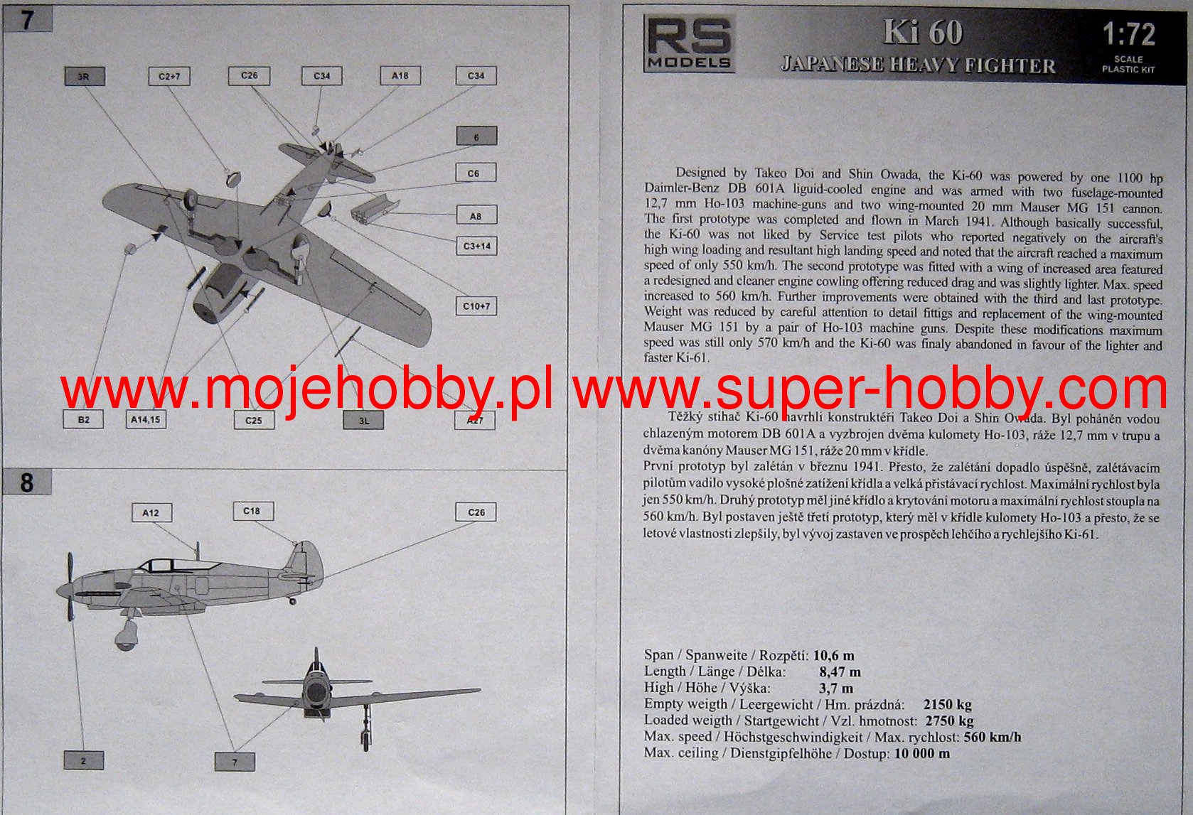 Kawasaki Ki-60 był japońskim, prototypowym samolotem myśliwskim w układzie dolnopłata, o konstrukcji metalowej, z okresu II wojny światowej. Napęd zapewniał pojedynczy silnik rzędowy Kawasaki Ha-40 o mocy do 1100 KM. Był to zmodyfikowany, licencyjny silnik DB-601A. Oblot prototypu miał miejsce w marcu 1941 roku. Maszyna nigdy nie weszła do produkcji wielkoseryjnej. Uzbrojenie pokładowe składało się z czterech karabinów maszynowych Ho-103 kal. 12,7 mm. Projekt Kawasaki Ki-60 powstał jako owoc doświadczeń wyniesionych przez lotnictwo Armii japońskiej z wojny ze Związkiem Radzieckim z lat 1938-1939. W toku tego konfliktu japońscy piloci zetknęli się z działaniem radzieckich myśliwców, które wykorzystywały swoją przewagę prędkości i nie wdawały się w walkę kołową. Była to nowinka taktyczna, do której japońskie myśliwce nie były raczej przygotowane. Zrodziło to konieczność opracowania nowego myśliwca. W jego budowie wykorzystano nieznacznie zmodyfikowany i produkowany licencyjnie silnik Daimler-Benz DB-601A, wprowadzono silne jak na standardy japońskie uzbrojenie pokładowe oraz bardzo solidną konstrukcję płatowca. Jednak nowy myśliwiec, czyli Kawasaki Ki-60 okazał się konstrukcją nieudaną. Cechował się prędkością maksymalną mniejszą niż zakładana, słabą statecznością w locie poziomym oraz była bardzo trudna w pilotażu. Pomimo wprowadzenia poprawek wad tych nie udało się ostatecznie wyeliminować co spowodowało anulowanie całego projektu. Powstały jedynie trzy egzemplarze prototypowe myśliwca Kawasaki Ki-60. Co oprócz modelu będę potrzebować do jego sklejenia?
