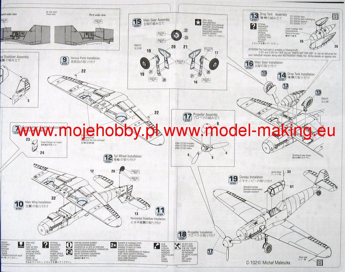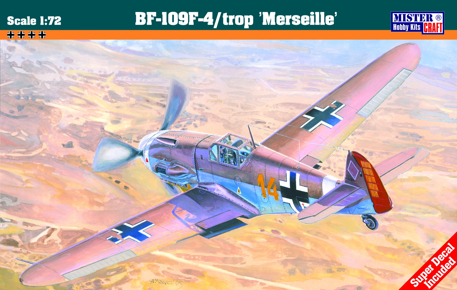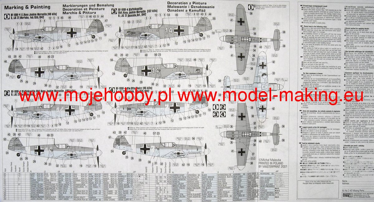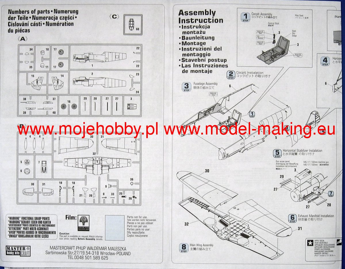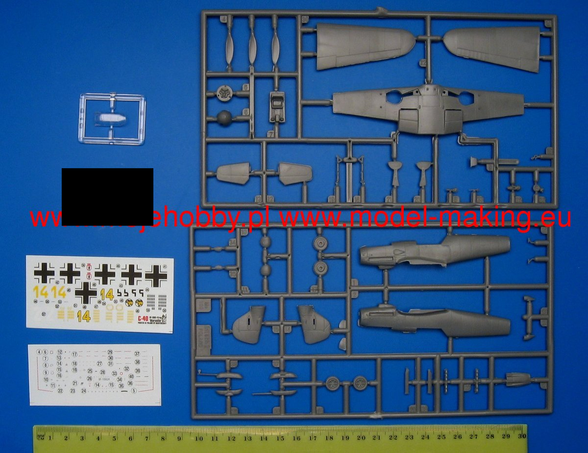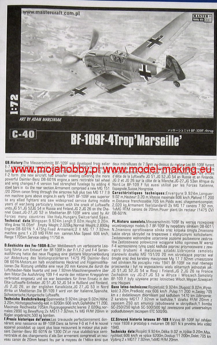 Note: Comany Mistercraft frequently changes, without any notice, the decals that come with the model, so they may differ from the photos and descriptions on our website. If you need a specific version, please let us know about that by entering the appropriate notice in the comments field when placing the order. The Messerschmitt Bf-109 is a German metal-structure single-engine fighter in a low wing configuration with a classic tail. It turned out to be the basic and most produced Luftwaffe fighter during World War II. The flight of the prototype took place on May 29, 1935, and serial production continued in the years 1936-1945. In total, it is estimated that a total of about 35,000 Messerschmitt Bf-109 fighters of all varieties were produced, many of which ended up in the Czech and Israeli air forces after the war. The roots of the Bf-109 go back to the competition announced in 1933 by the Luftwaffe for a new fighter plane. In competition with the He-112, the Bf-109 project initially lost, but thanks to Willie Messerschmitt's intrigues, the project could continue and eventually he was the winner of the competition, becoming the Luftwaffe's primary fighter. Several main variants of the Bf-109 were developed in the course of production. The first pre-production series was the Bf-109B (Berta) with different versions of the Junkers Jumo 210 (A or Da) engine. They were tested in Spain from 1937 during the Civil War. The next version is the Bf-109C (Caesar). They had a different engine than the B version, and extensive armament consisting of two 20mm and 2 HP 7.92mm cannons. These machines also fought in the skies of Spain. The third version is the Bf-109D (Dora) with the Junkers Jumo 210 Da or Daimler-Benz DB 600 engine. It fought in the September campaign, but at the turn of 1939/1940 it was replaced by the E version. The most famous model was the Bf-109E (Emil) with a Daimler-Benz 601A or N engine. It was the first to use a three-blade, not a two-blade propeller. Bf-109E fought in the French campaign, over England, and in North Africa and on the Eastern Front. The ace who started his career on the Bf-109E was the famous Adolf Galland. The next version is the Bf-109F (Friedrich), which, according to the German pilots, was the most aerodynamically perfect. It sowed the changed shape of the fuselage, wings, cabin fairings, but no new engine was used. It was put into service at the turn of 1940/1941. As part of the development of the design, further Bf-109 specifications were developed, of which the G (Gustav) version was produced in the largest number of copies. The most important change increasing the machine's performance was the installation of a new 12-cylinder Daimler-Benz DB605A engine with 1475HP. The armament of the Bf-109G was a pair of 13mm machine guns located in the fuselage in front of the cockpit fairing, and the MG151 20mm or heavier MK108 30mm cannon. The last mass-produced version was the Bf-109K (Kurfirst), which production started in October 1944. A Daimler-Benz DB 605DB or DC unit was used as the engine. The Bf-109K was the fastest version produced during World War II, reaching up to 730 km / h. Apart from that, two versions were created - H and Z, but they were rather experimental versions and their mass production did not start. Subsequent improvements in propulsion and armament made the Messerschmitt Bf-109 one of the most dangerous fighters of World War II, and at the same time showed the great potential of the slightly angular airframe created by Willi Messerschmitt. Technical data (version Bf-109 G-6): length: 8.95 m, wingspan: 9.92 m, height: 2.6 m, maximum speed: 640 km / h, rate of climb: 17 m / s, maximum range: 850 km, maximum ceiling 12000m, armament: fixed - 2 MG131 13mm machine guns and 1 MG151 20mm cannon, suspended - 250 kg bombs, or 2 Wfr missile launchers. Gr. 21.